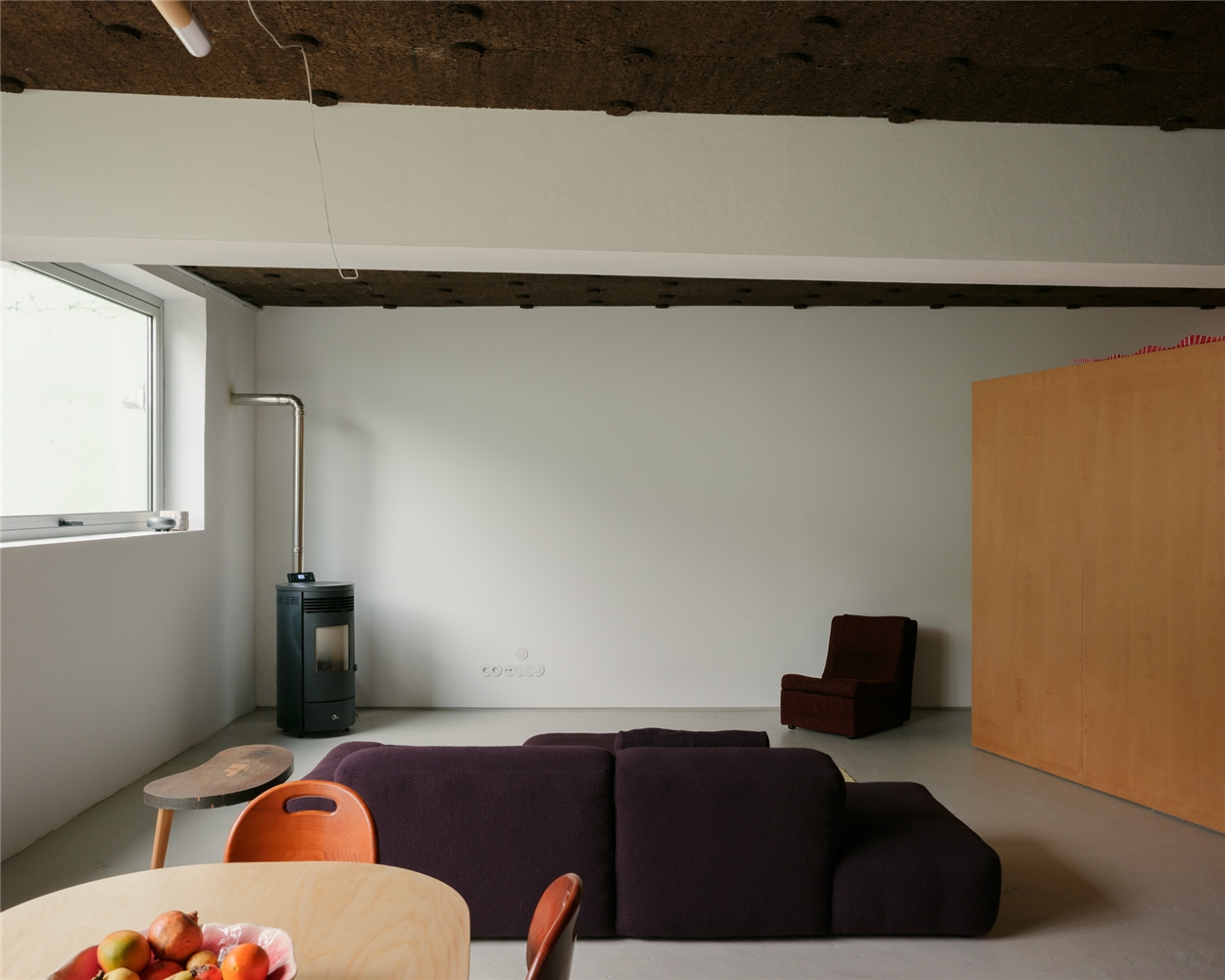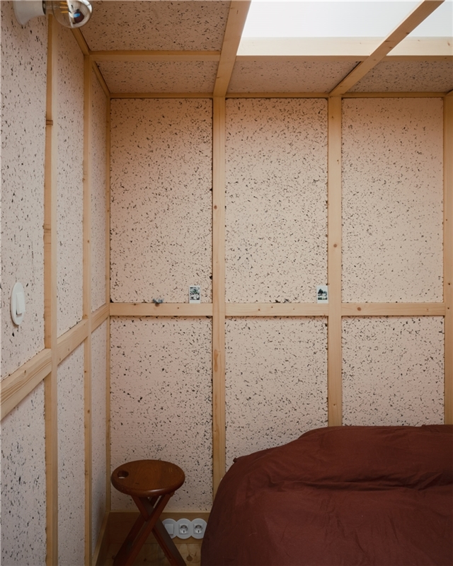 Además de estas pequeñas reparaciones, el proyecto consistió en diseñar únicamente dos cajas de madera inspiradas en las camas-caja medievales: realizadas con pino doméstico, tableros de MDF y paneles de corcho. Situadas bajo las claraboyas existentes, estas cajas aseguran una última capa de privacidad y confort para quienes habitan en esta suerte de campamento, cuyo fuego queda simbolizado por una nueva estufa de leña.