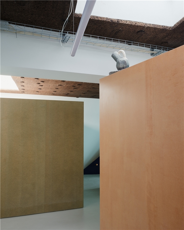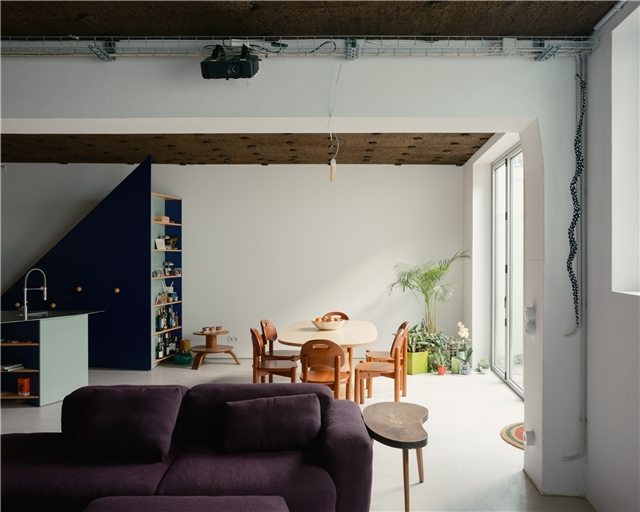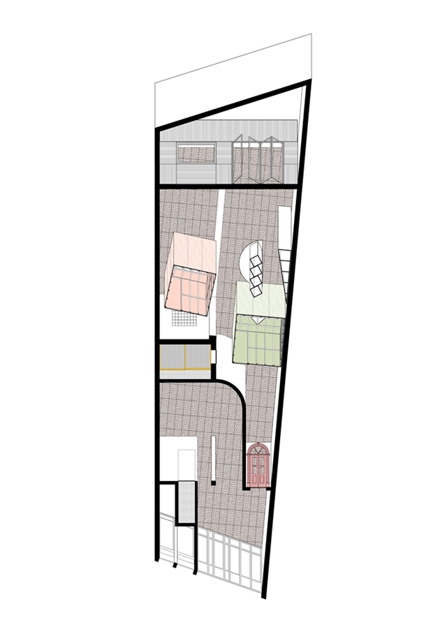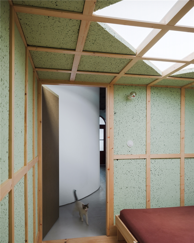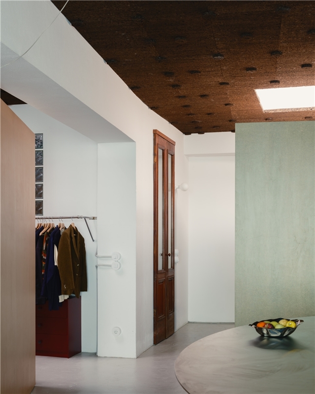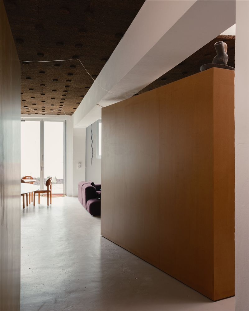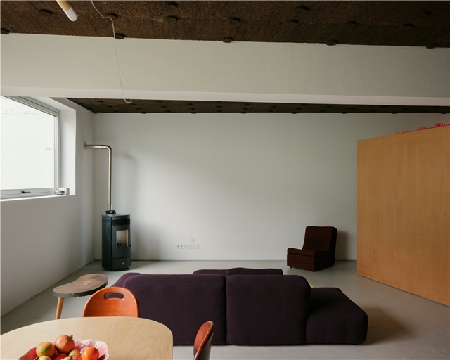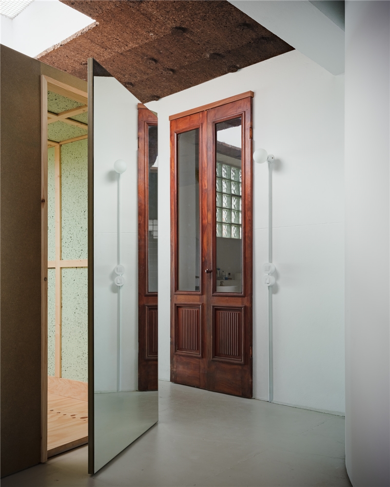 El programa solo requería dividir el espacio en dos, entre trabajo - con vistas a la ciudad - y vivienda - con vistas a un pequeño patio, diseñado por pomo. La curva del muro que traducía esta solicitud acentúa la sensación de recogimiento para quienes ahora descubren la casa a través de un laberinto. El baño existente fue reformado. La intervención en el suelo, las paredes y los techos fue mínima. Consistió principalmente en el aislamiento térmico y acústico (mediante corcho visto), así como en la sustitución de las carpinterías para garantizar una adecuada eficiencia energética. Pintarlas fue una petición de los clientes.