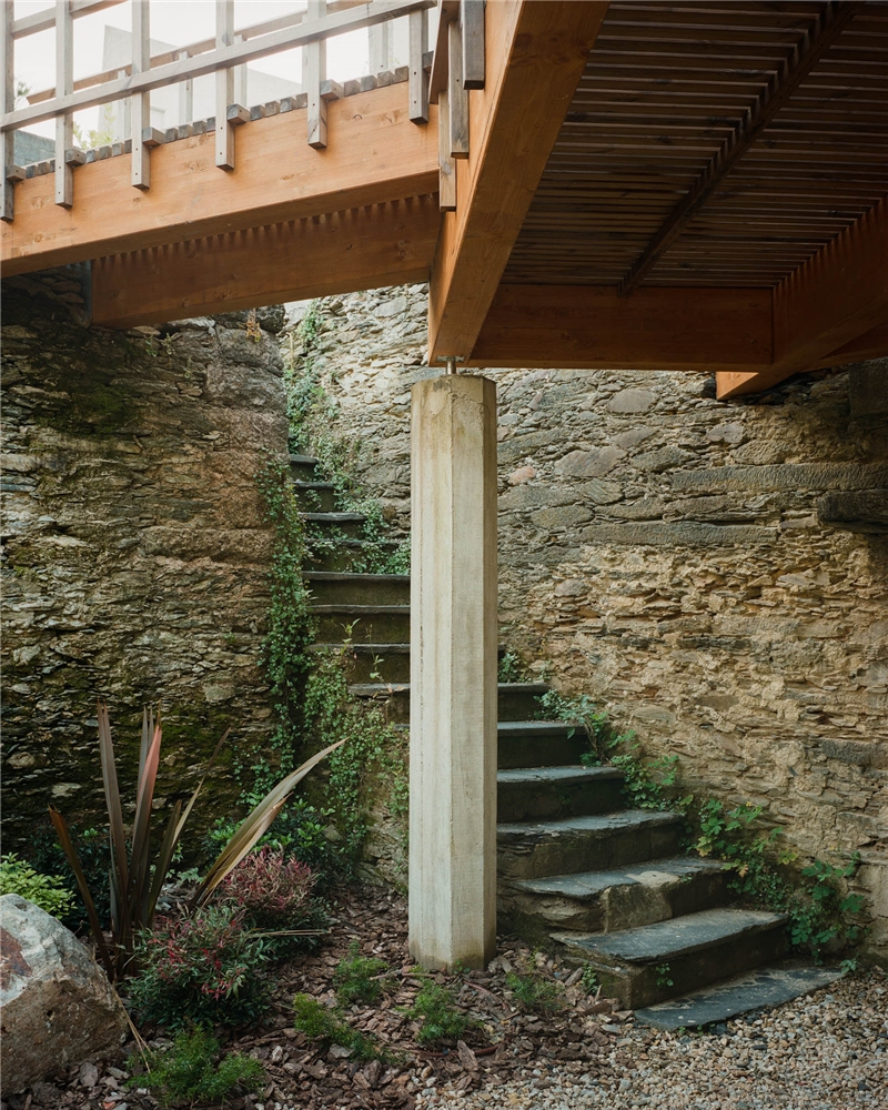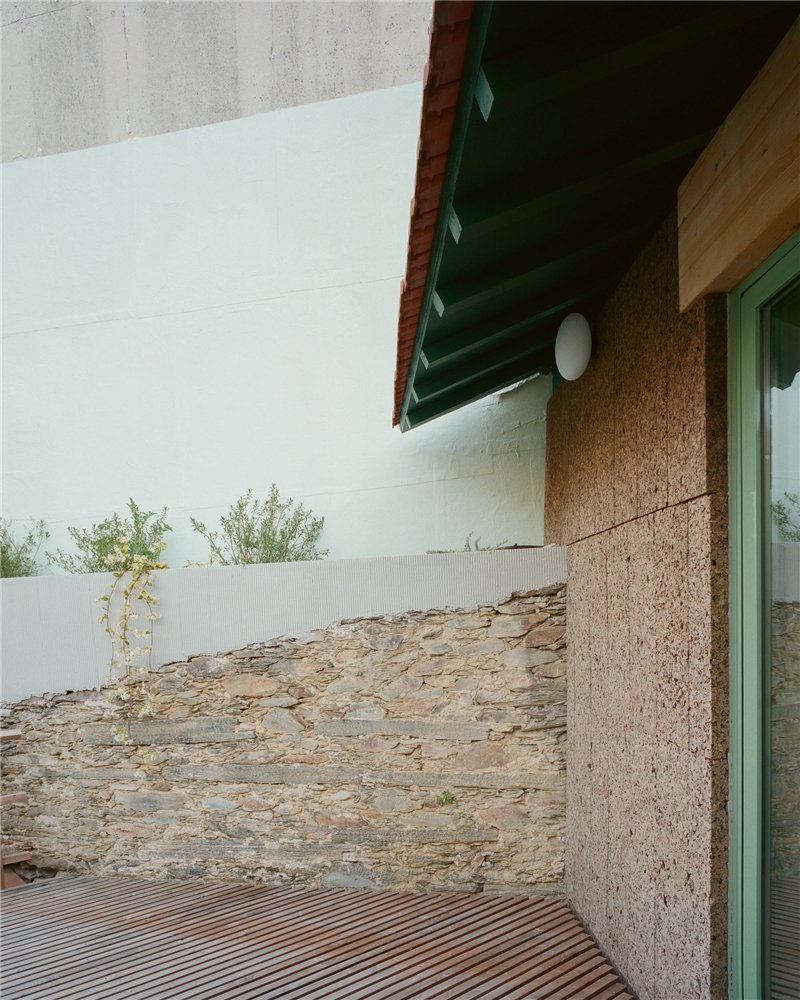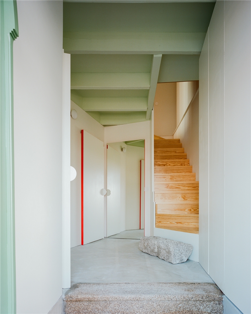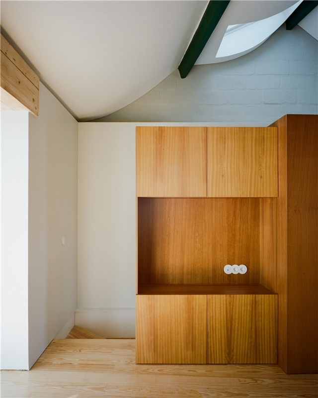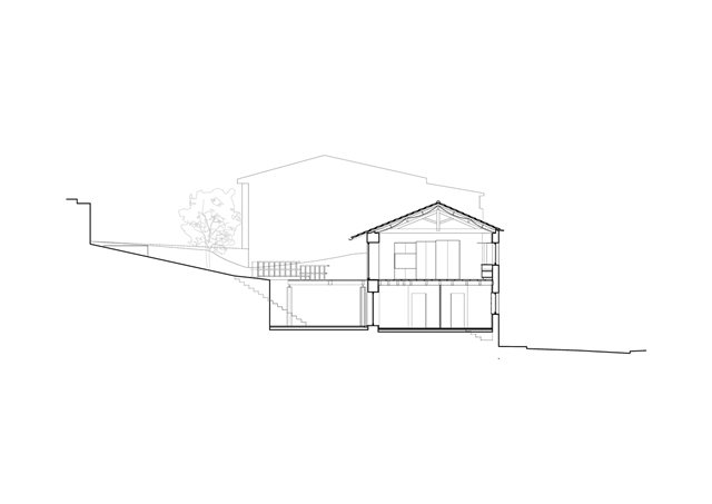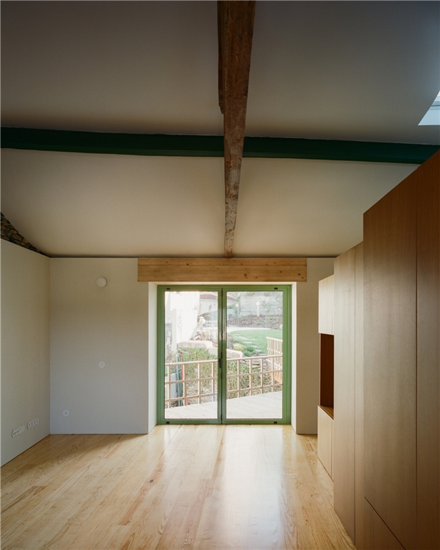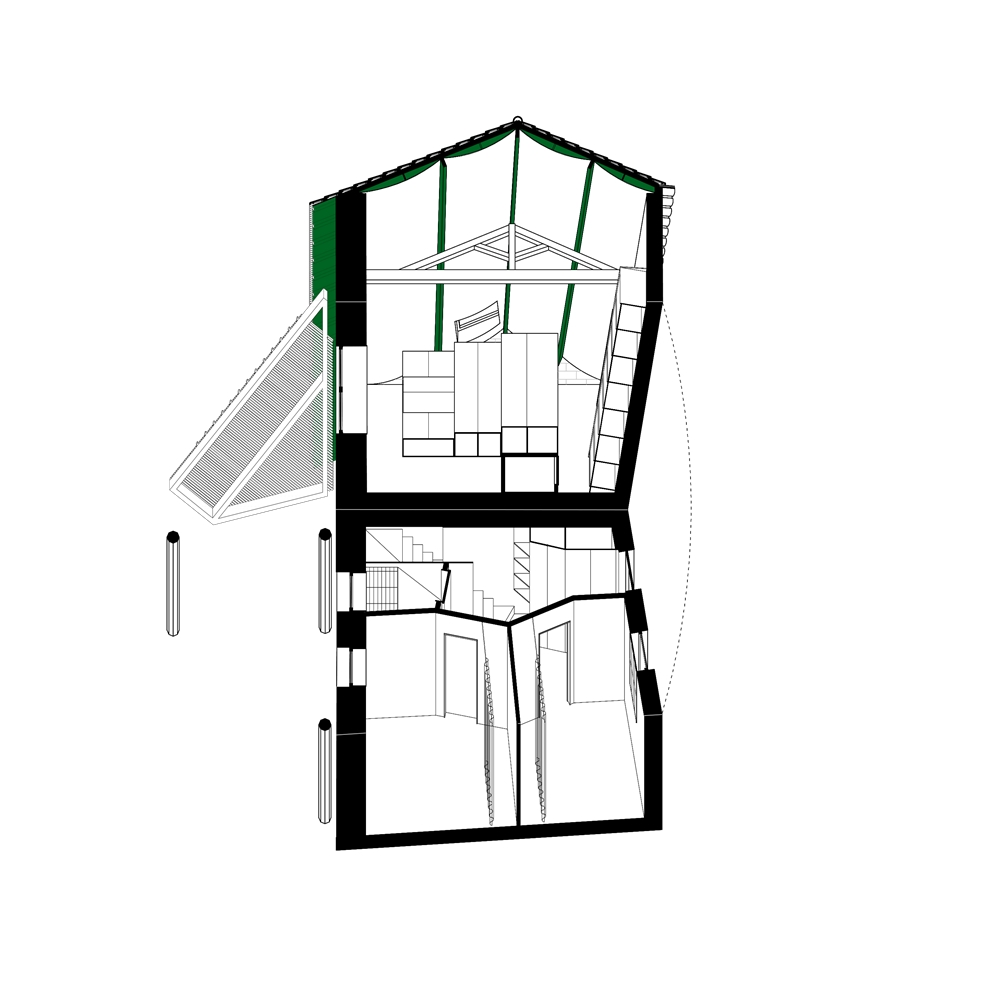 En la parte posterior, una escalera paralela al muro medianero era todo lo que quedaba de la estructura original. Aparte de ella, solo existían los muros de piedra y una estructura de madera - forjado y cubierta - ambos en relativamente buen estado. La escalera era frágil, pero su ubicación insólita sirvió como pista. Debido a su precariedad, fue sustituida. Los demás elementos se conservaron y revalorizaron a través del nuevo diseño. Las maderas existentes fueron pintadas, lo que permitió su mantenimiento con sustituciones sutiles y aseguró una lectura continua del espacio. Se añadió muy poco. En el nivel inferior, algunos tabiques ligeros delimitan las nuevas habitaciones, todas de tamaño similar. Arriba, un núcleo infraestructural compacto oculta las instalaciones técnicas de la vivienda. La cercha existente descansa ahora sobre una nueva y robusta viga de madera, lo que permitió abrir una ventana alta con vistas al jardín. Una ligera terraza de madera garantiza una conexión fluida entre los espacios.