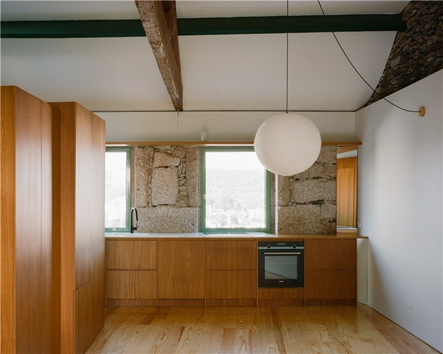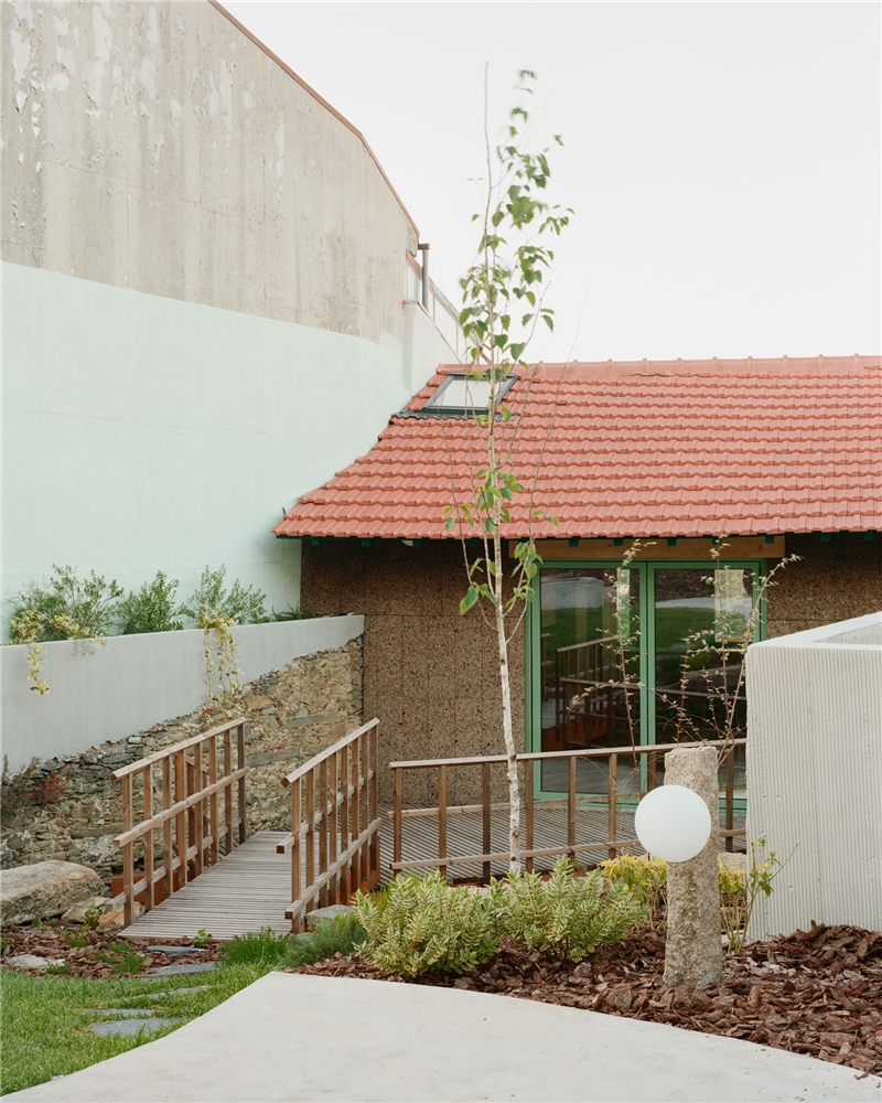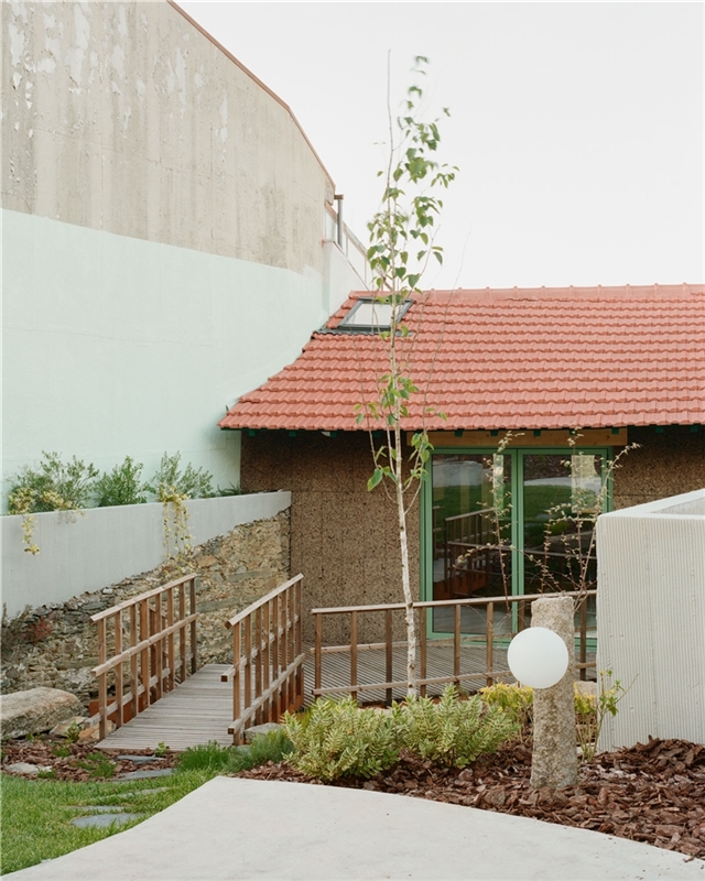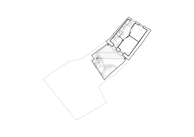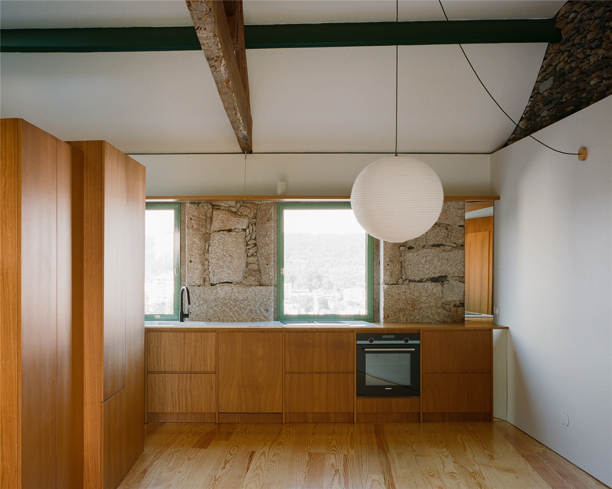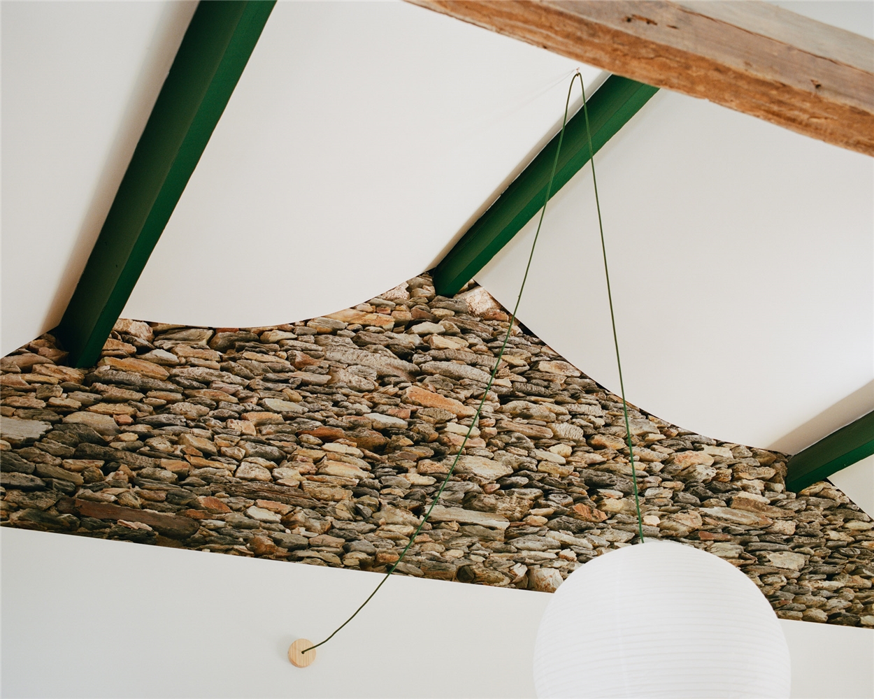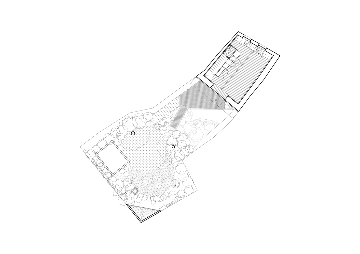 En la parte posterior, una escalera paralela al muro medianero era todo lo que quedaba de la estructura original. Aparte de ella, solo existían los muros de piedra y una estructura de madera - forjado y cubierta - ambos en relativamente buen estado. La escalera era frágil, pero su ubicación insólita sirvió como pista. Debido a su precariedad, fue sustituida. Los demás elementos se conservaron y revalorizaron a través del nuevo diseño. Las maderas existentes fueron pintadas, lo que permitió su mantenimiento con sustituciones sutiles y aseguró una lectura continua del espacio. Se añadió muy poco. En el nivel inferior, algunos tabiques ligeros delimitan las nuevas habitaciones, todas de tamaño similar. Arriba, un núcleo infraestructural compacto oculta las instalaciones técnicas de la vivienda. La cercha existente descansa ahora sobre una nueva y robusta viga de madera, lo que permitió abrir una ventana alta con vistas al jardín. Una ligera terraza de madera garantiza una conexión fluida entre los espacios.