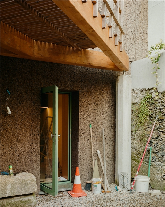 Los planos de ejecución fueron mínimos. La disposición espacial se mantuvo, pero la colaboración lenta y cercana con los constructores permitió una serie de momentos improvisados que nunca habrían sido previsibles en el diseño original. En el exterior, se encuentra una fachada de corcho, tres columnas octogonales de hormigón vertidas con encofrados recuperados, un depósito de agua de hormigón y un muro espejado que refleja el hermoso jardín diseñado por pomo landscapes. Como el propio proyecto, la casa es pragmática y honesta. Una especie de cabaña primitiva urbana, concebida como casa de vacaciones, pero pensada para ser habitada durante todo el año.