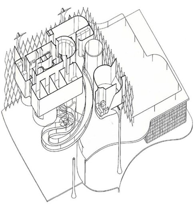 The Suspended House was a minimum framework that served as a refuge and it met all needs of a changing society, including the need for isolation. Because of this, it was thought about an “useless space”, which had no predetermined usage, it was capable of influencing the intellectual development of inhabitant. It was designed two porticos from which roof and upper floor were hung; the mechanical area was reduced to a minimum, liberating an empty space, continuous and fluid, in which individual and detachable cells were suspended over a large meeting room.