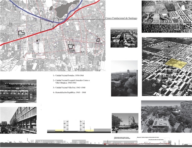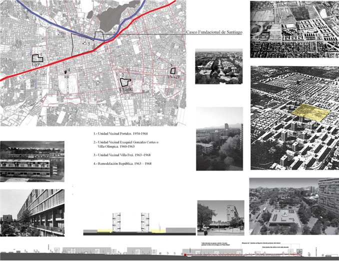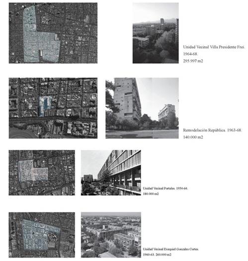 Ambas estrategias urbanas se ejemplifican en una serie de intervenciones de vivienda plurifamiliar moderna de gran escala en Santiago de Chile entre las décadas de 1950 y 1970.