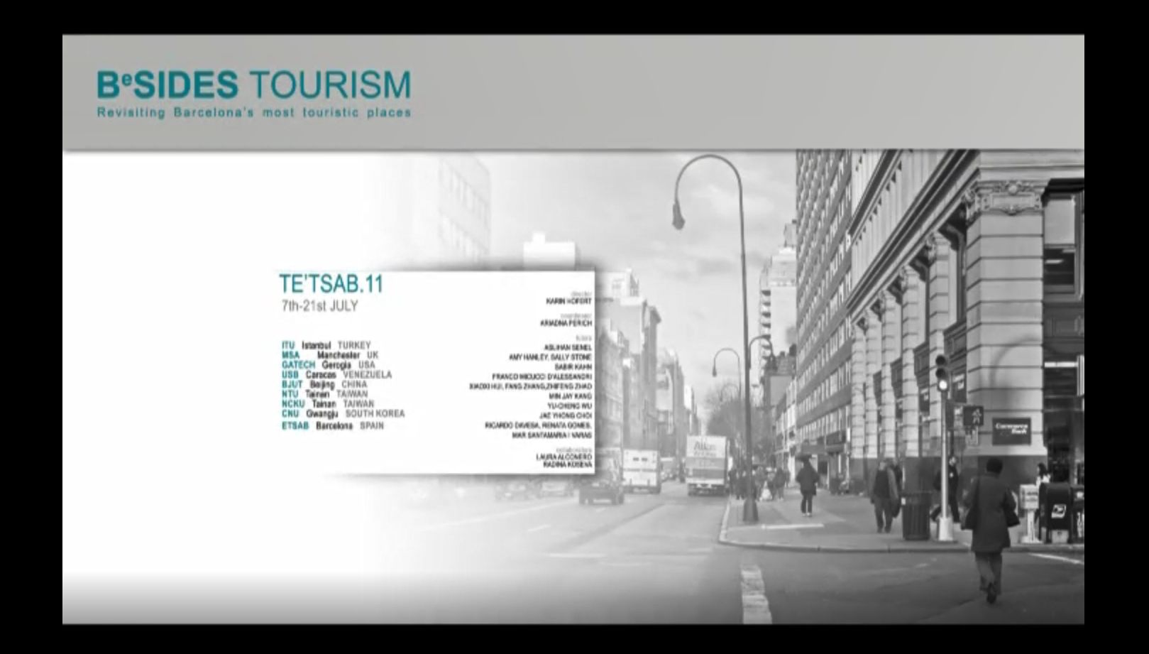 Jury with guest: Maria Goula, Álex Giménez and Kahtrin-Pongratz, de les Universitats NCKU, GATECH, ITU, CNU, USB, MSA, BJUT, NTU I ETSAB. T'ETSAB 2011, és el Workshop dirigit i coordinat per Karin Hofert, professora del Departament de Projectes Arquitectònics i Sots-directora de Relacions Internacionals de l'ETSAB. 2099.2/2509