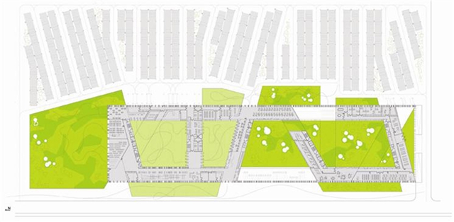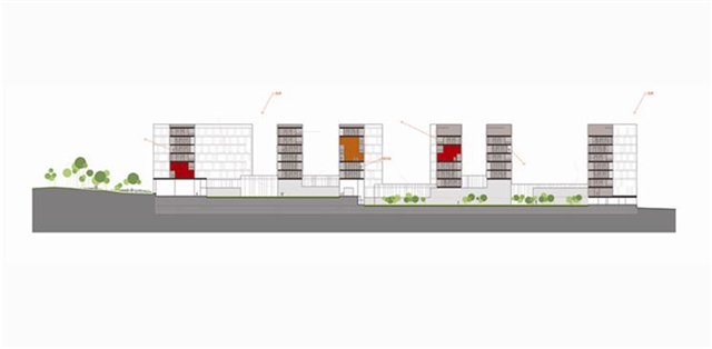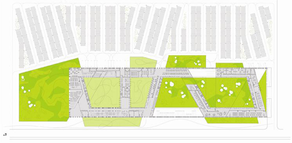 Una gran base sirve de vínculo programático con el campus, y acoge tanto a visitantes esporádicos como a usuarios habituales del edificio. Sobre ella, los edificios se disponen en sentido este-oeste, buscando una permeabilidad transversal que potencia la perspectiva lejana desde el campus y optimiza el espacio que queda entre bloques. Los edificios, ajustan su orientación respondiendo a los polos de atracción del territorio y favoreciendo el soleamiento hacia el interior.