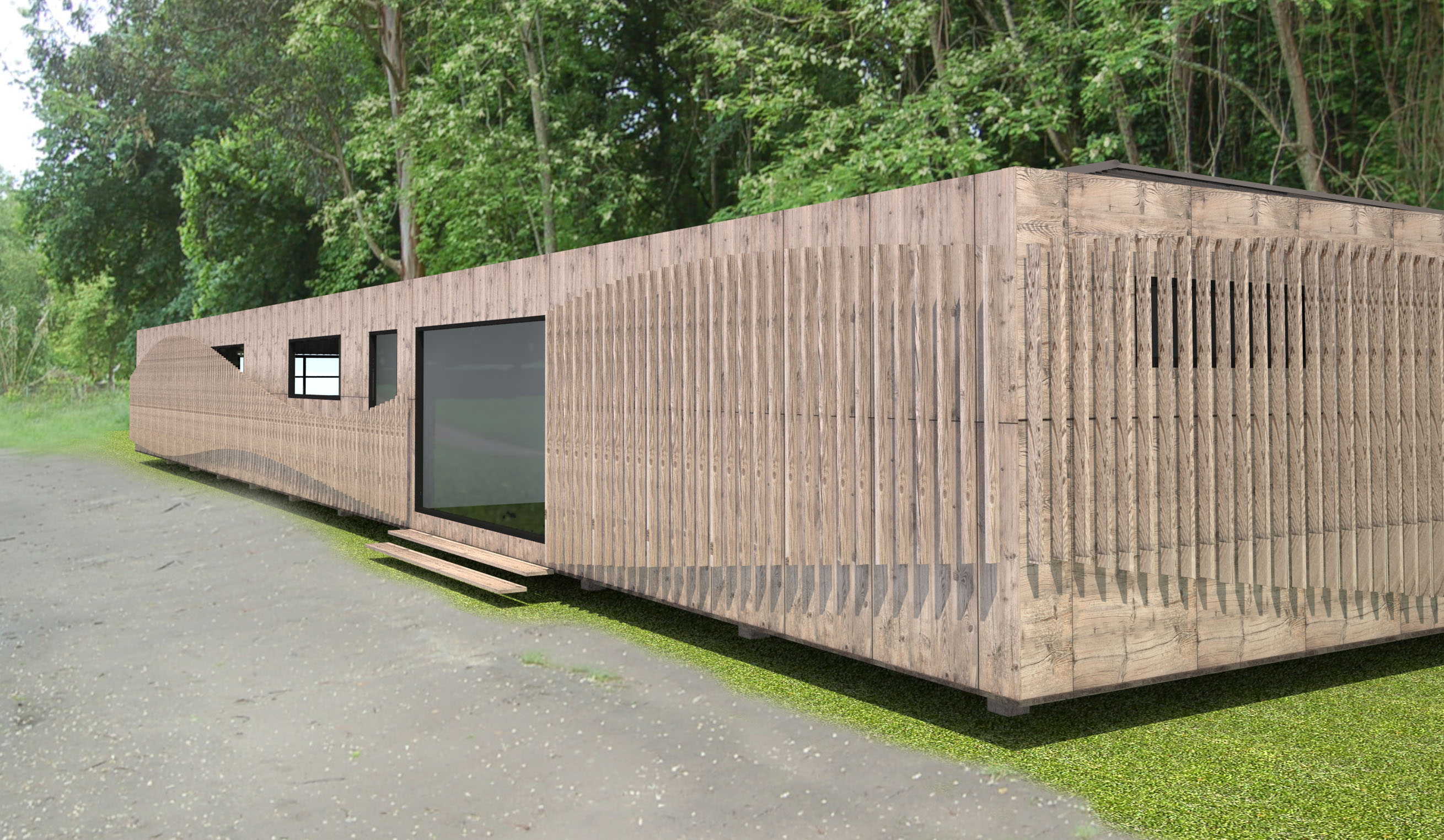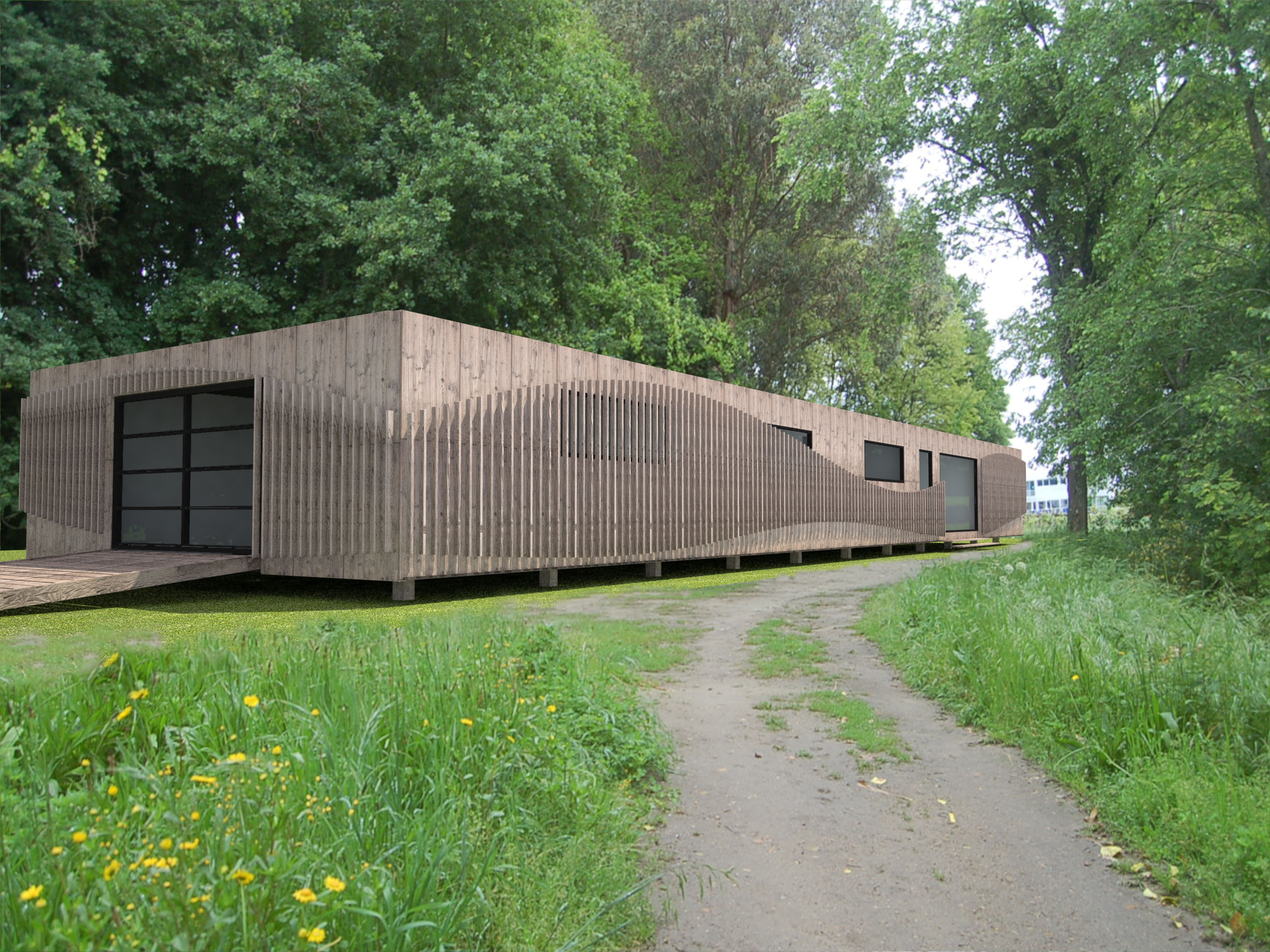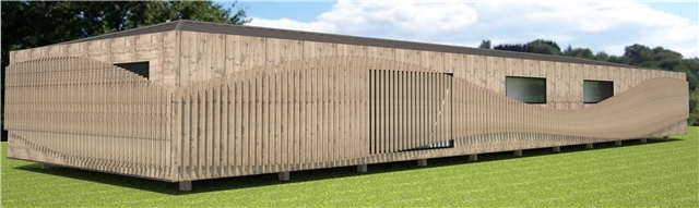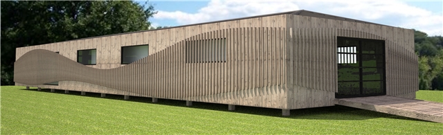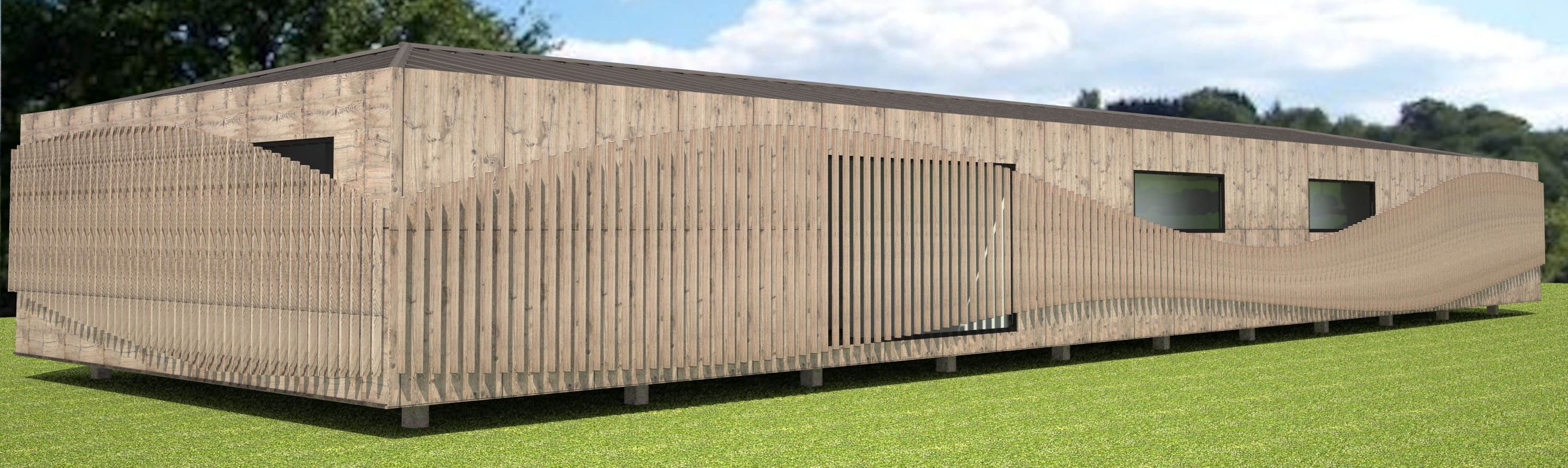 El programa se incluye en un volumen, una caja de madera que se forra exteriormente con un rastrelado sinuoso de madera que proporciona al conjunto la movilidad propia del entorno natural vivo. Esta caja se asiente de forma separada del terreno, apoyándose puntualmente.