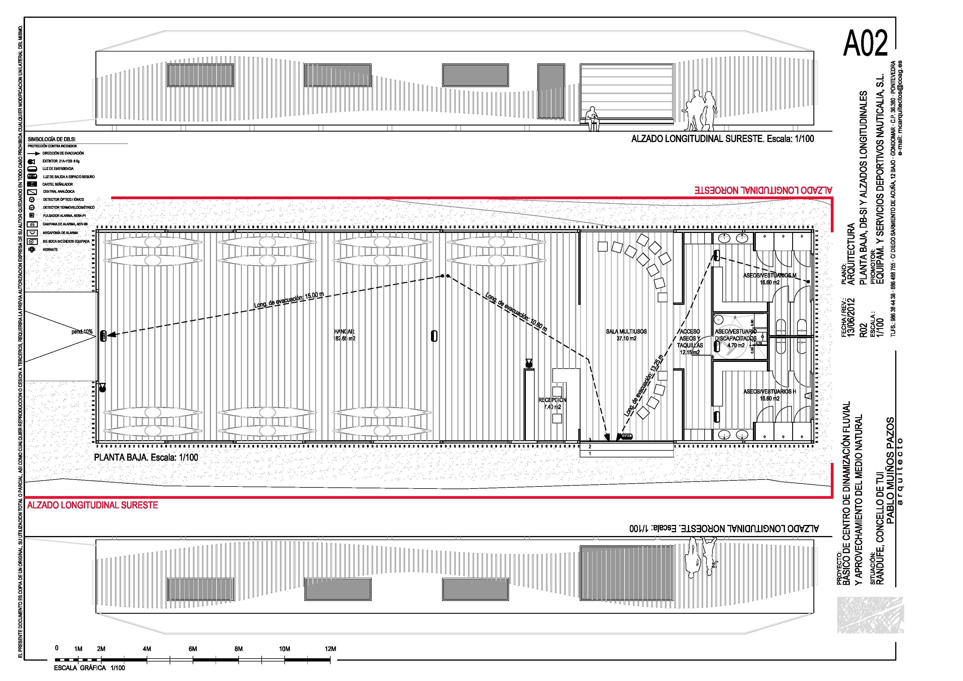 En el interior se distribuyen: Un espacio central de recepción e información, a la derecha la zona de baños/vestuarios y a la izquierda el hangar y una oficina.
