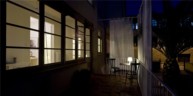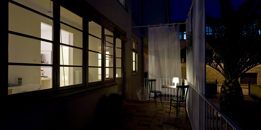 Los espacios exteriores se califican como habitaciones; añadiendo una estructura tubular para fijar toldos y cortinas en la terraza que regulen la privacidad y la radiación solar. Rebajando el pavimento del porche inferior hasta permitir el paso, adaptando como banco corrido el murete de desnivel con el jardín.