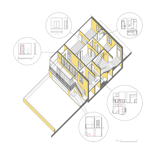 Se opera manipulando y aumentando los pasos entre estancias. Abriendo una ventana de antepecho bajo o cambiando la configuración de una puerta se intensifica el vínculo entre habitaciones sin renunciar a la capacidad de independizarlas. Ensanchando el paso entre dos espacios minúsculos se reorganiza la cocina para albergar una mesa. Equipando el baño con un armario se alojan las nuevas instalaciones y se obtiene una mampara escamoteable para la ducha.