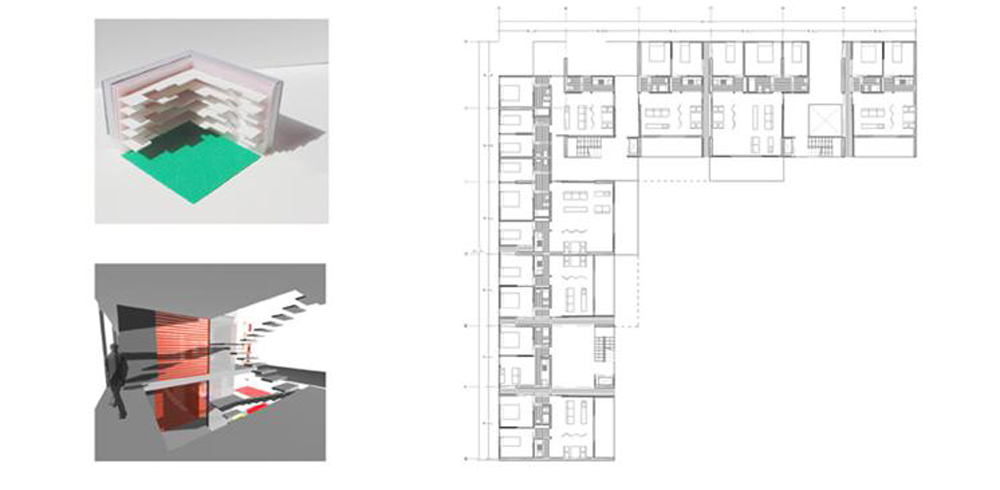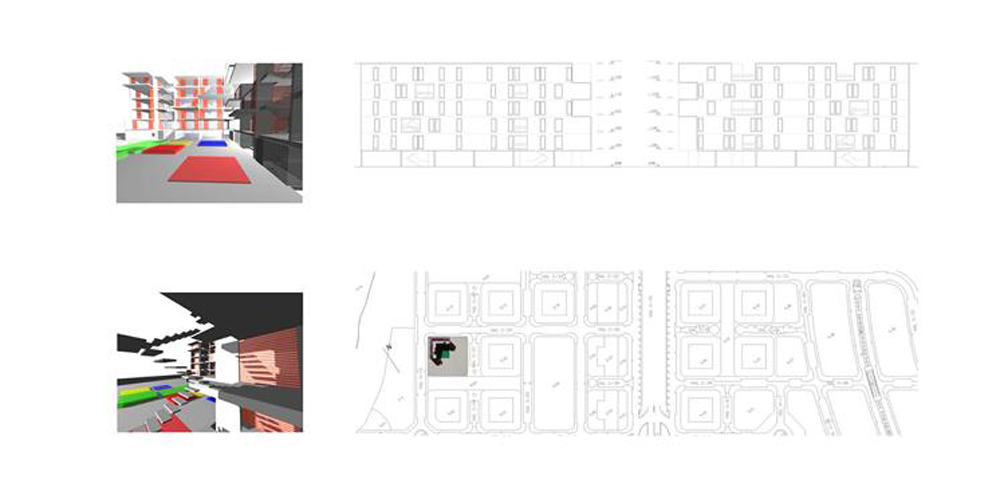 Del análisis de vivienda actual nos llama la atención la cantidad de espacios de recorridos, e incluso residuales que se desperdician. Además la gente a veces vive en casas que a veces se quedan pequeñas para un uso específico. Nos parecía adecuado agrupar estas necesidades y proporcionar a los habitantes espacios que con distinto carácter se pudiese asimilar a vivienda. Nuestra propuesta es un bloque salpicado de zonas comunes, que se asoman a la calle saludando al resto de la ciudad, pero separándose de ella, para crear en su interior un universo propio.