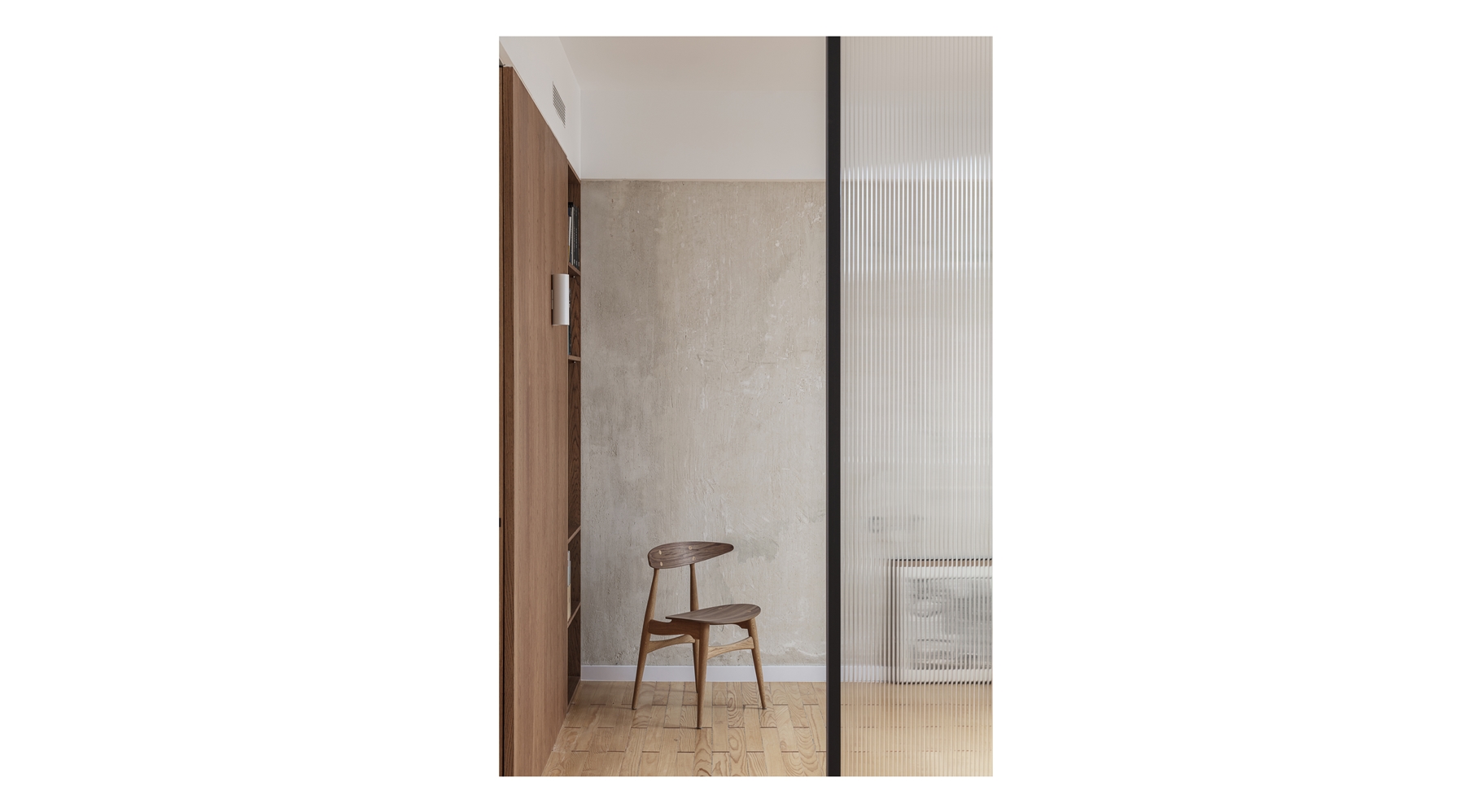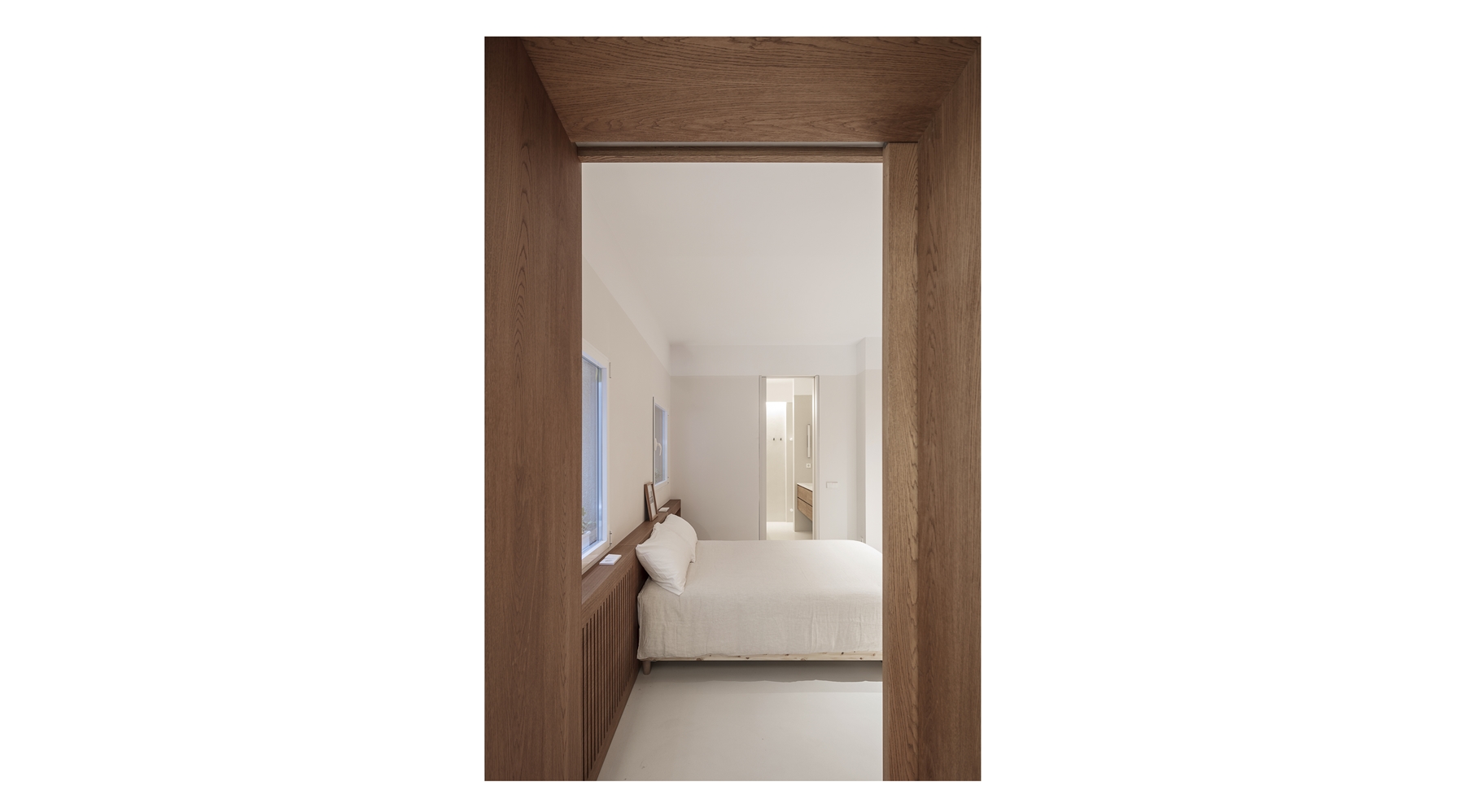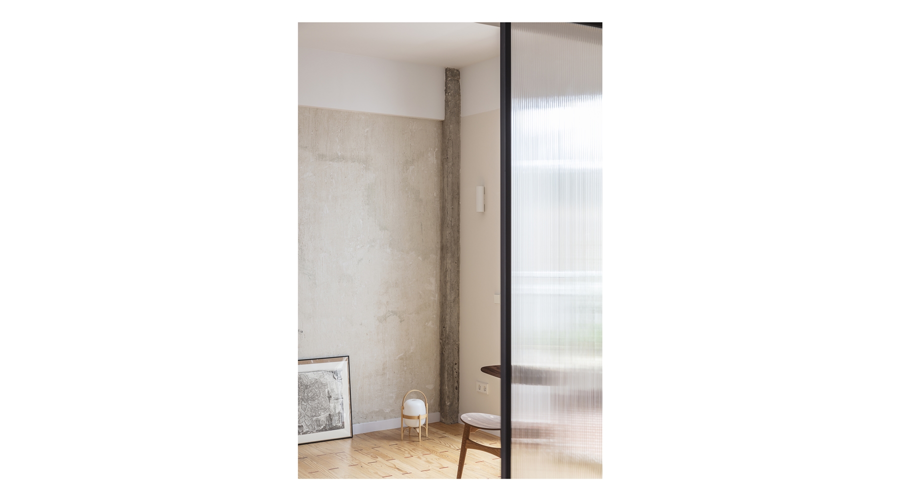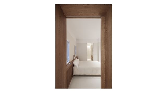 Los materiales y acabados han sido claves en la propuesta ya que acompañan a estas estrategias de proyecto. Se ha mantenido el suelo de pino melis existente en todo el espacio común, subrayando el carácter abierto y continuo de esta zona. Por el contrario, en las zonas donde no existía este pavimento, se decidió no recrearlo y utilizar un revestimiento continuo de micro-resina de aplicación manual. Este cambio de material refuerza la sensación de cápsula del espacio cerrado, creando una atmósfera cálida y acogedora. Los elementos estáticos aparecen fuertemente presentes en madera natural y lacada. Los puntos en los que se traspasa este muro de equipamiento (acceso principal y acceso al espacio cerrado) se marcan con embocaduras de madera natural, enfatizando así el tránsito entre uno y otro espacio.