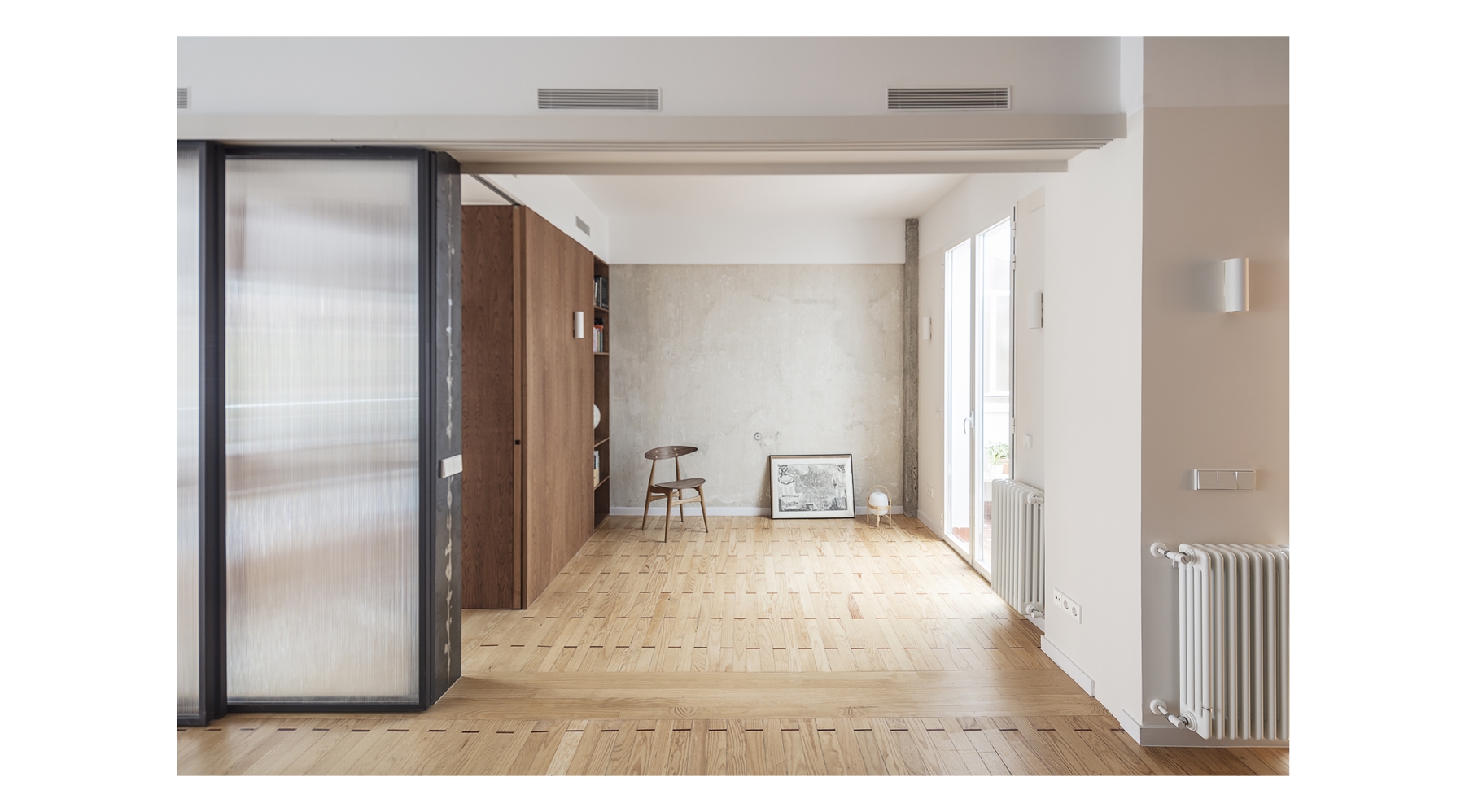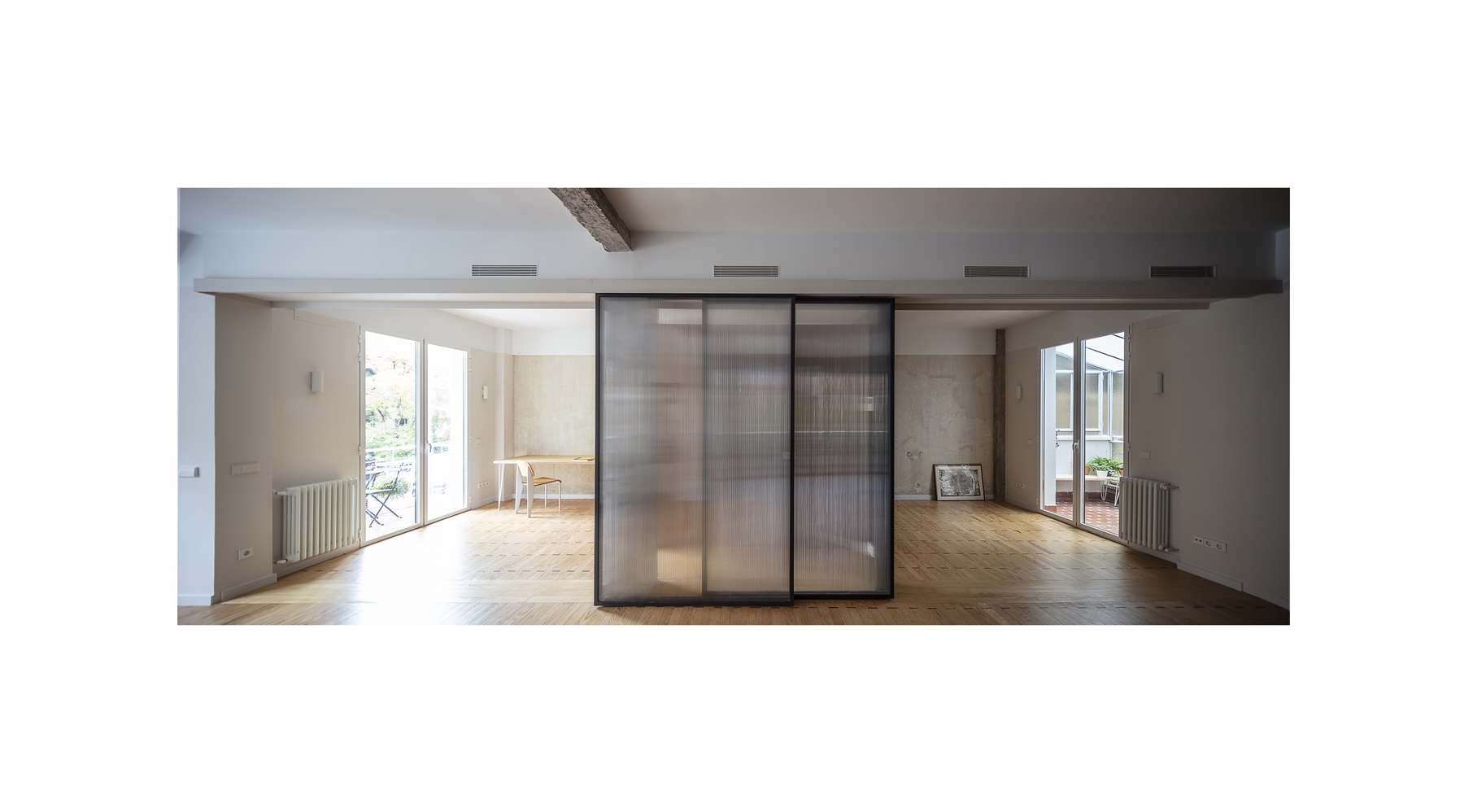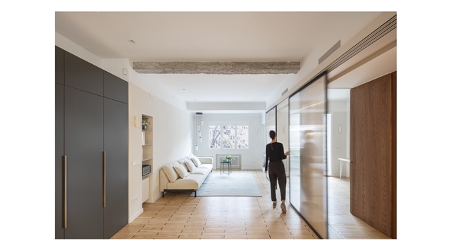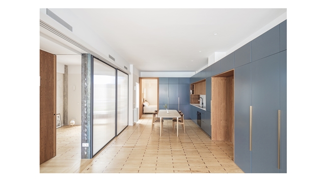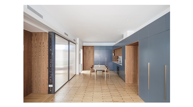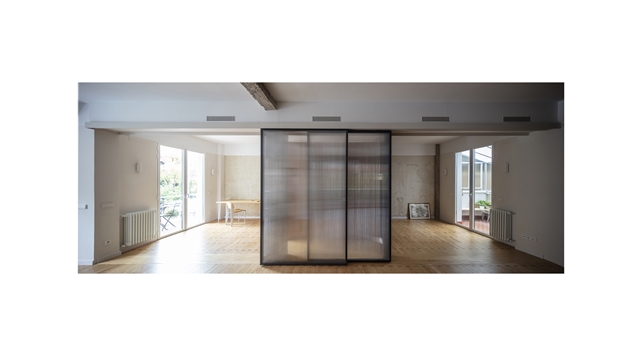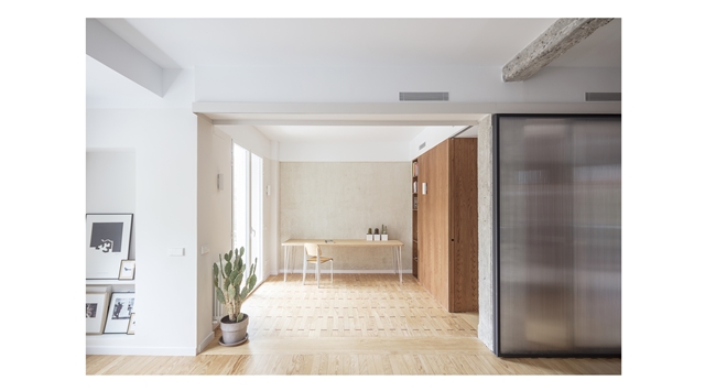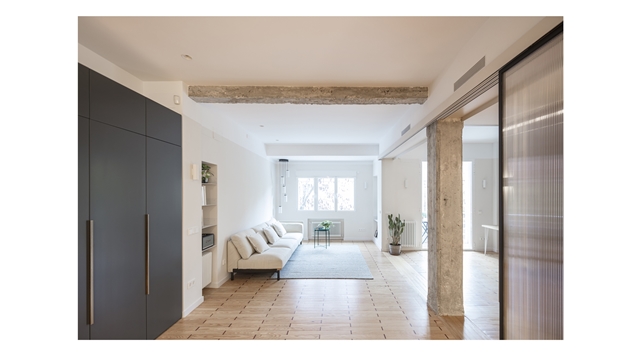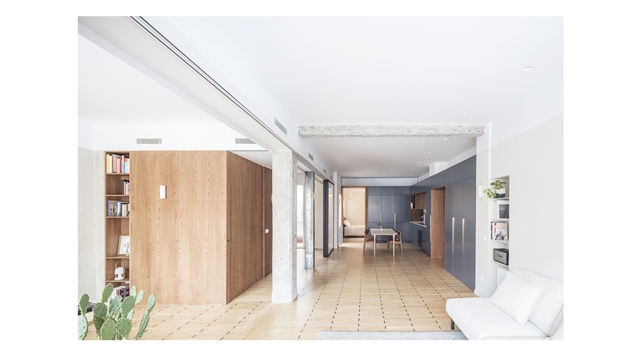 El proyecto resultante es un espacio amplio, abierto y flexible, con vistas cruzadas que recibe luz de diferentes orientaciones, y un espacio cerrado, a modo de cápsula, mucho más íntimo y acogedor. Se produce así también una inversión de la distribución tradicional de la vivienda donde la zona de servicio se ubicaba en la zona más interior. En la distribución actual las antiguas zonas de servicio se traspasan a la zona principal, en una posición más alineada con el uso de las mismas.