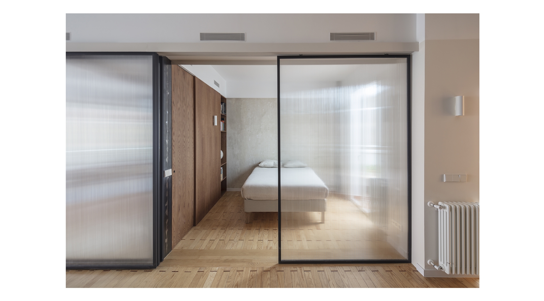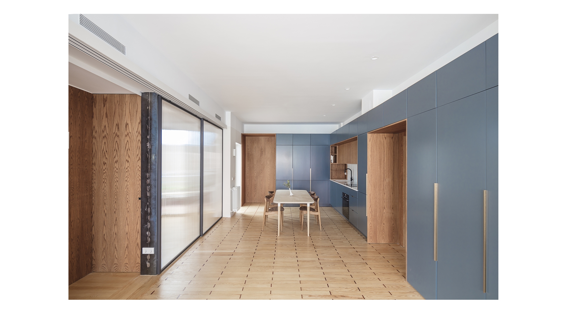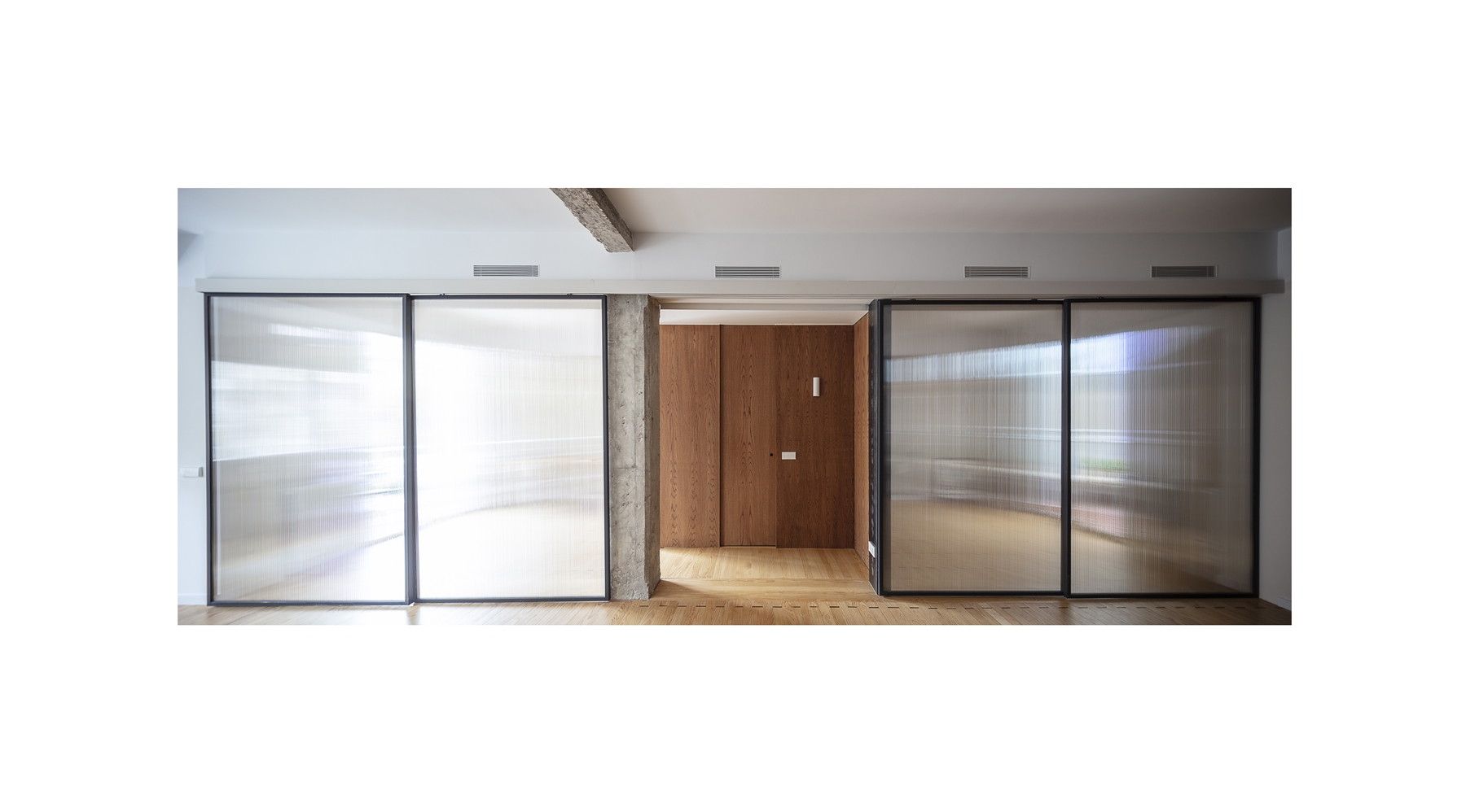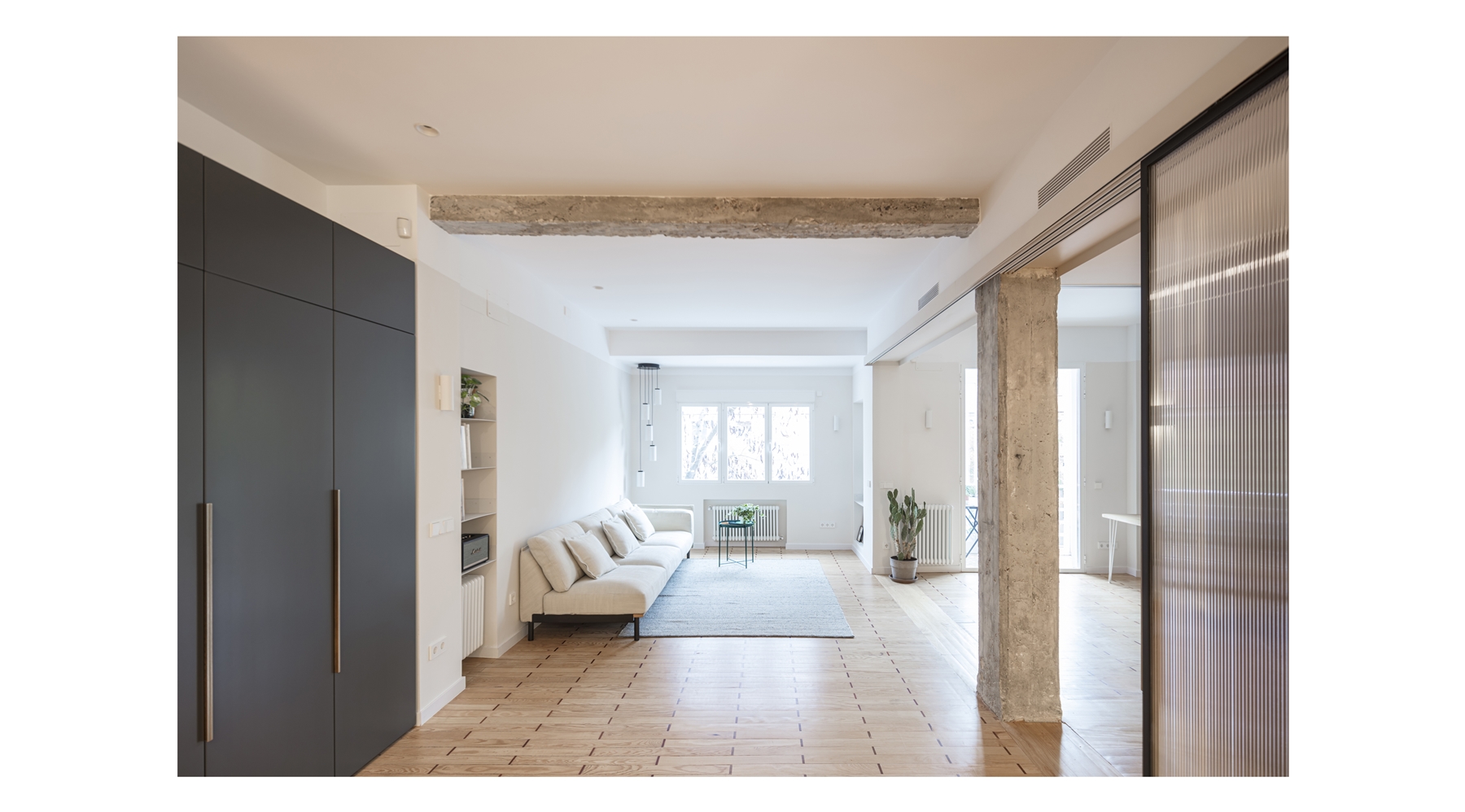 El proyecto resultante es un espacio amplio, abierto y flexible, con vistas cruzadas que recibe luz de diferentes orientaciones, y un espacio cerrado, a modo de cápsula, mucho más íntimo y acogedor. Se produce así también una inversión de la distribución tradicional de la vivienda donde la zona de servicio se ubicaba en la zona más interior. En la distribución actual las antiguas zonas de servicio se traspasan a la zona principal, en una posición más alineada con el uso de las mismas.