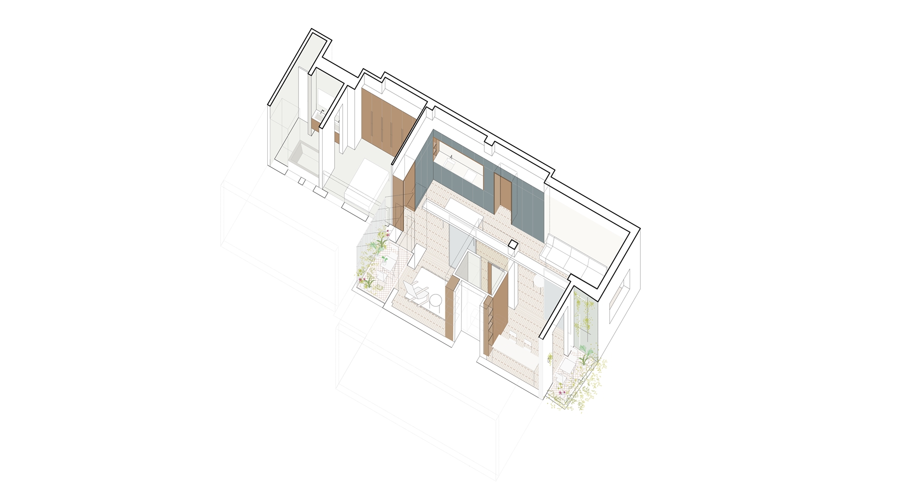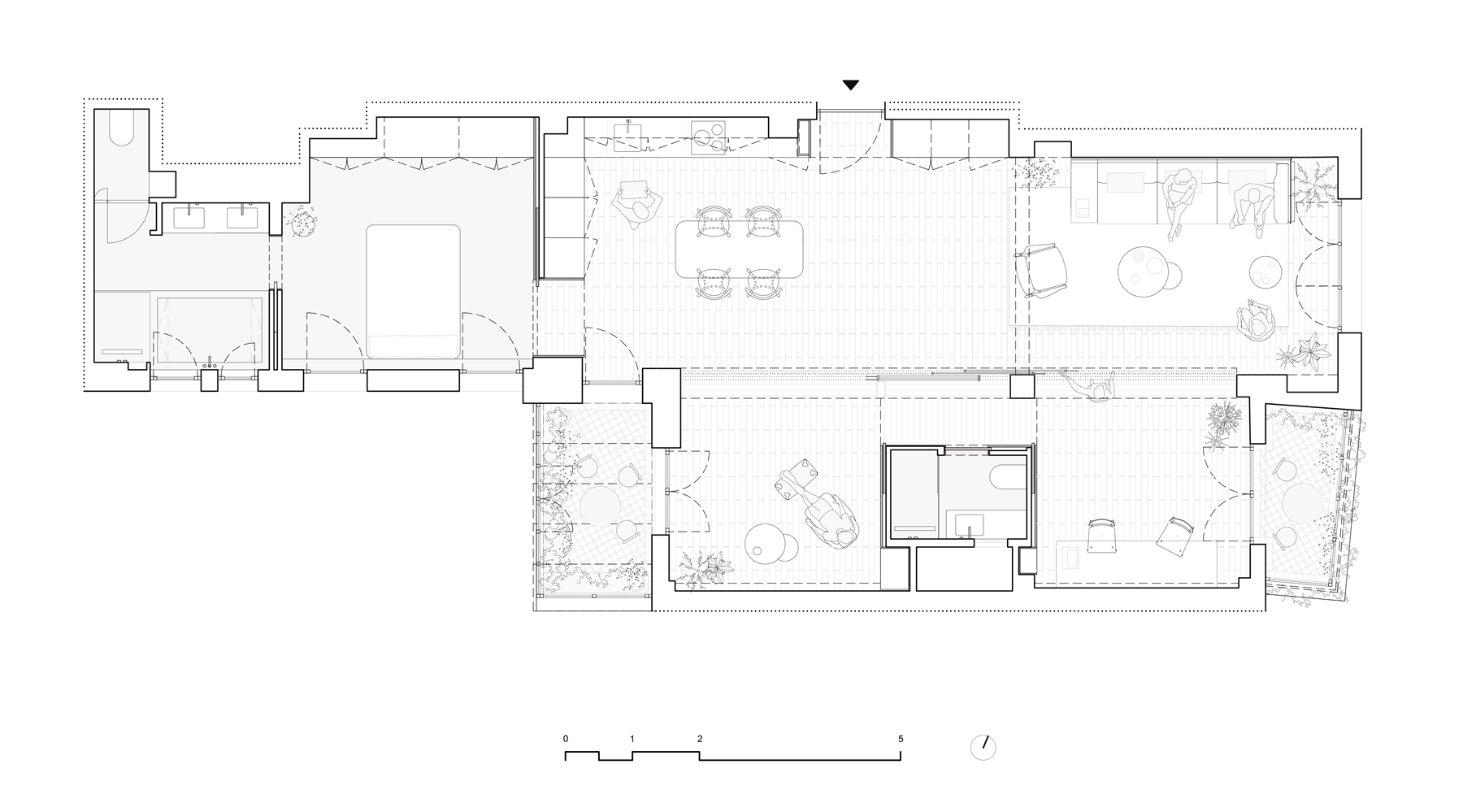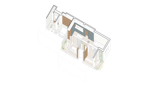 Por último, los umbrales de la vivienda hacia el exterior se tratan como terrazas en verano o jardines de invierno, según la época del año, y enriqueciendo así los posibles usos del espacio interior.