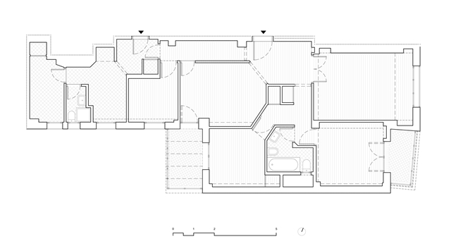 Inicialmente el espacio, alargado y con estrecha crujía, se presenta muy fragmentado con estancias oscuras y pequeñas. El objetivo es diseñar un único espacio abierto, y un espacio cerrado como base para las siguientes transformaciones.