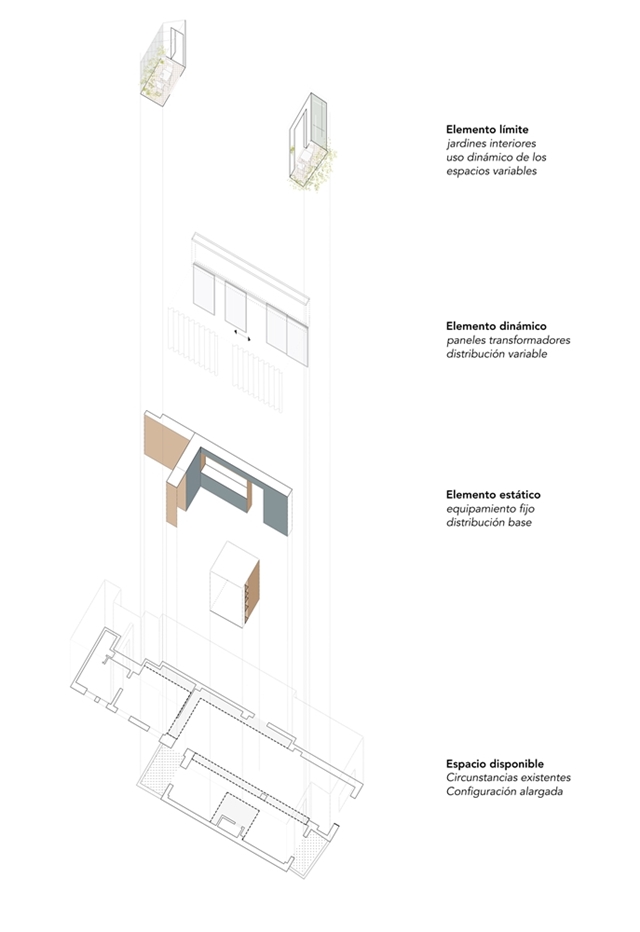 El proyecto utiliza 3 estrategias de diseño para generar este nuevo espacio. En primer lugar, se ubica el equipamiento estático necesario como elemento distribuidor de la vivienda, dividiendo así el espacio en dos zonas (espacio abierto / espacio cerrado).