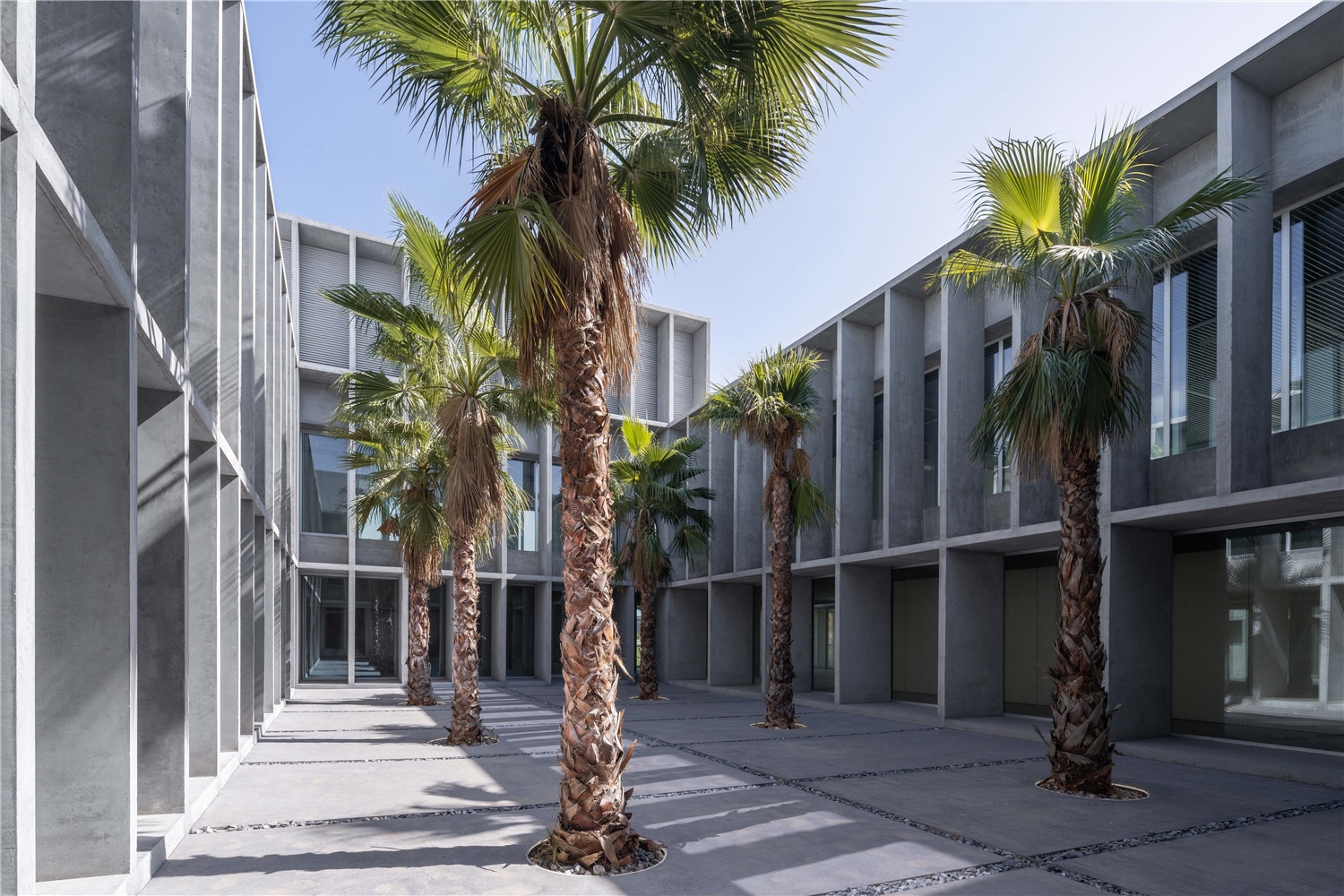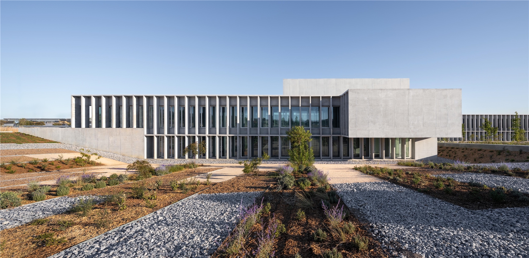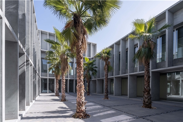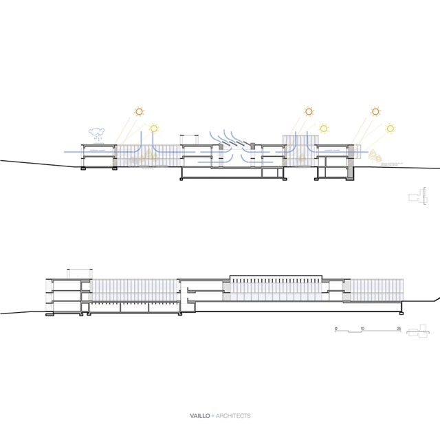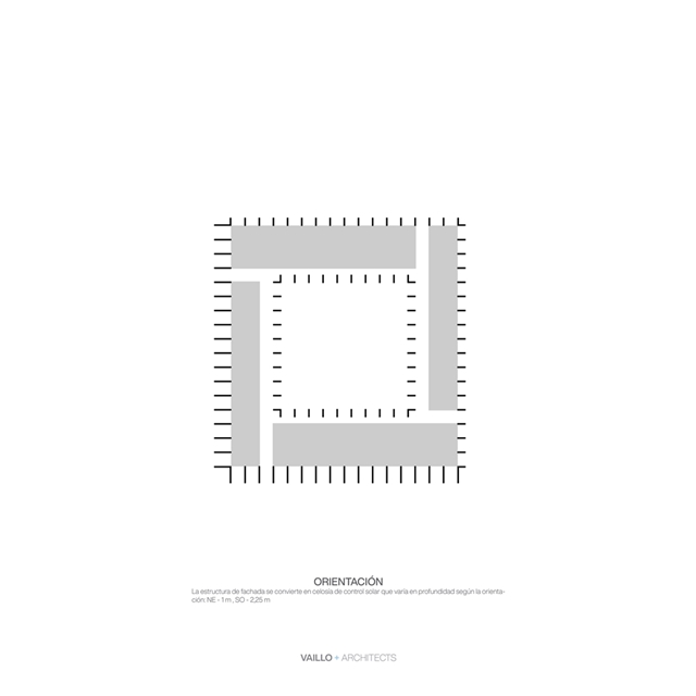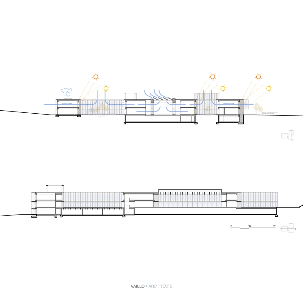 El diseño del conjunto se basa en sistemas pasivos buscando una eficiencia y sostenibilidad natural, promoviendo elementos constructivos aglutinadores de funciones: las fachadas estructurales actúan como grandes celosías de protección solar, modificando su profundidad y densidad en función de la orientación. Los patios y el atrio actúan como espacios de colchón térmico, permitiendo ventilaciones cruzadas para atemperar los espacios interiores.