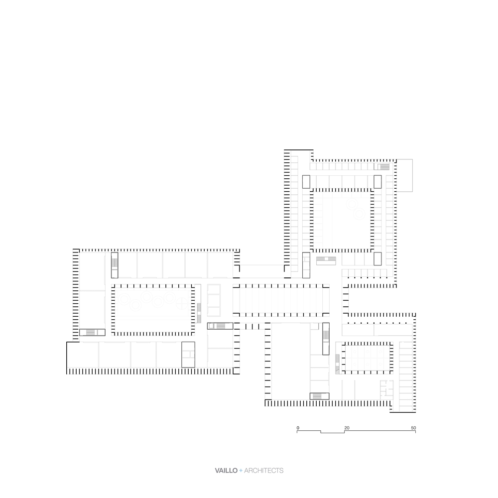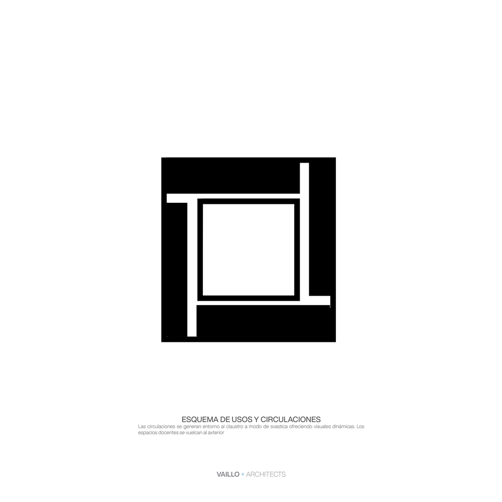 Tipológicamente el edificio sigue la tradición de la arquitectura docente basada en un sistema de agregación de volúmenes en torno a patios, recuperando el “claustro” como sistema organizativo, remitiendo a una arquitectura mediterránea donde el clima propicia espacios abiertos y ajardinados conformando diferentes tipologías de patios.