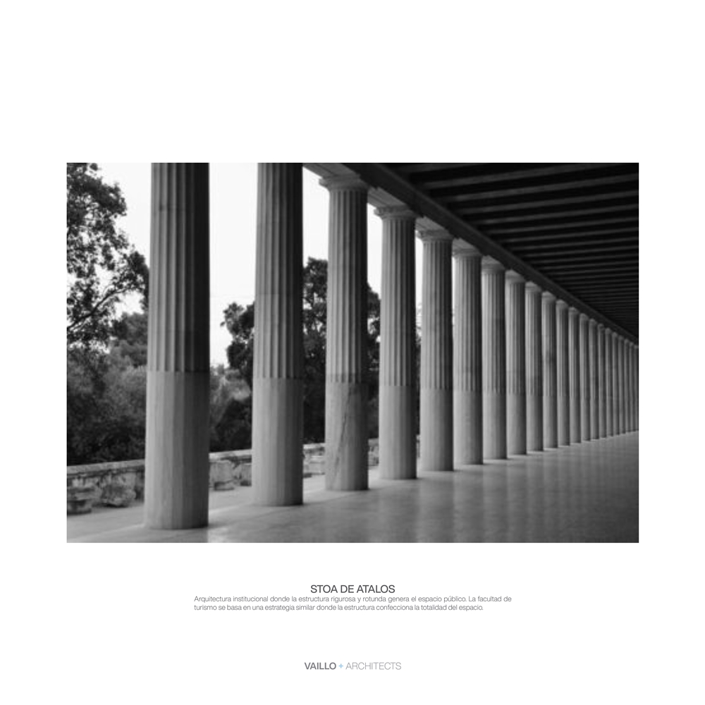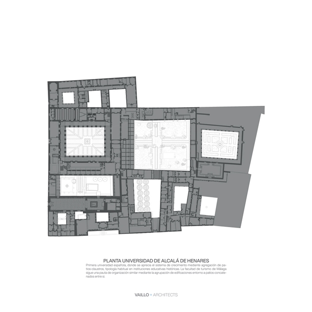 La propuesta se conforma mediante 3 volúmenes en torno a un atrio central que organiza los accesos y las conexiones, generando un gran espacio de relación permitiendo diferentes usos y funciones en un espacio de gran calidad ambiental. Los volúmenes se distribuyen en el solar de forma escalonada, generando diferentes plataformas y suaves pendientes ajardinadas. Internamente, cada volumen se organiza alrededor de un patio · claustro en torno al cual gira toda la actividad: 1- Aulas y Laboratorios de Coulinary Center 2- Departamentos: Despachos e Investigación 3- Usos Múltiples: Salón Actos, Cafetería, Biblioteca y Decanato.