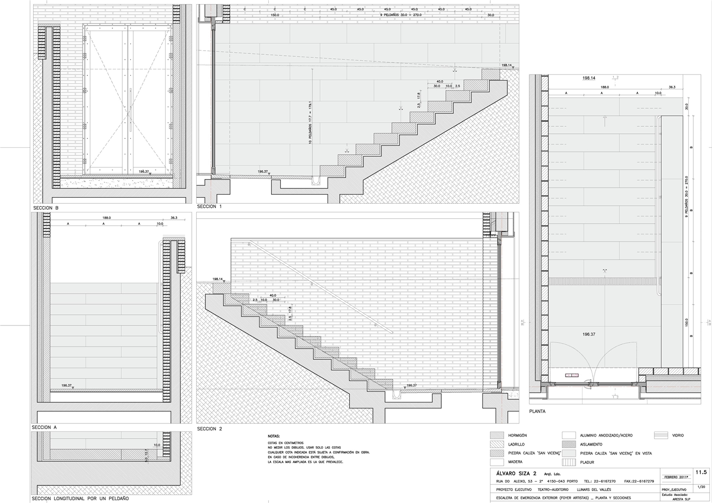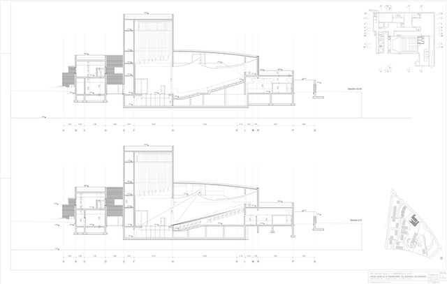 Situar el teatro-auditorio en fachada a la Ronda Sant Antoni: la elección de este lugar dentro de la totalidad del suelo disponible responde a varias solicitudes de carácter general: alejarse del bosque, colocarse adecuadamente con los ejes visuales de los claros del bosque, dar fachada a la calle de circulación “más general”, favorecer el acceso de material sin adentrarse en el suelo de jardín, facilitar una manera de entrar al espacio público jardines de equipamientos/parque urbano, etc. El edificio se articula en planta y en alzado a partir del “corazón” de la actividad, la caja escénica. De este punto dependen todas las acciones y miradas del equipamiento: músicos y actores; espectadores, escenografías, camerinos, almacenes, administración,… Así, se disponen los diferentes usuarios en espacios relacionados con la escena y los volúmenes correspondientes a esos espacios se muestran como tales, articulados por patios, en su expresión exterior.