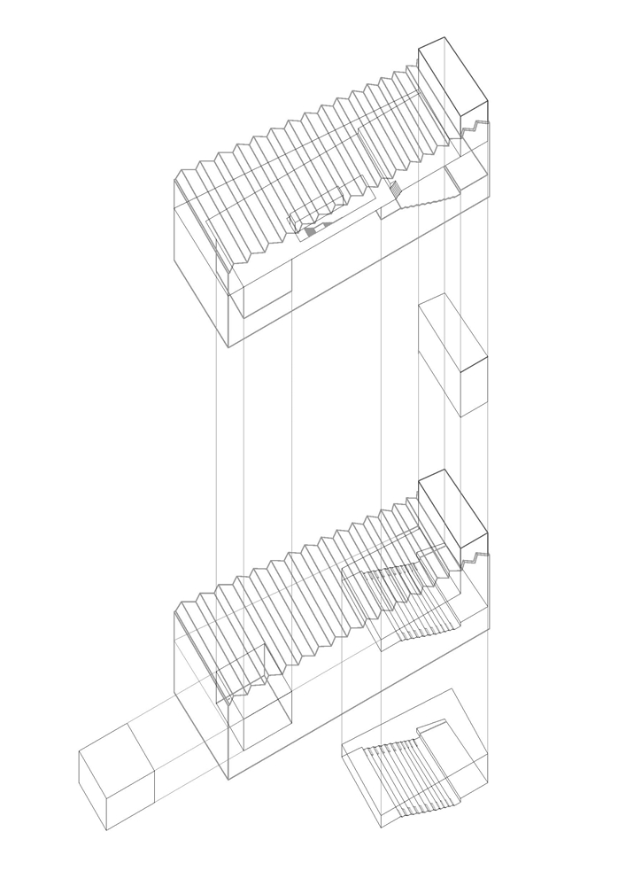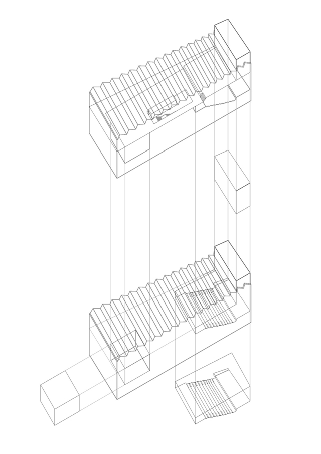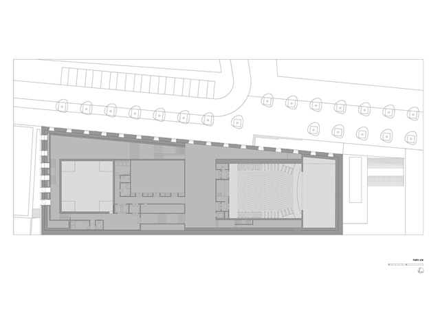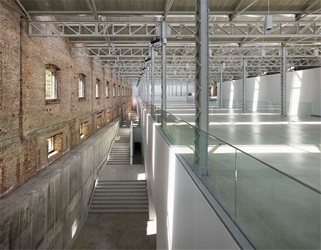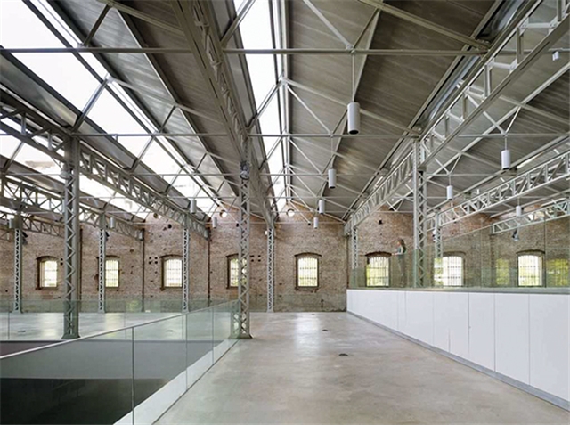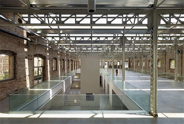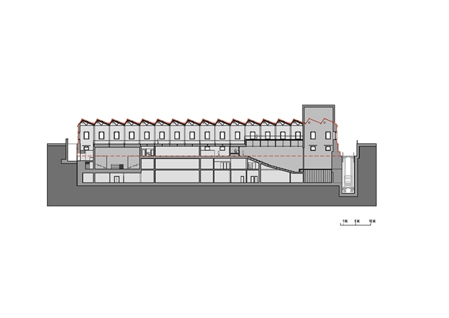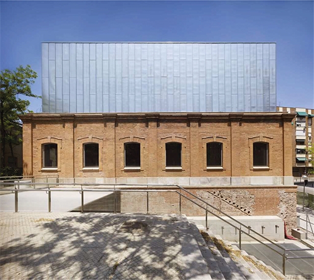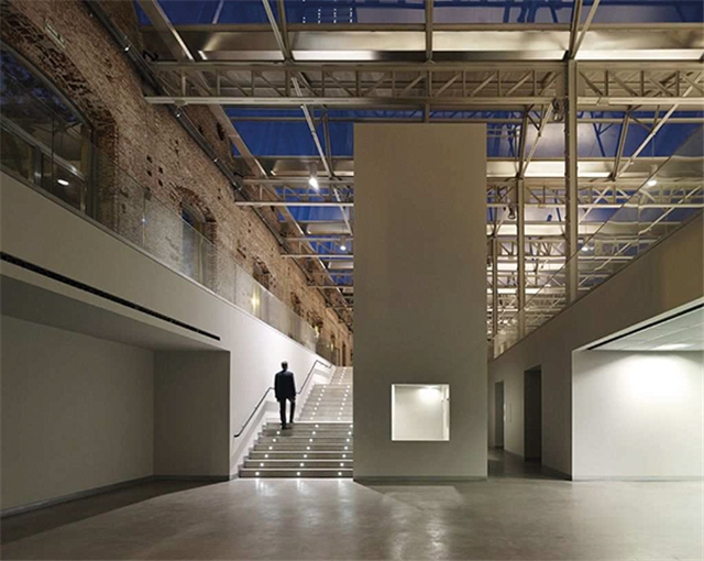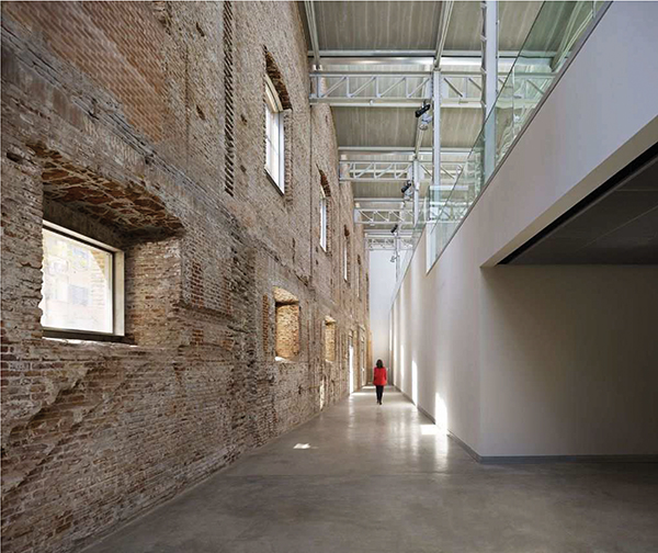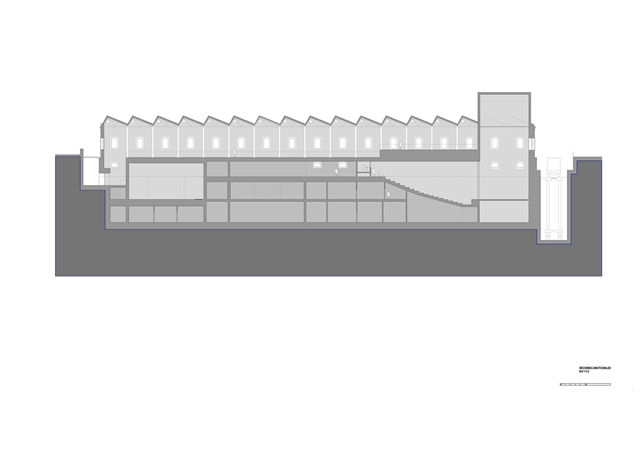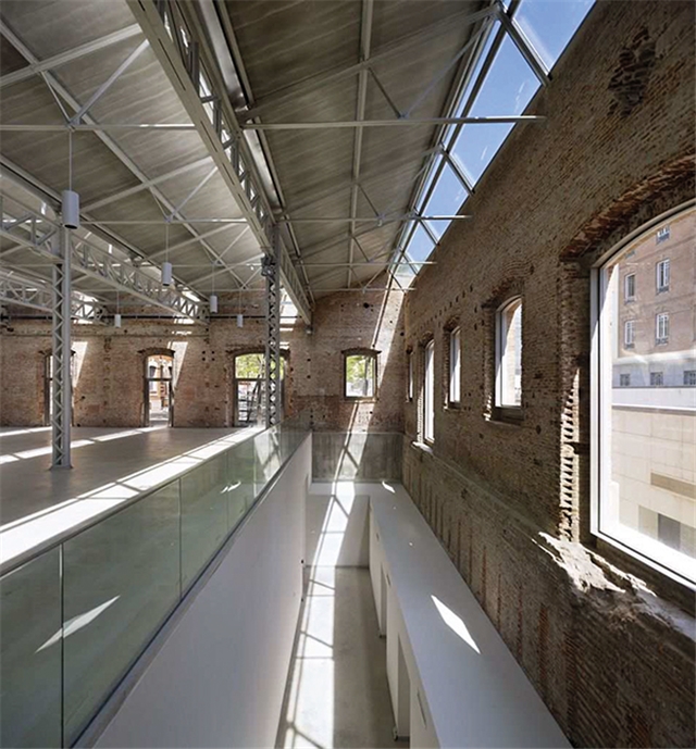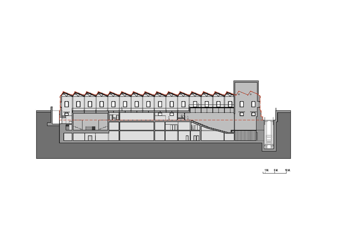 Se crea un espacio intermedio de separación entre la antigua nave y los nuevos usos que potencia el carácter del edificio existente y crea una zona de filtro y protección del exterior. Estos espacios intersticiales permiten establecer una conexión visual que propicia diferentes experiencias espaciales. Se crea un amplio espacio común en los accesos. Un lugar de convergencia, orientación y exposición que funciona como un ágora protegida, una extensión de la plaza exterior en el interior del edificio. Se desarrolla una cubierta altamente tecnificada, capaz de aprovechar la luz y la ventilación natural.