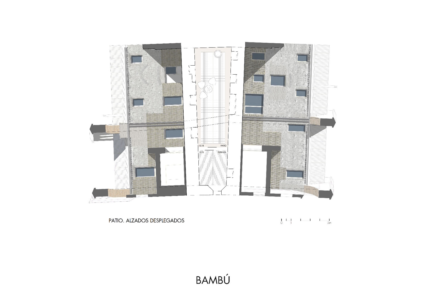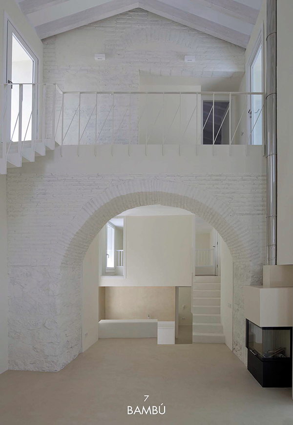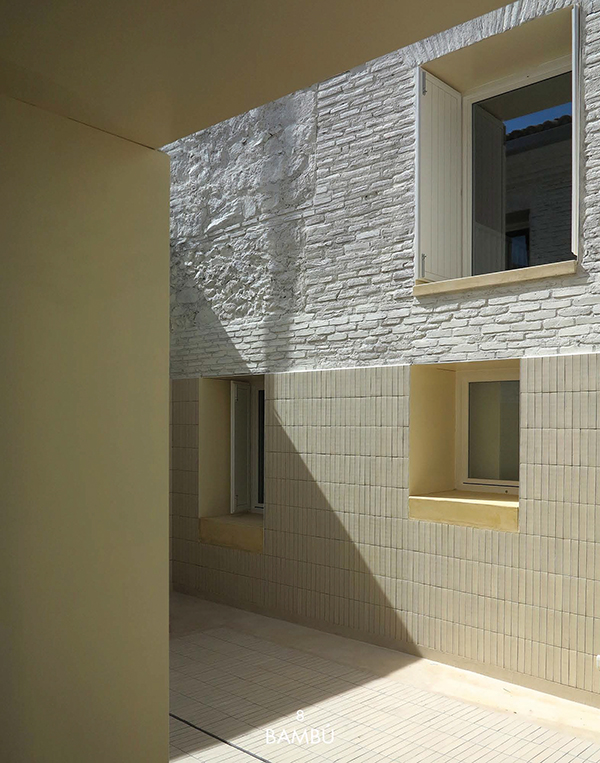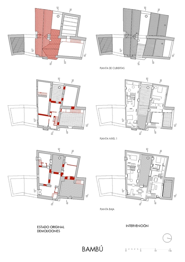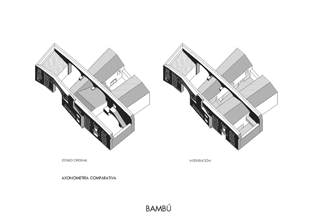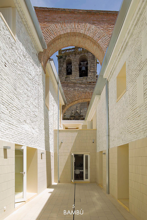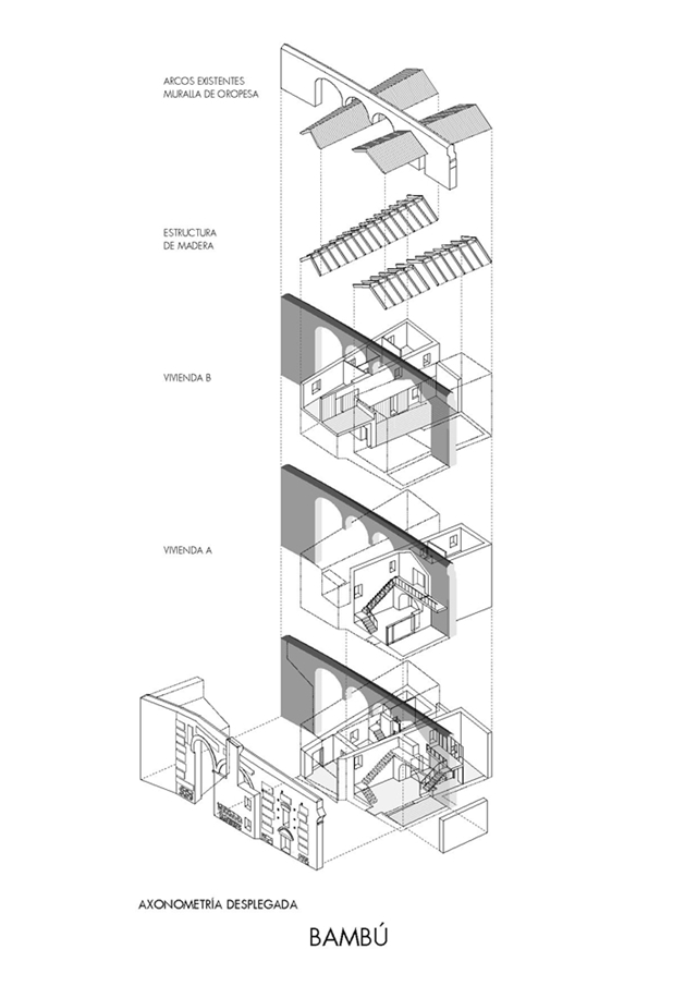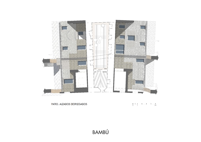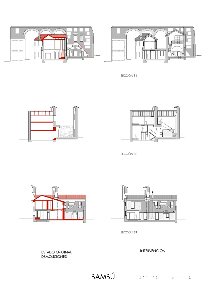 Inicialmente, existían tres pequeñas viviendas muy divididas entre varias dependencias en ruinas, compartiendo dos patios detrás de una fachada, que se mantuvo inalterada en el tiempo, atravesada por amplios arcos de ladrillo. El interior de las viviendas carecía de ventanas suficientes para la ventilación e iluminación y desde la premisa de mantener las fachadas, el proyecto abre un patio – grieta en su interior, largo y estrecho, que ordena a ambos lados las dos viviendas desiguales para dos hermanos. El patio longitudinal incorpora en su extremo una nueva vista de la torre de la iglesia del S.XVI, como telón de fondo y sirve de elemento de ordenación, dando luz natural a la intervención. Ambas viviendas se abren al patio central que mantiene asimismo los viejos muros de aparejo toledano y una de ellas a un pequeño patio privado. Los muros del patio, muy dañados en su base, se plementan con un zócalo sobrepuesto de ladrillo visto, material que pavimenta asimismo el patio como único material. Los muros restaurados se pintan de color claro en continuidad con el color arena del ladrillo para llevar la luz natural a las viviendas y preservar la textura natural de los materiales, integrándose con las texturas del entorno. En el interior de las viviendas se mantienen también los muros de aparejo livianas escaleras construidas con chapa de acero.
