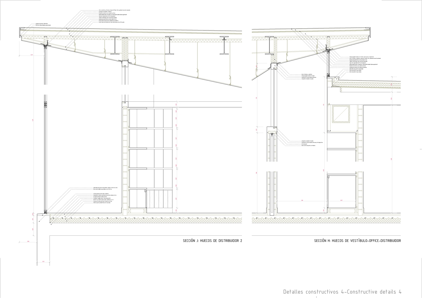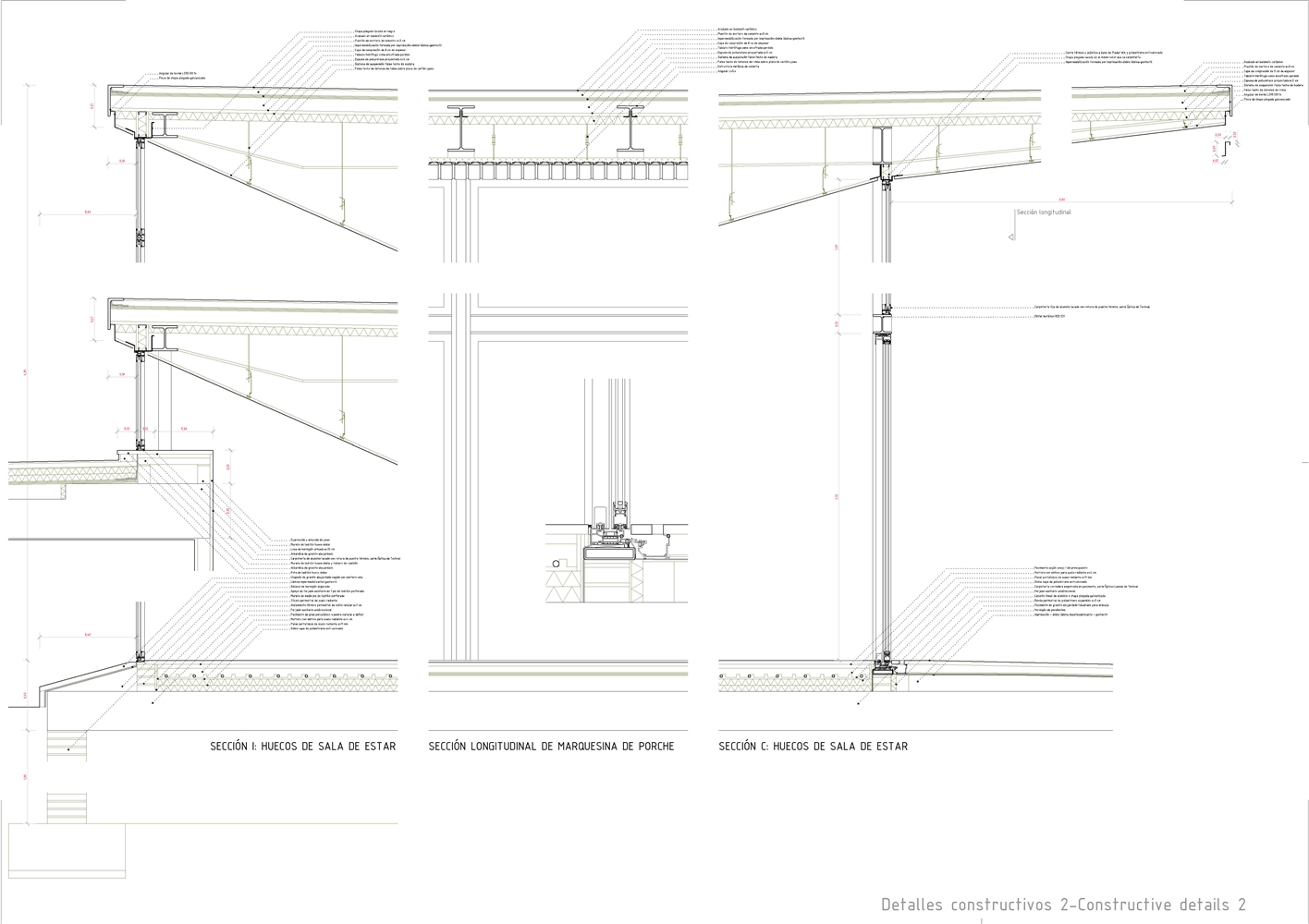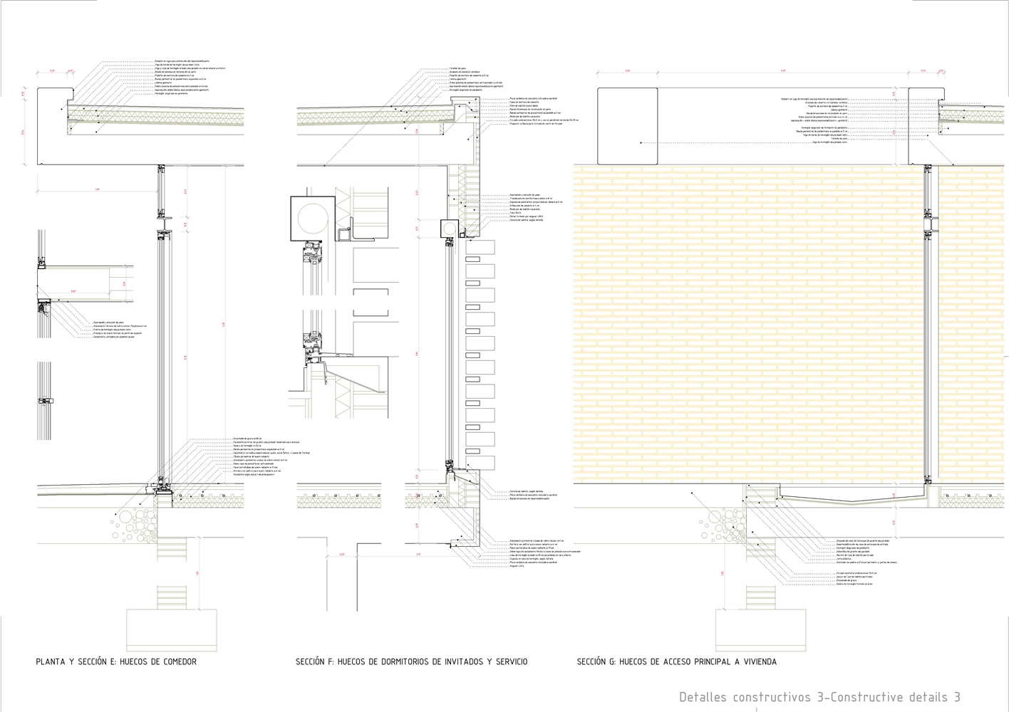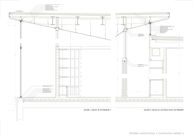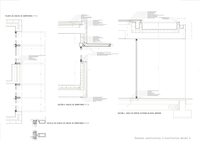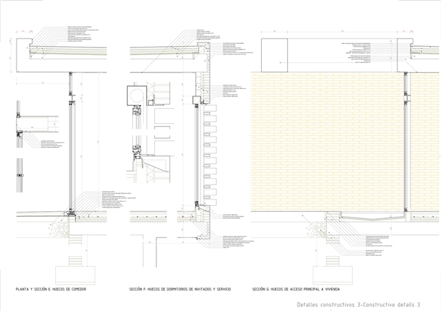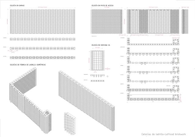 Constructivamente se buscaron texturas gruesas y presencia de la materia: por debajo del nivel de piso domina un hormigón levemente abujardado, y por encima de él un ladrillo de fabricación manual que hacia la calle se manifiesta como una envolvente prácticamente continua, sólo salpicada ocasionalmente por celosías de mismo material. La continuidad de la piel cerámica se lleva incluso a la cubierta, que a pesar de no ser estrictamente transitable, está acabada en baldosín catalán, imaginando que, ocasionalmente, sus habitantes subirán a ella para otear el horizonte.