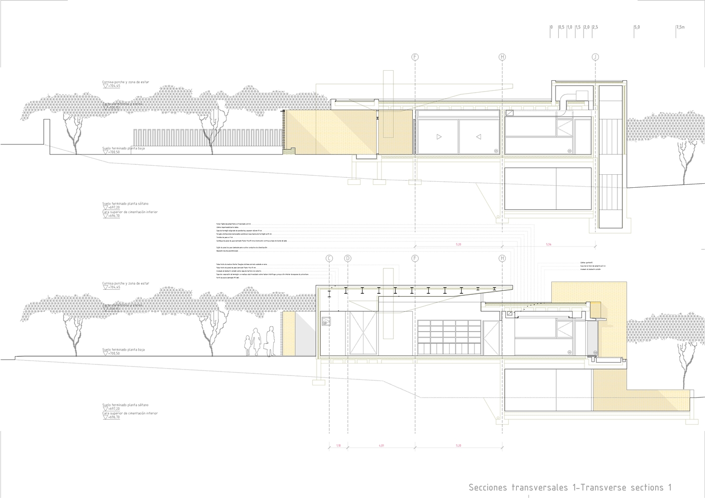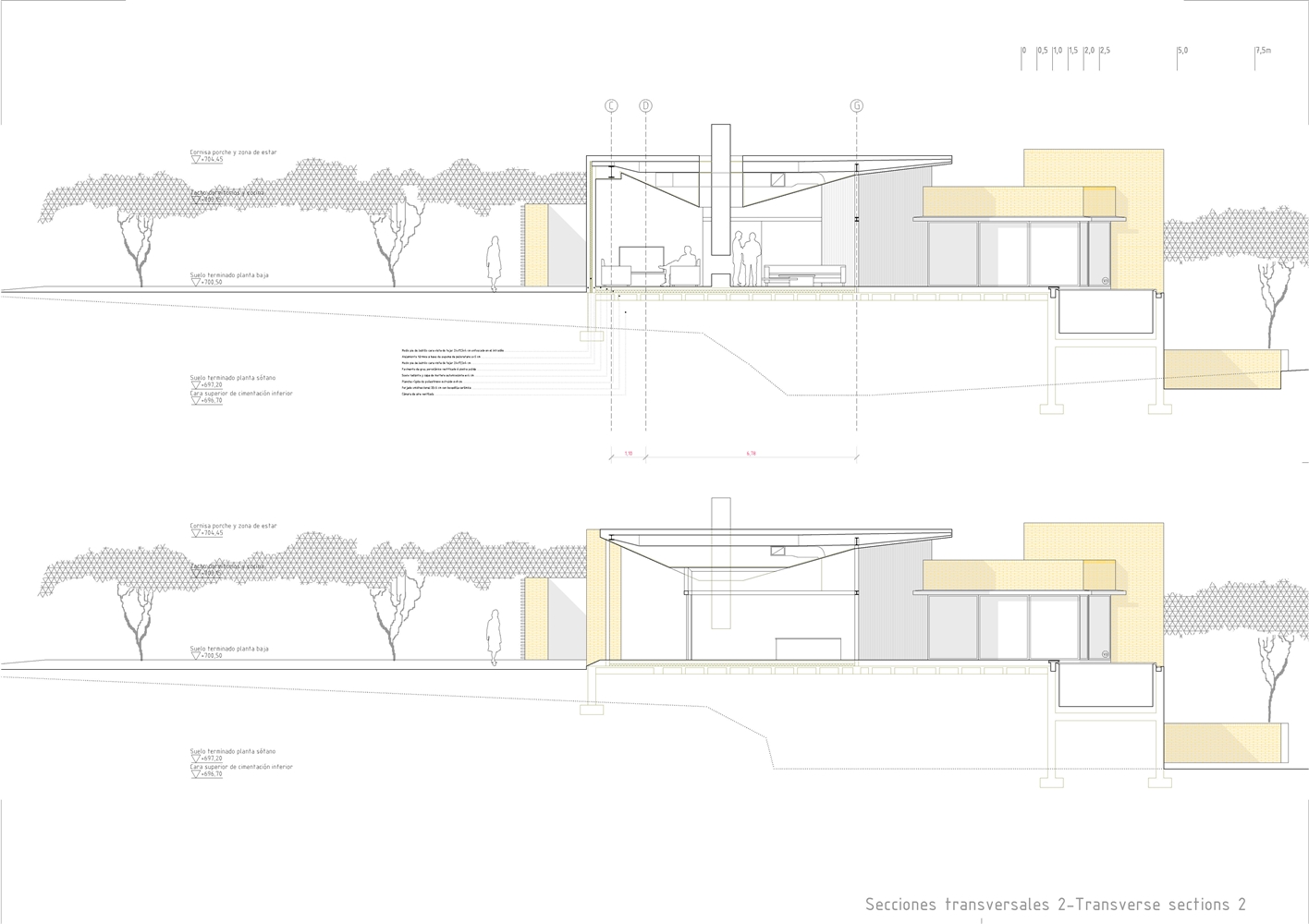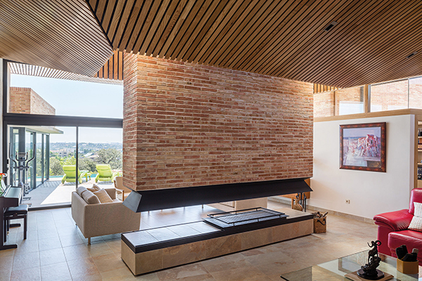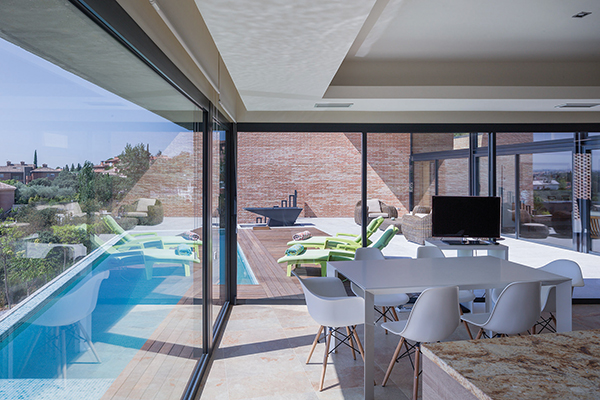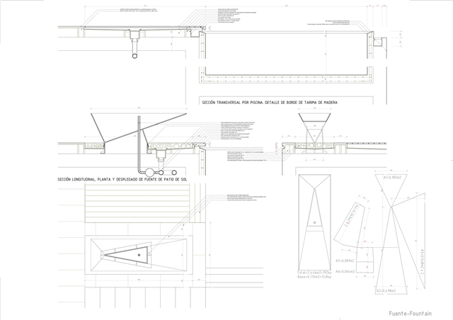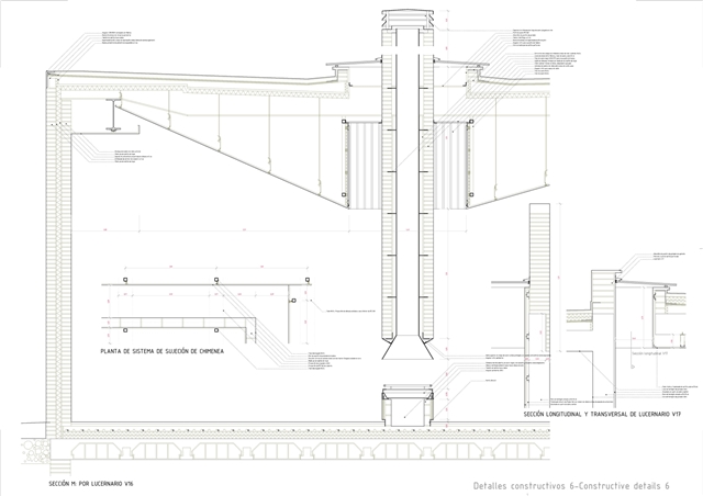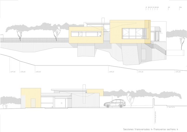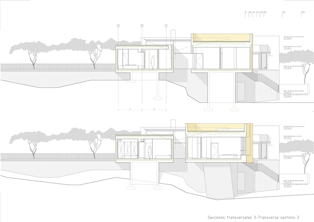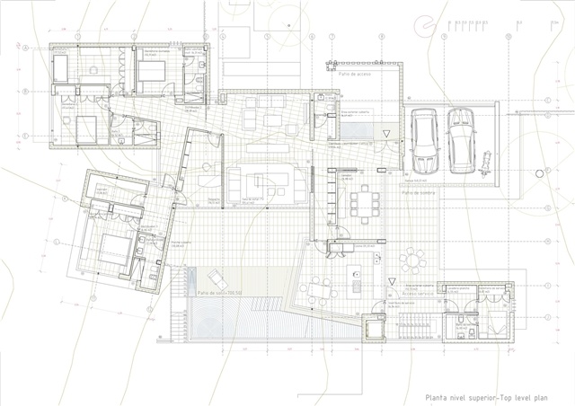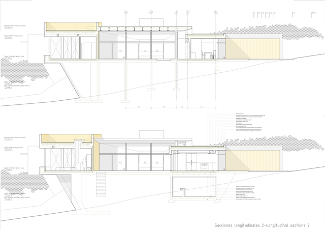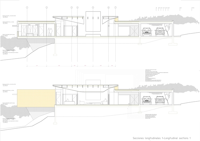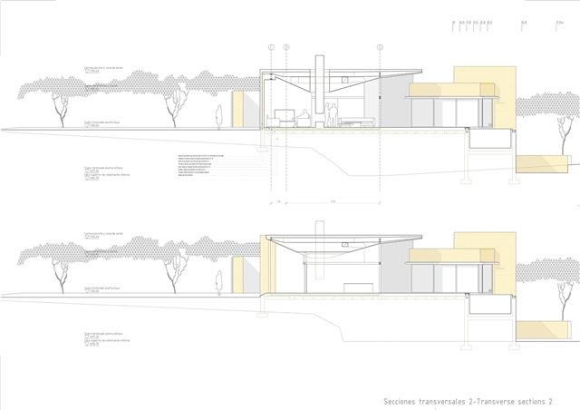 De la macla de volúmenes que conforman el proyecto se destaca la zona de estar, que ocupa la posición central del esquema, vuelca hacia el patio de sol y gira en torno a una gran chimenea colgante, que define dos ámbitos diferenciados. Rodeada de luz cenital y de un techo en forma de impluvium, la chimenea se convierte a mediodía en una gran linterna que ilumina toda esta área central. Finalmente, los dormitorios se agrupan en dos volúmenes que se despegan de la parte más baja del solar y dominan el paisaje a modo de atalayas.