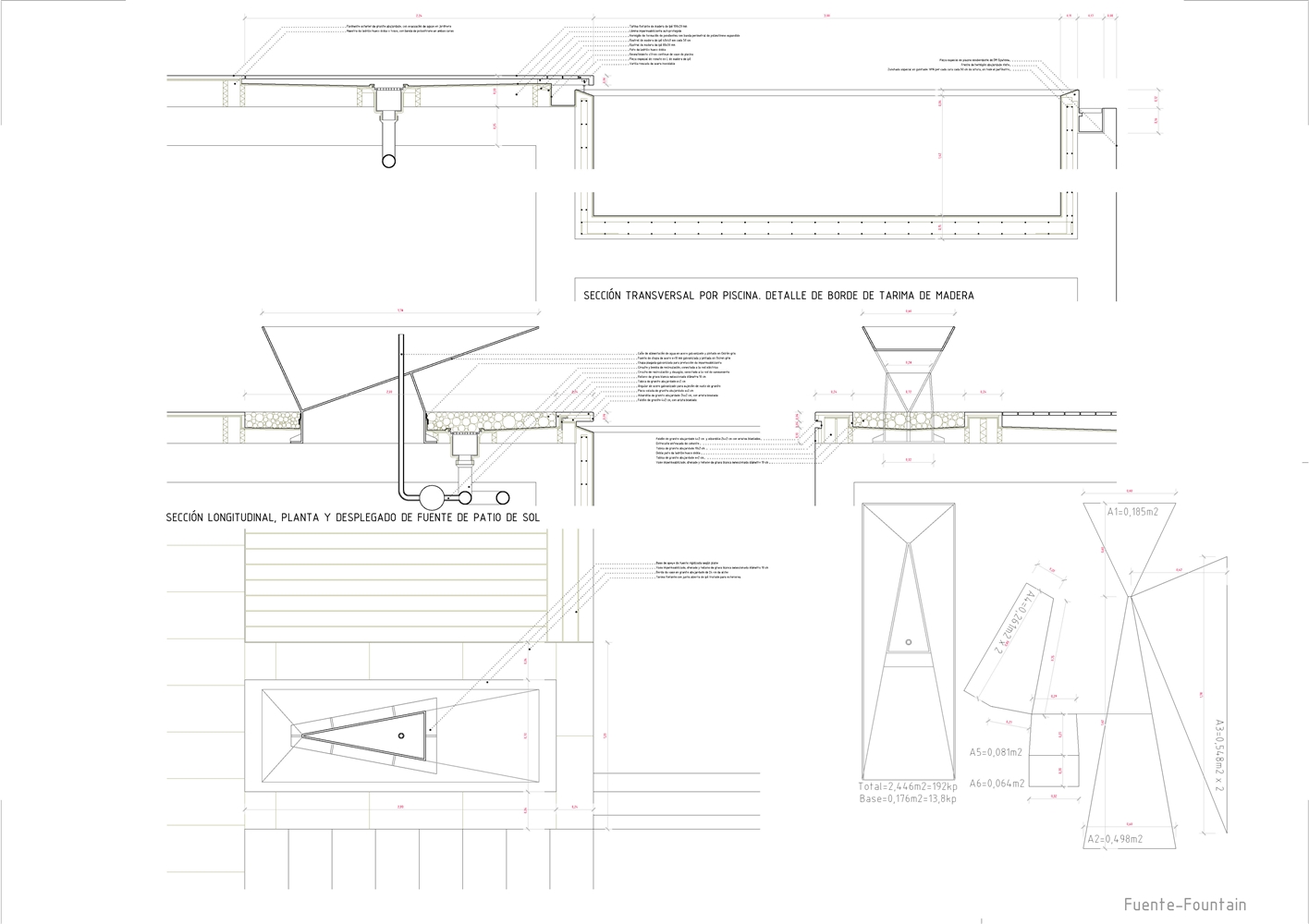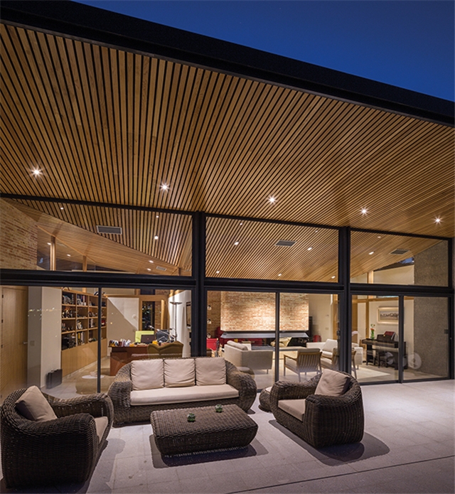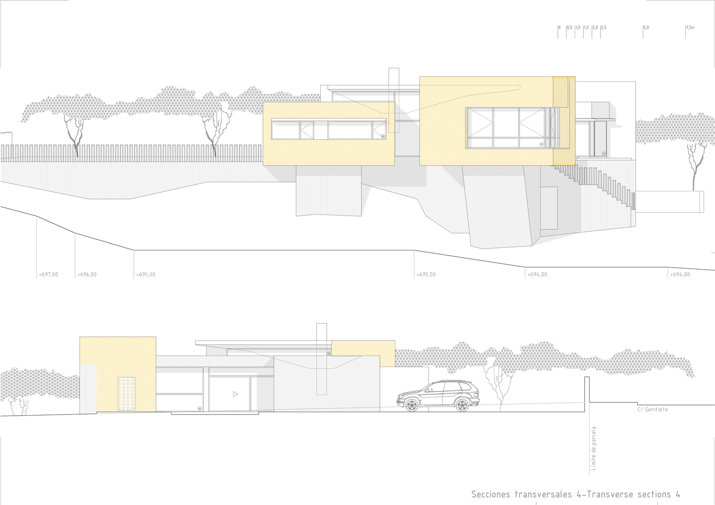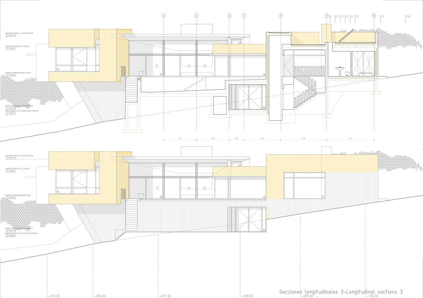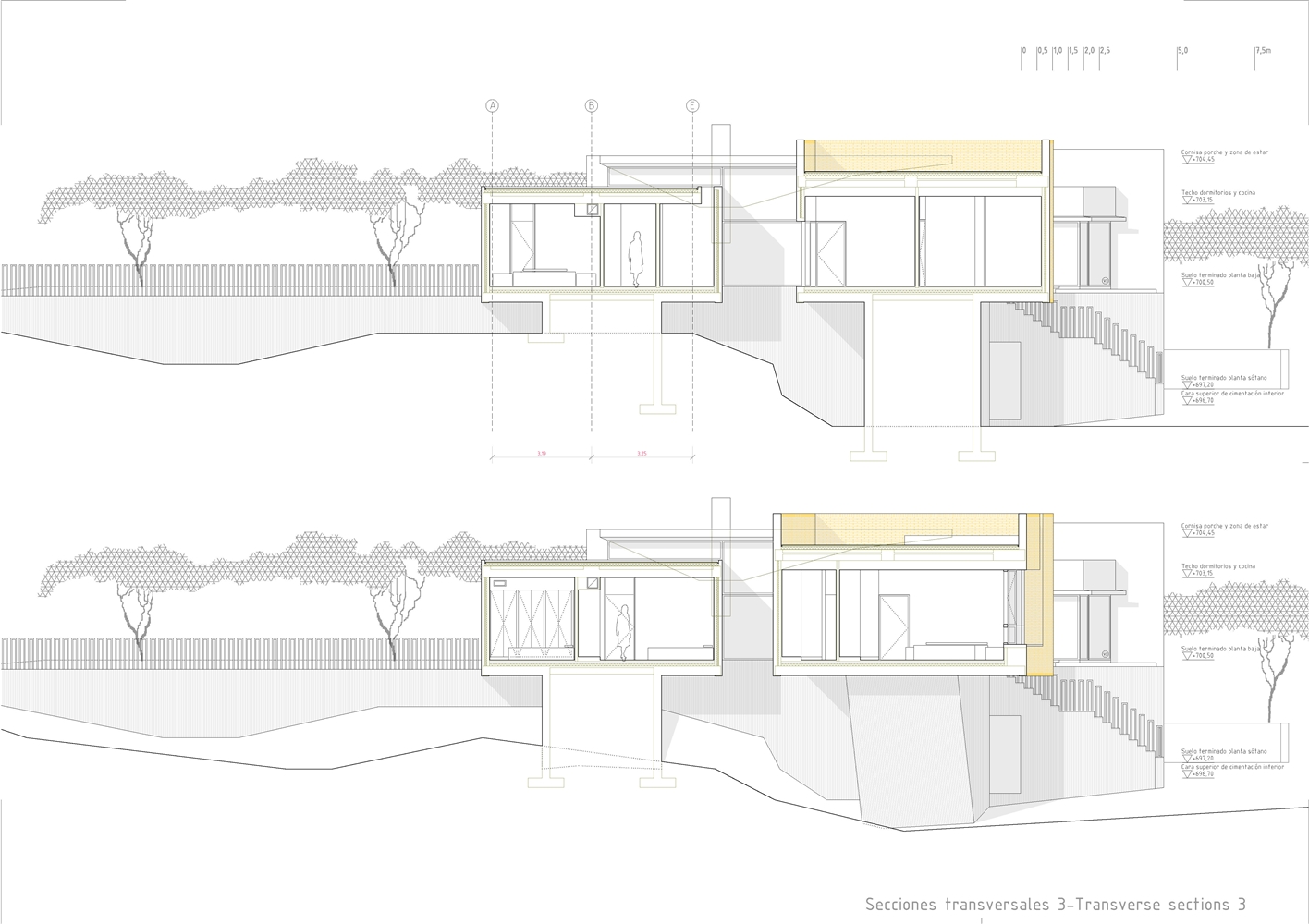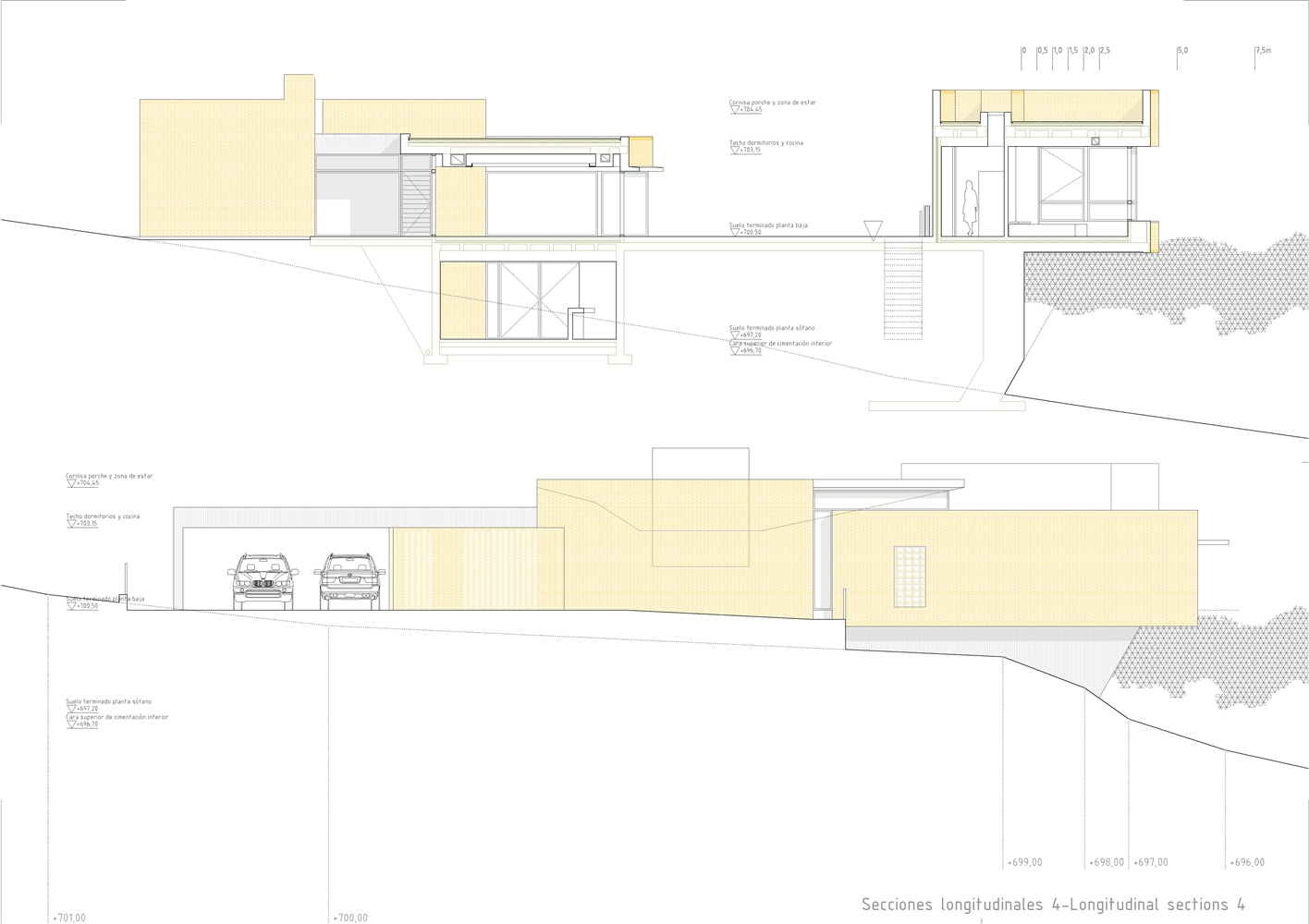 De la macla de volúmenes que conforman el proyecto se destaca la zona de estar, que ocupa la posición central del esquema, vuelca hacia el patio de sol y gira en torno a una gran chimenea colgante, que define dos ámbitos diferenciados. Rodeada de luz cenital y de un techo en forma de impluvium, la chimenea se convierte a mediodía en una gran linterna que ilumina toda esta área central. Finalmente, los dormitorios se agrupan en dos volúmenes que se despegan de la parte más baja del solar y dominan el paisaje a modo de atalayas.