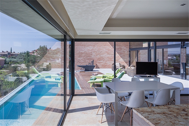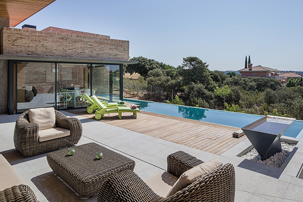 Sobre una parcela en pendiente con unas vistas privilegiadas, se pidió la construcción de una vivienda esencialmente en un solo nivel, en la que la cocina debía ser un elemento protagonista. Con estas premisas, junto con la voluntad de capturar el espacio abierto anexo hasta donde fuera posible, se organizó la casa alrededor de dos patios: uno denominado patio de sol, orientado a levante y mediodía, en el que se sitúa la piscina, y un patio de sombra, orientado a norte, de carácter más íntimo e informal; la cocina actúa como elemento de conexión y articulación, participando simultáneamente de ambos. La piscina se prolonga en forma de estanque hasta su borde mismo y la anima con un juego constante de reflejos.