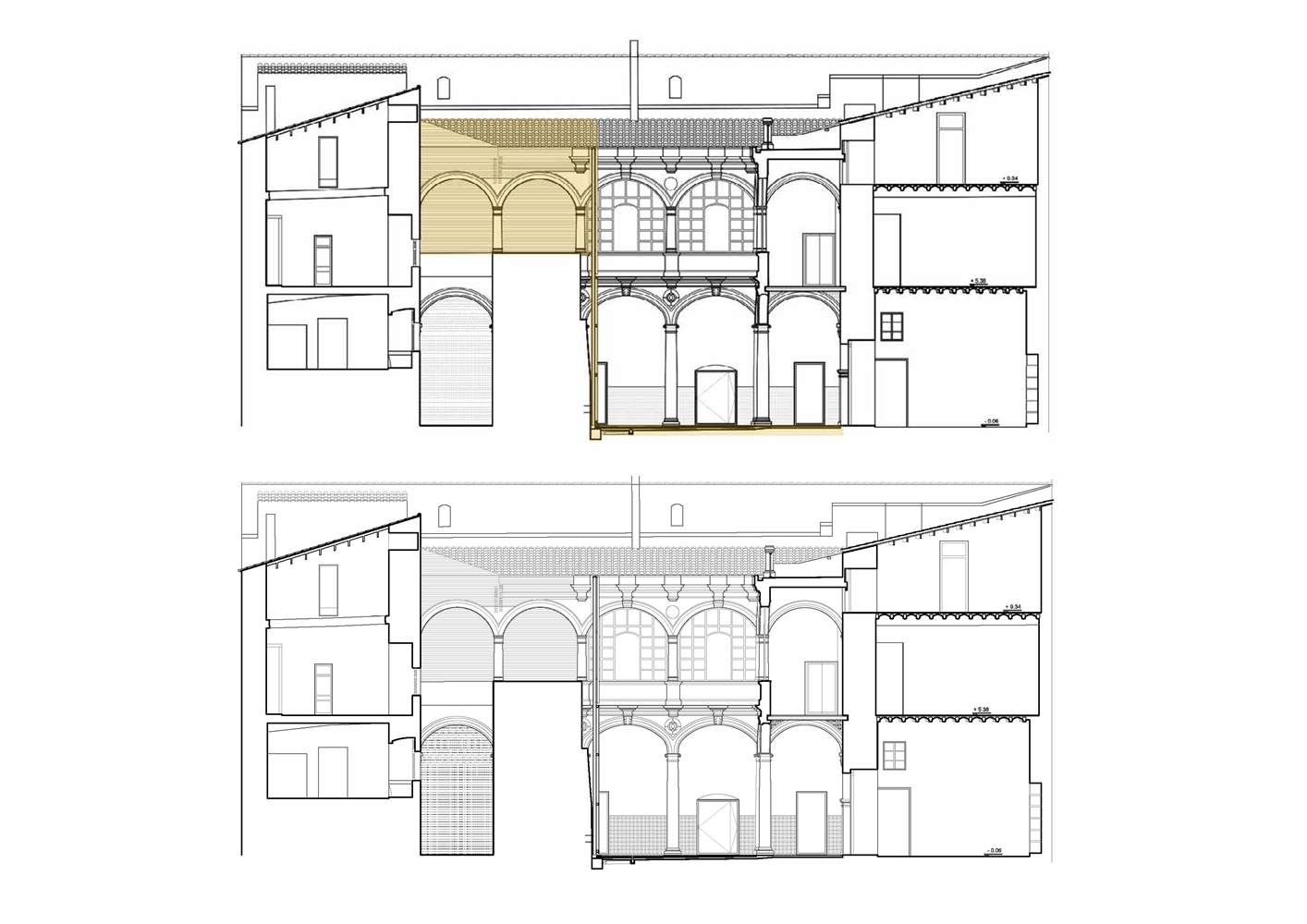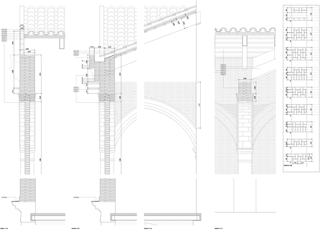 La galería superior del claustro se encontraba bastante transformada. Existía un entresuelo a nivel de los capiteles de las columnas que impedía la lectura del patio clásico. Por ello, se apostó por eliminar los elementos impropios del claustro y por finalizar aquellas zonas que ayudaban a interpretar el recorrido original del patio, reconstruyendo las enjutas y el entablamento de los arcos con el ladrillo macizo manual cara vista de barro cocido elegido y a la vez finalizar la cubierta inclinada con viguetas de madera y entrevigado cerámico.