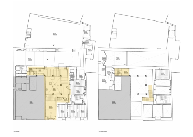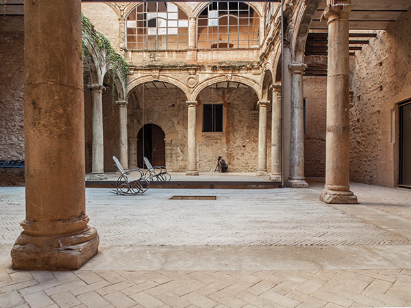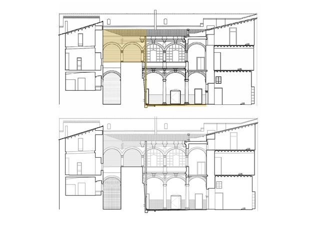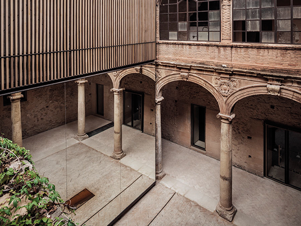 – Una solución arquitectónica que redefina nuevos espacios arquitectónicos perdidos. La medianera existente se convierte en soporte de un gran espejo que “construye virtualmente” la mitad del claustro renacentista perdido, planteando una puesta en escena descontextualizada del patio clásico.