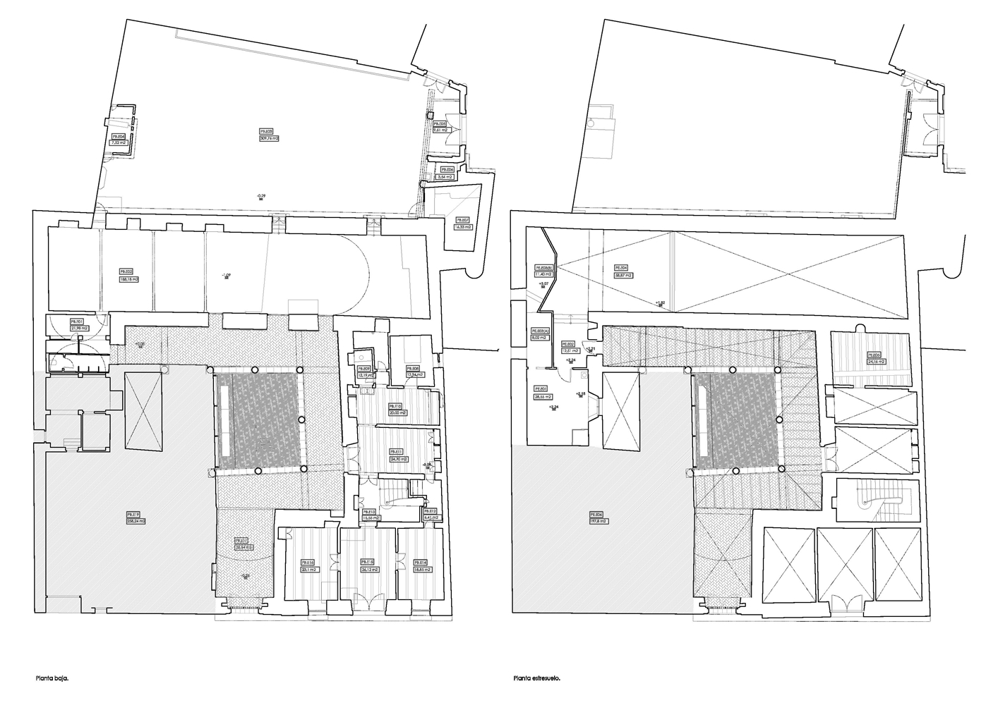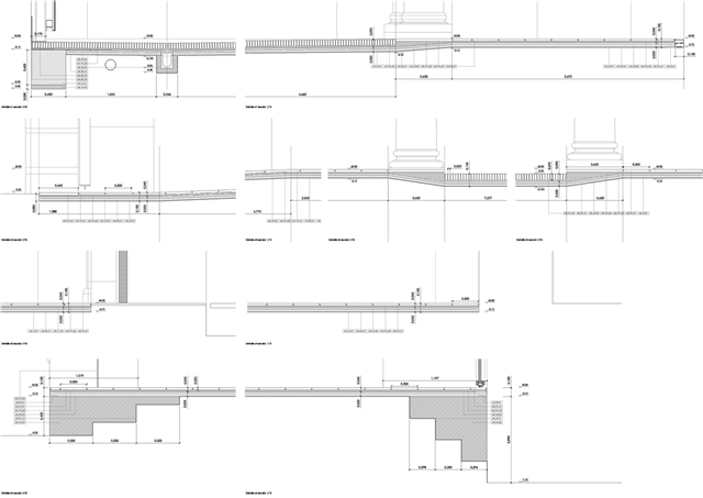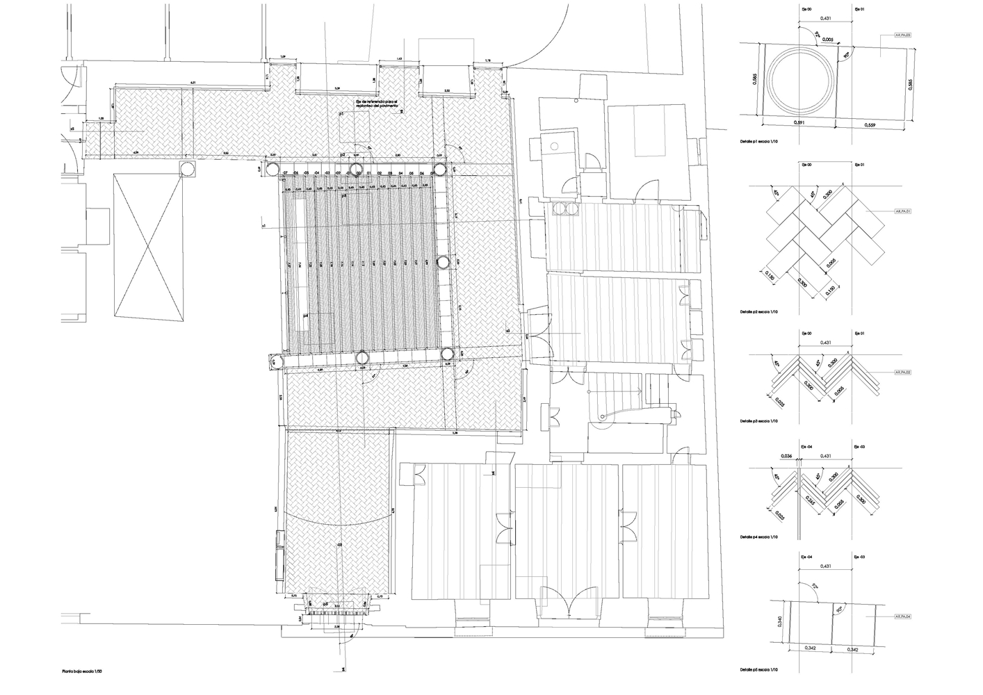 La falta de uniformidad en la planta baja del claustro se acentuaba al existir varios pavimentos, hormigón en la luna y baldosín hidráulico en las pandas del patio. Era importante homogeneizar la planta baja del claustro renacentista para devolver el carácter de espacio centralizado propio de la tipología original. Por ello, se utilizó el mismo ladrillo macizo manual cara vista de barro cocido en toda la planta baja del claustro, de manera que su colocación cambia en función del espacio que ocupa, a tabla en las pandas y el zaguán y de canto en la luna.