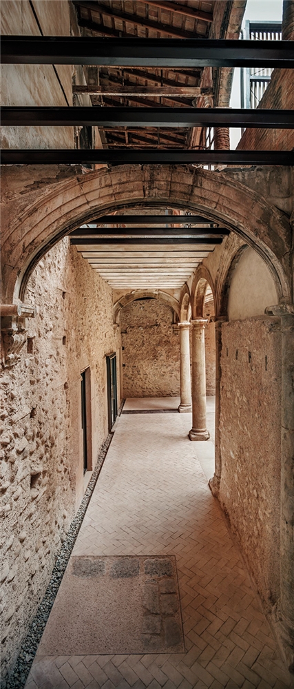 Se ha apostado por utilizar un único material como herramienta para la recuperación del claustro, consiguiendo finalizar los elementos inacabados del patio clásico y poner en valor la planta baja.