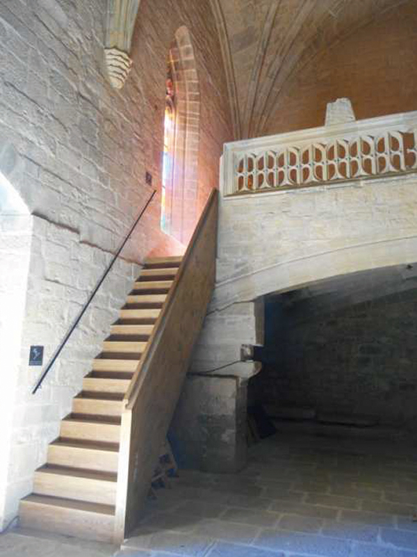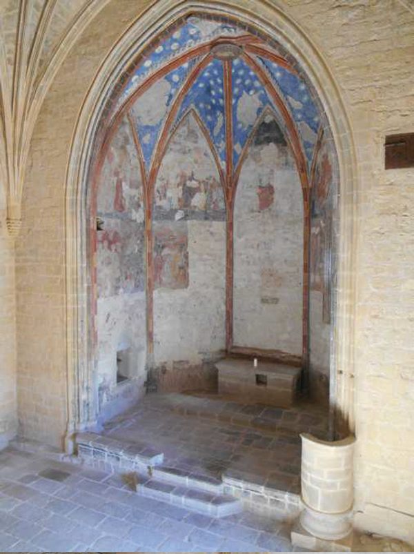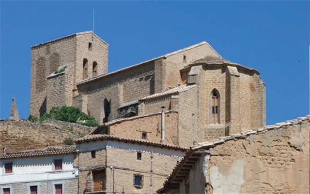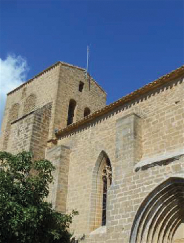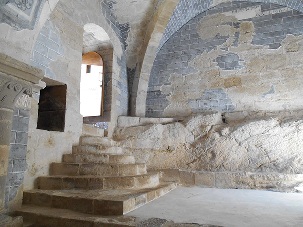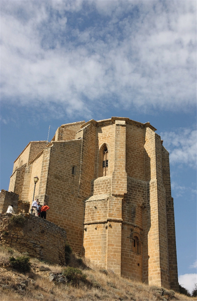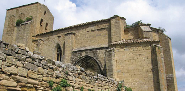 La iglesia de San Salvador de Gallipienzo es un templo de época gótica, con una nave cubierta por bóvedas est relladas y una cabecera pentagonal, más baja y estrecha que la nave, que se asienta sobre una cripta de final del románico. La cripta, a su vez, apoya directamente sobre la roca. Su construcción permitía alcanzar un nivel continuo y horizontal para el suelo en un terreno con desnivel. Así ocurrió en Gallipienzo donde la superposición de cripta y cabecera del templo mot ivó la sorprendente altura que muestra al exterior. Al interior, el ábside de la iglesia tuvo pinturas murales góticas que, en su mayor parte, fueron arrancadas y t rasladadas al Museo de Navarra en torno a 1950. Quedaron algunos restos en las partes altas de la cabecera y la huella (sinopia) de las pinturas arrancadas dispersas por los paños. La cripta en cambio conservaba pintura mural de grisalla renacentista de mitad del siglo XVI.