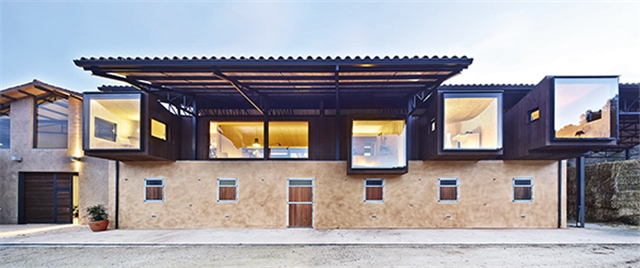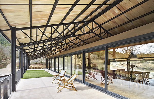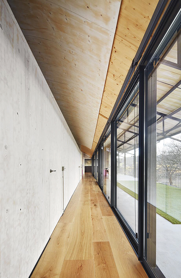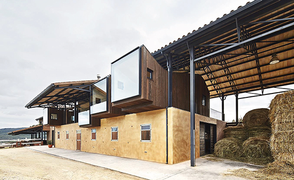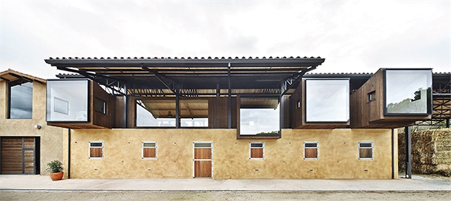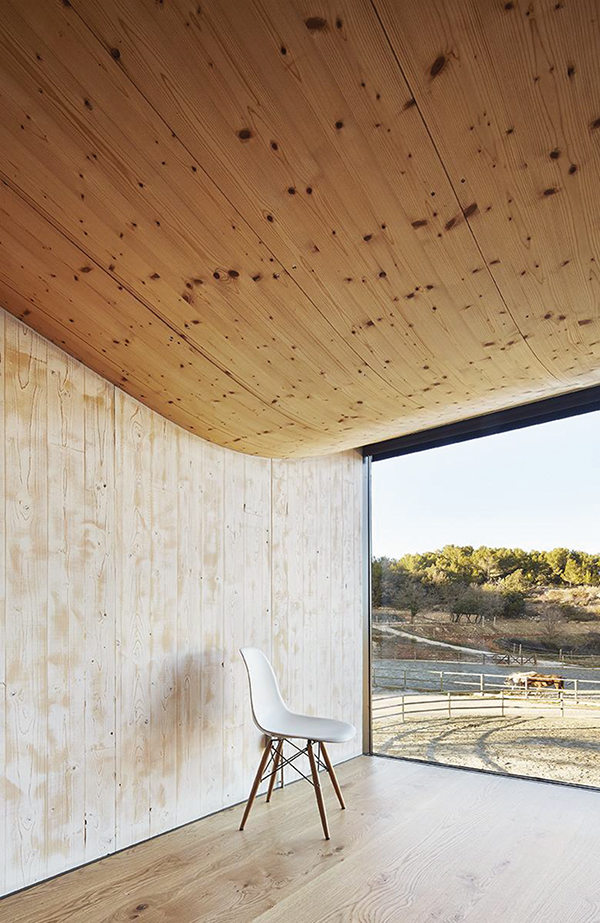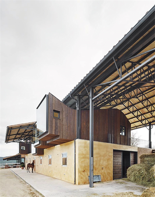 En su lado sur el conjunto aparenta un vagón bajo un hangar mientras que en el norte se caracteriza por cuatro cajones rematados con grandes ventanales hacia las vistas de la hípica, que se sitúan sobre el establo y bajo el tejado como notas en un pentagrama.