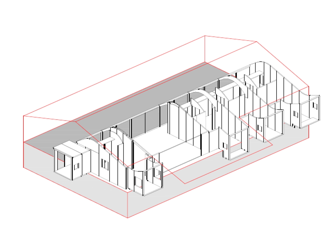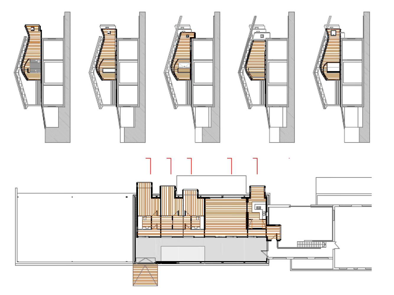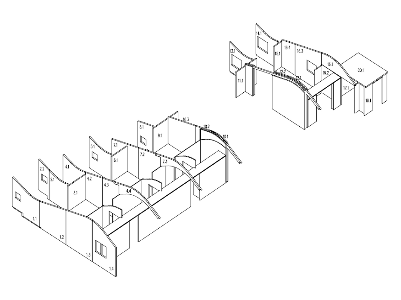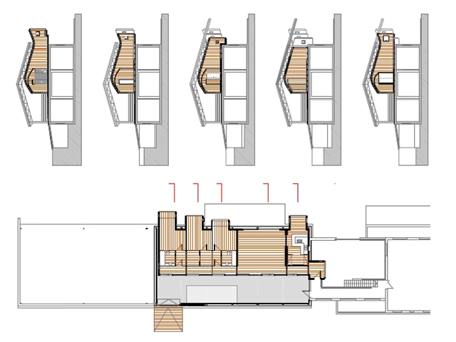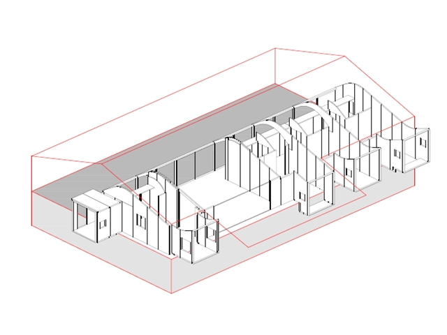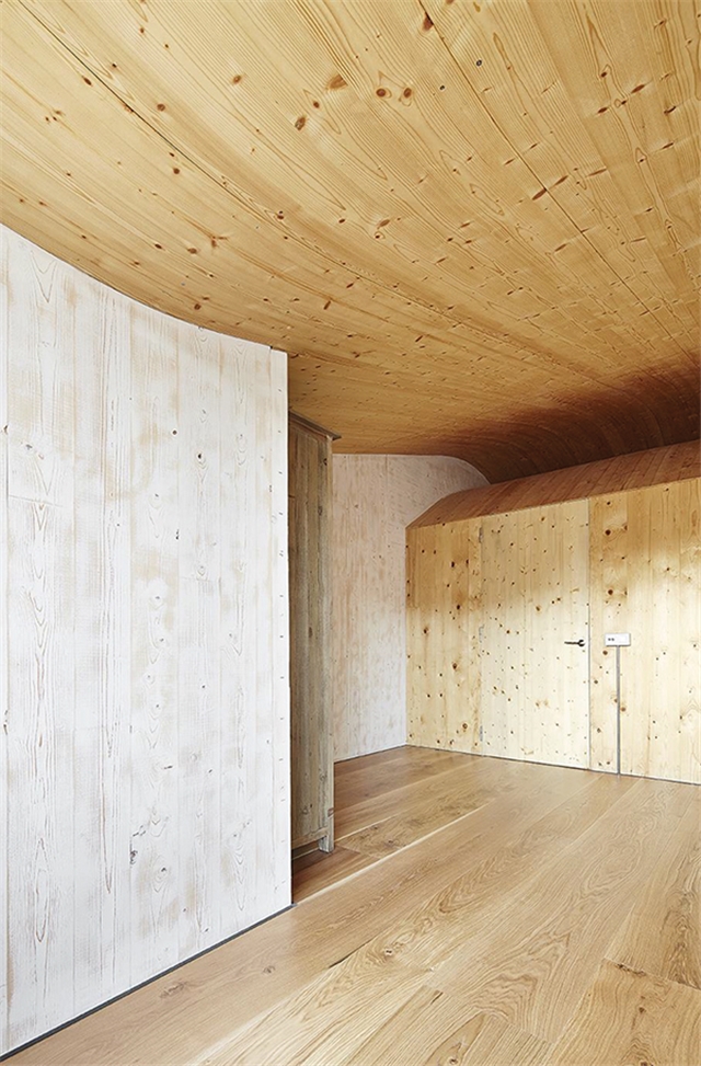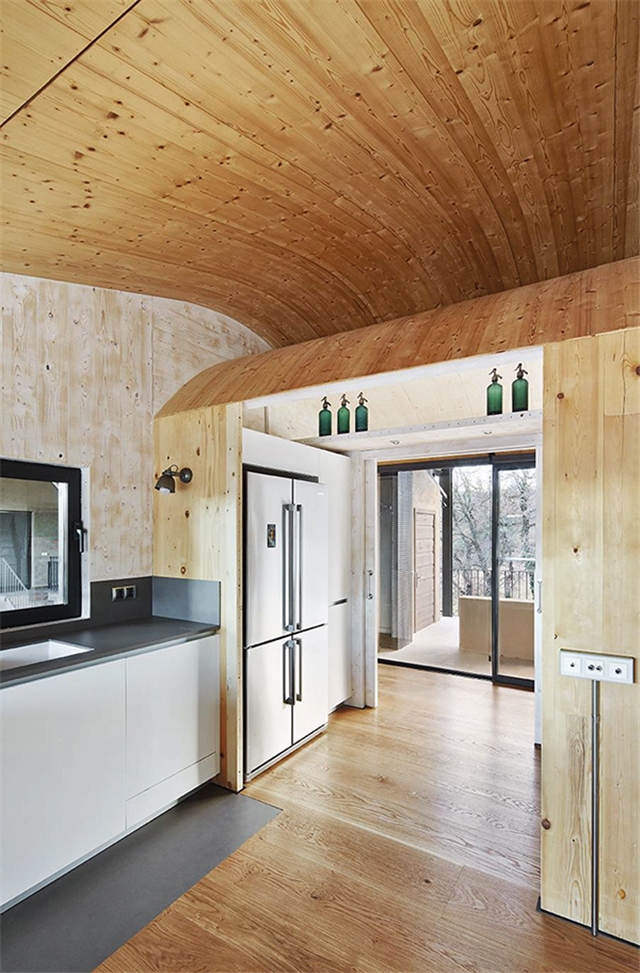 Para construir la volumetría inferior se utilizan paneles de madera contraplacada cortada mediante control numérico tanto para los tabiques y muros de carga como para la cubierta curva, cuyos contrachapados son de pequeño espesor para que se puedan curvar en obra.