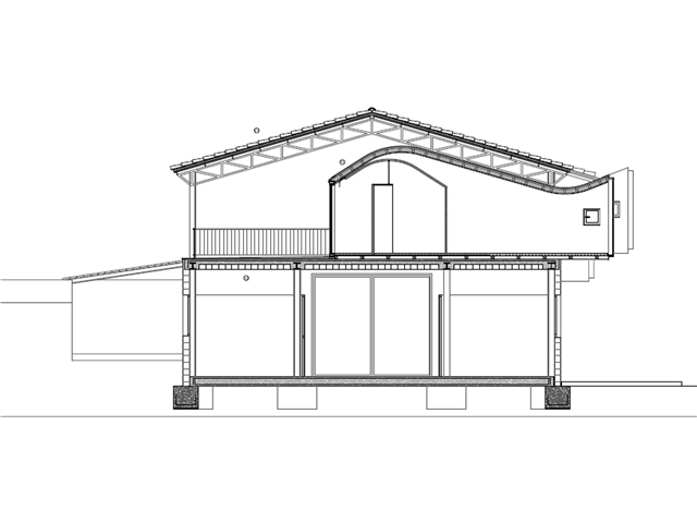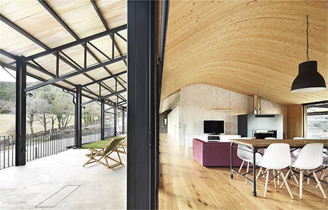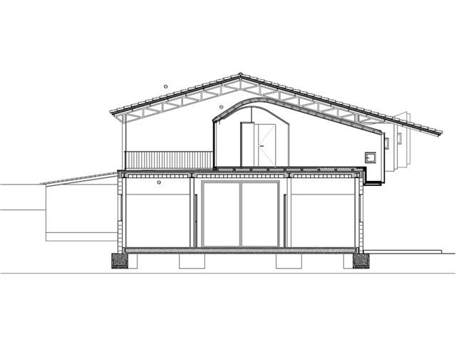 La intervención propone una gran terraza cubierta a sur bajo una de las dos pendientes del tejado mientras que bajo la otra a norte acumula todo el programa requerido. Es aquí cuando se precisa una cubierta fría ventilada que aprovecha el tejado sobre tablero cerámico como capa exterior y crea por debajo una cubierta de paneles de madera, con acabado superior de chapa fenólica, que se adapta al perfil marcado por las cerchas metálicas mediante una doble curva cóncava convexa.