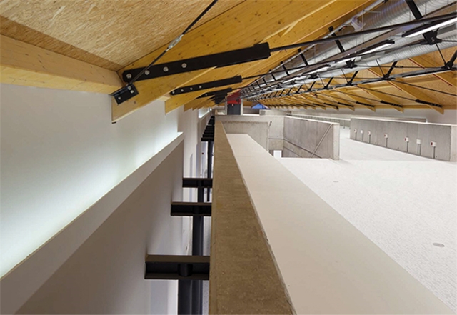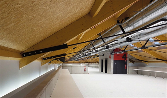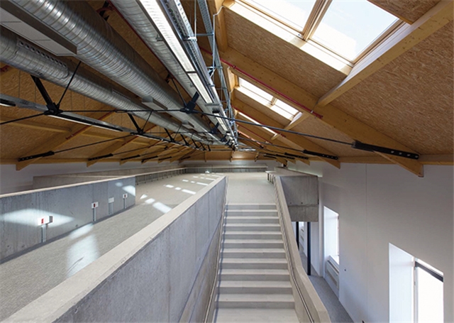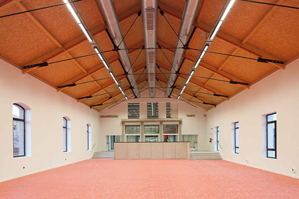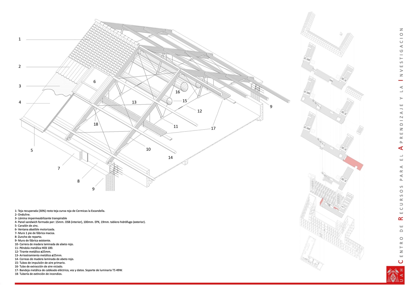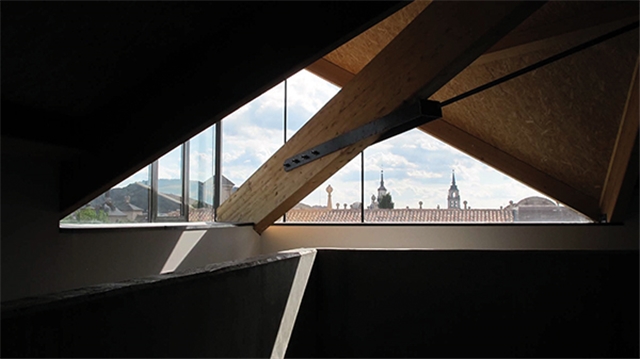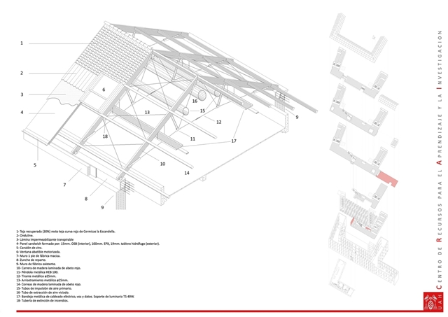 La cubierta recupera la vertiente a dos aguas original. Se ha reconstruido mediante un sistema de cerchas de 14 metros de luz que combinan madera laminada y estructura metálica. El forjado de cubierta se forma con un panel sándwich aislado y acabado interiormente en OSB. El acabado exterior cerámico combina parte de la teja original recuperada de la demolición, utilizada como cobija, con teja curva roja nueva utilizada como canal.