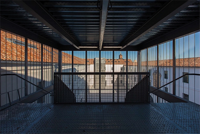 La actuación ha consistido en la colocación interior de una estructura de pilares y forjados de hormigón visto, más una estructura ligera de cubierta, a las que se han adosado los sistemas de instalaciones. Un núcleo de ascensores y una escalera longitudinal que recorre de forma lineal el edificio son los únicos elementos que atraviesan y unen los distintos niveles. La inclusión de algunos patios contrapeados permite una visión diagonal y lineal unitaria del edificio desde distintos ángulos, buscando la percepción del espacio militar original, sobrio y repetitivo, pero muy transformado por el paso del tiempo y de las sucesivas intervenciones.
