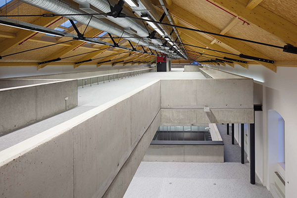 El tratamiento de la envolvente se ha limitado a la limpieza de las fachadas originales y al cambio de las carpinterías. Constructivamente se ha adoptado por una solución donde no hay apenas diferencias entre estructura y acabados, dejando a la vista todas las instalaciones.