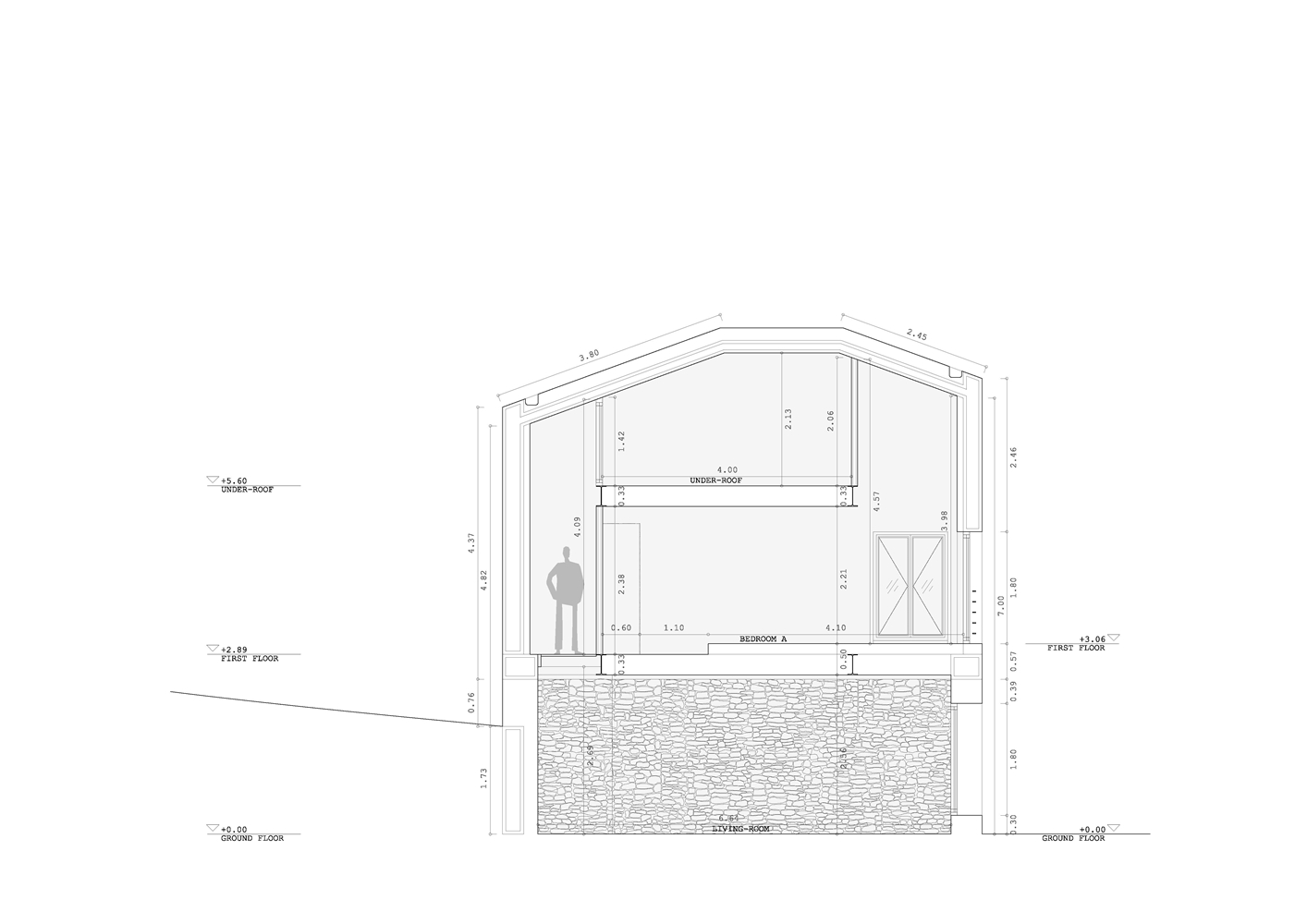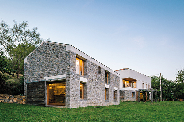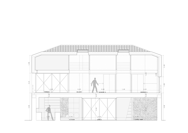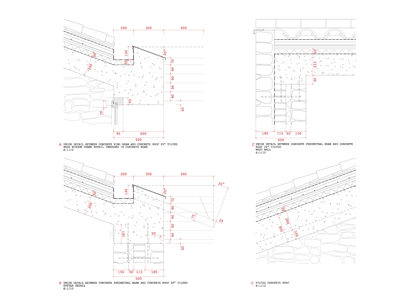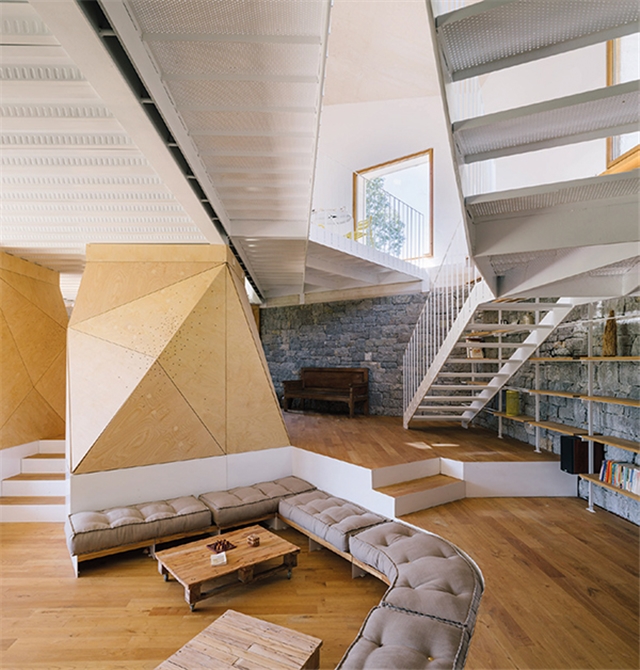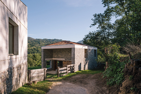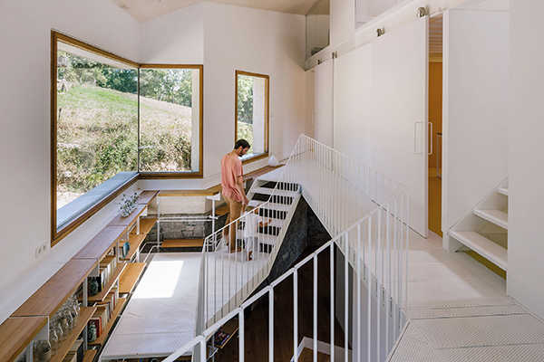 De esta manera se libera un espacio en triple altura en la zona norte de la vivienda que permite la entrada de luz y el despliegue de una escalera metálica que da acceso a las distintas estancias de la casa. En el caso del Pajar se consolidan los muros existentes de mampostería y se introduce una viga perimetral en planta primera que además de atar los muros, resuelve el apoyo de los forjados de chapa colaborante y los dinteles de las aperturas del muro. A su vez, la cubierta realizada en hormigón blanco se apoya sobre los muros de mampostería mediante otra viga perimetral que corona el conjunto de la construcción.