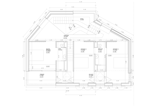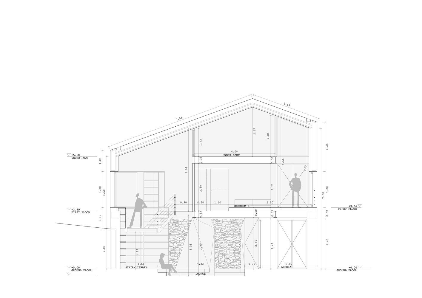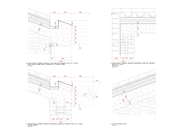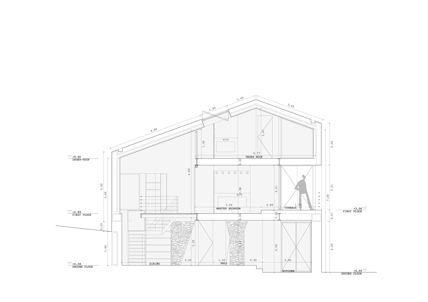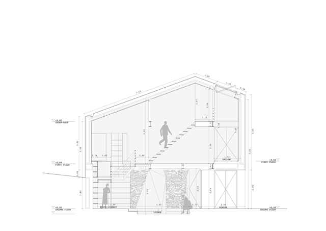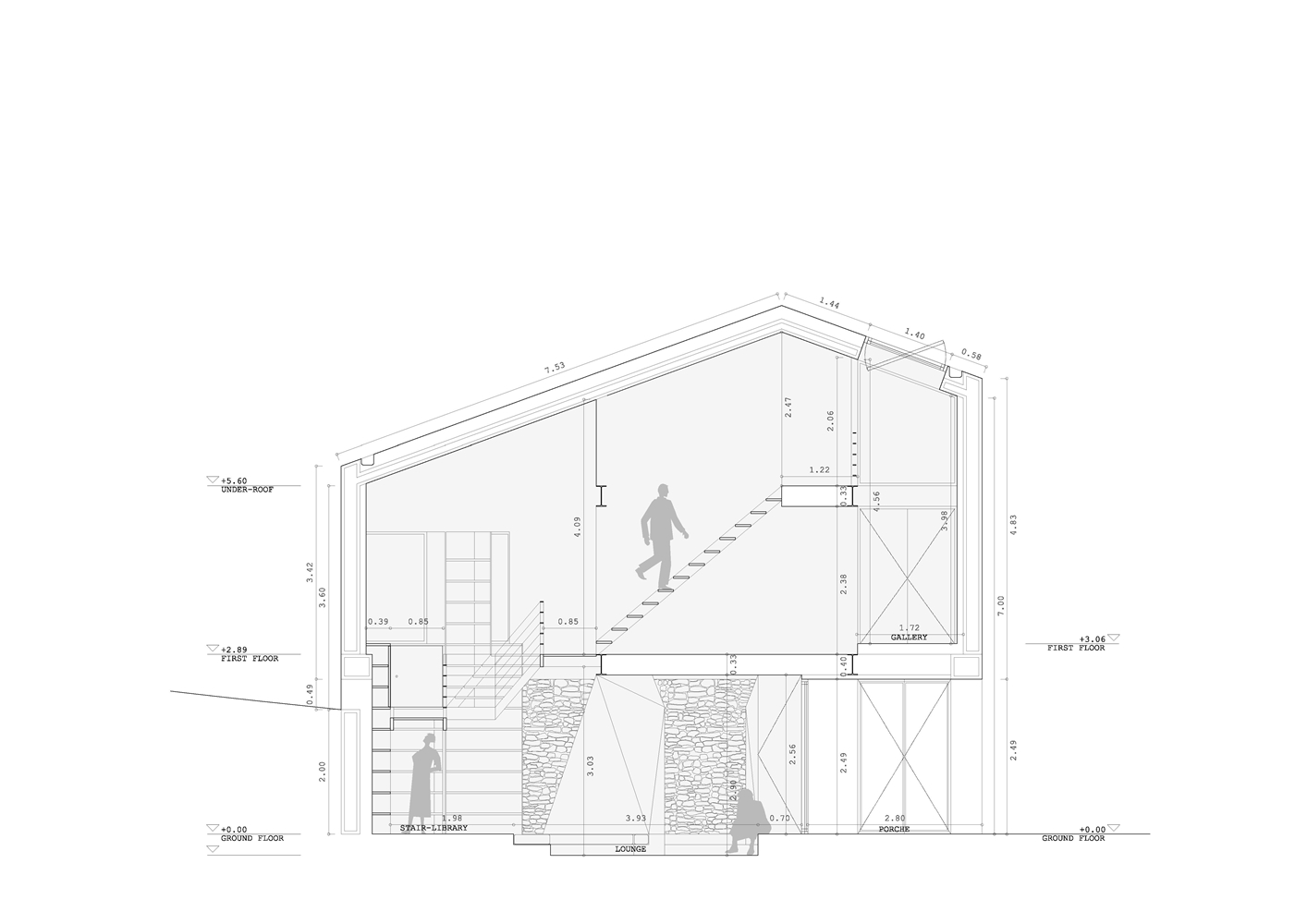 De esta manera se libera un espacio en triple altura en la zona norte de la vivienda que permite la entrada de luz y el despliegue de una escalera metálica que da acceso a las distintas estancias de la casa. En el caso del Pajar se consolidan los muros existentes de mampostería y se introduce una viga perimetral en planta primera que además de atar los muros, resuelve el apoyo de los forjados de chapa colaborante y los dinteles de las aperturas del muro. A su vez, la cubierta realizada en hormigón blanco se apoya sobre los muros de mampostería mediante otra viga perimetral que corona el conjunto de la construcción.