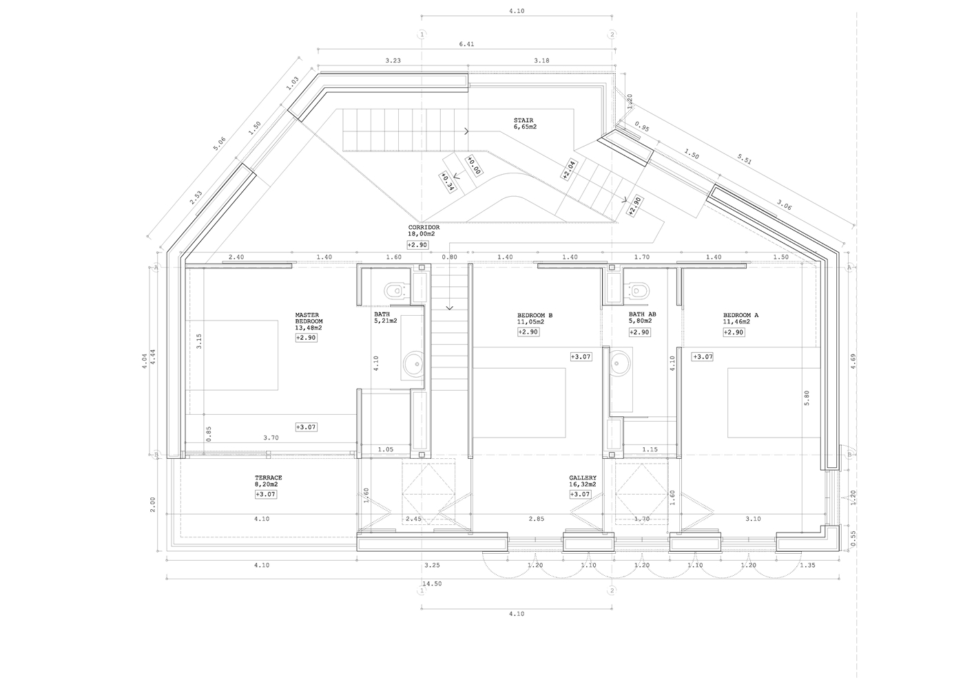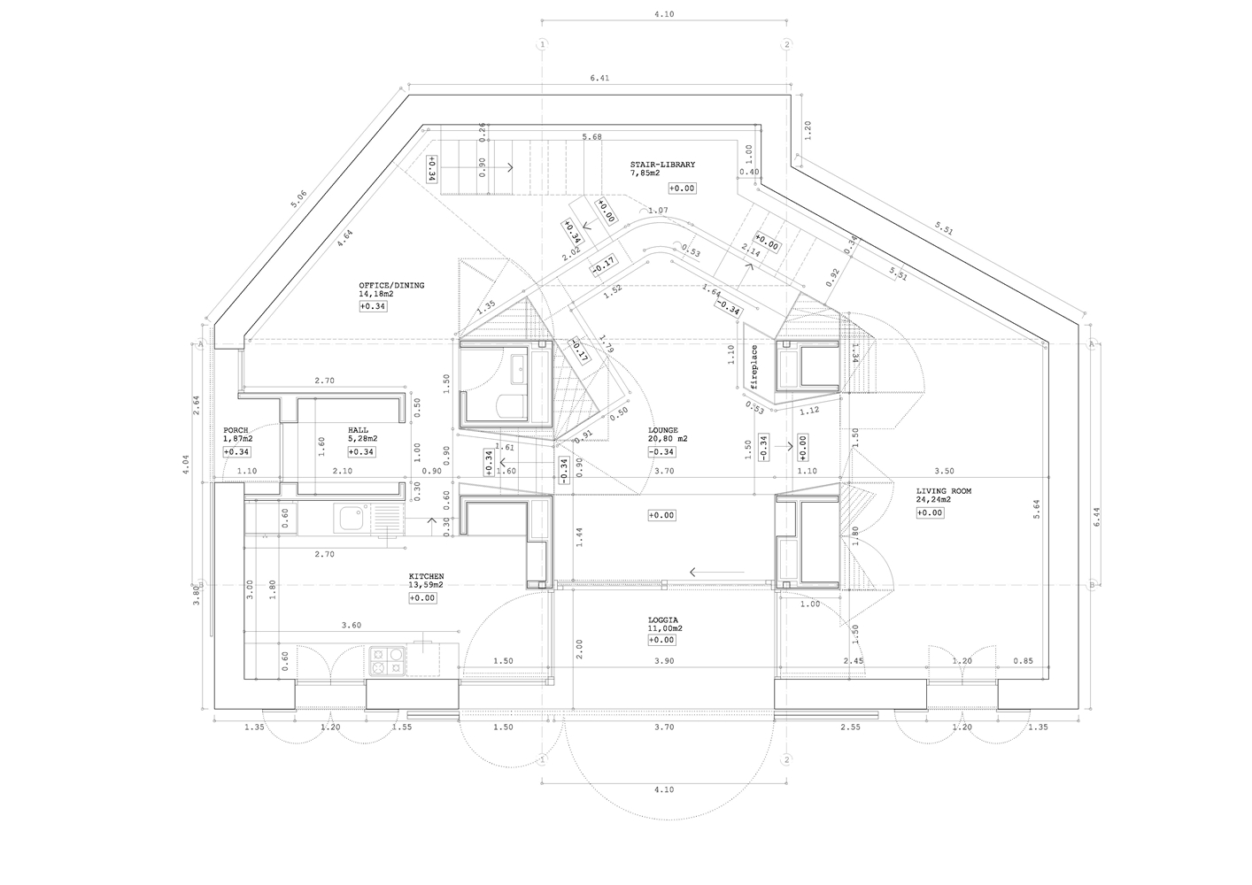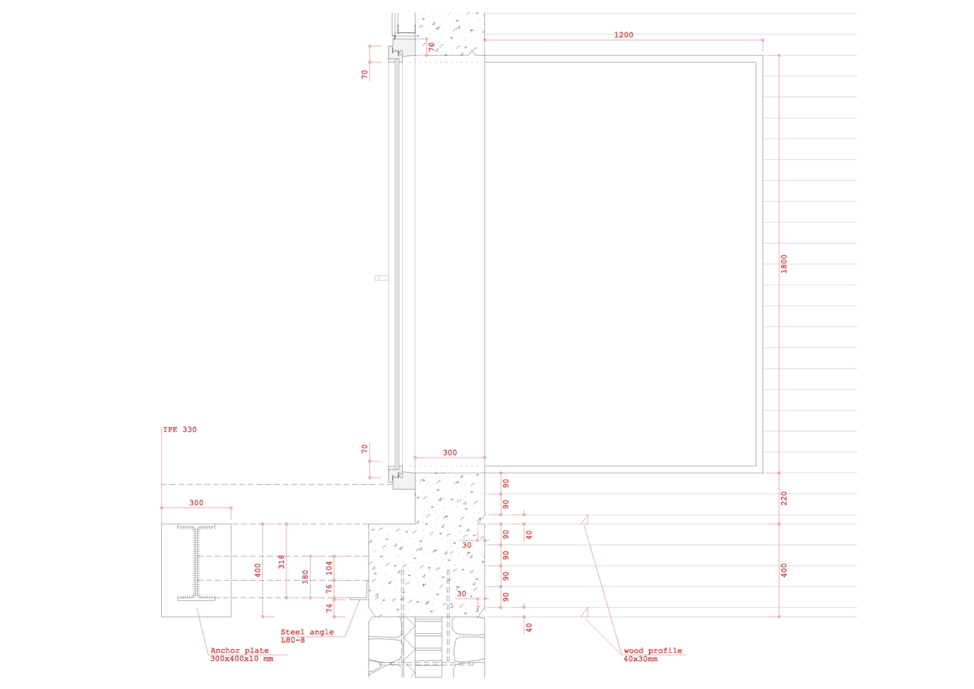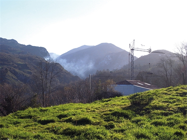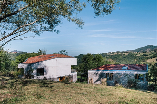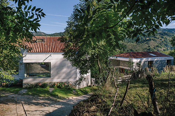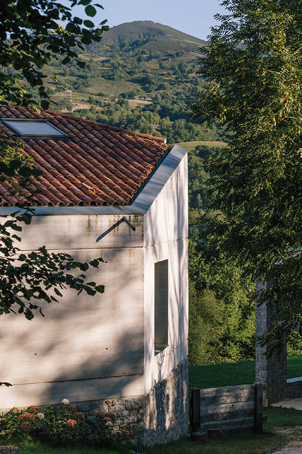 El caparazón de hormigón se recorta en distintos puntos para acoger los elementos característicos de la vivienda pre-existente: balcón en esquina, huecos que iluminan una galería a doble altura orientada a sur, y aperturas a norte. Se propone así una re-lectura de la construcción tradicional de la casona asturiana compuesta por muros de mampostería en planta baja y enfoscado blanco en planta primera. Además, la construcción de la envolvente de hormigón apoyada sobre los muros de mampostería permite liberar grandes luces en planta baja y configurar así otro de los espacios característicos de la tipología asturiana: el porche. Una vez definida la envolvente, el espacio interior de la vivienda se materializa mediante una estructura metálica ligera que se adosa o separa de esta en función de las necesidades de luz y accesibilidad.