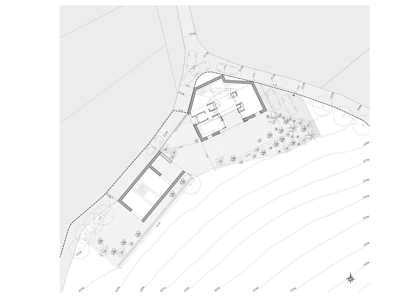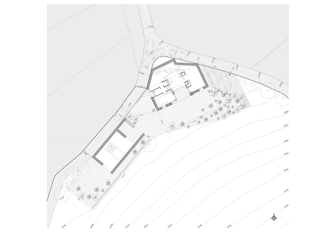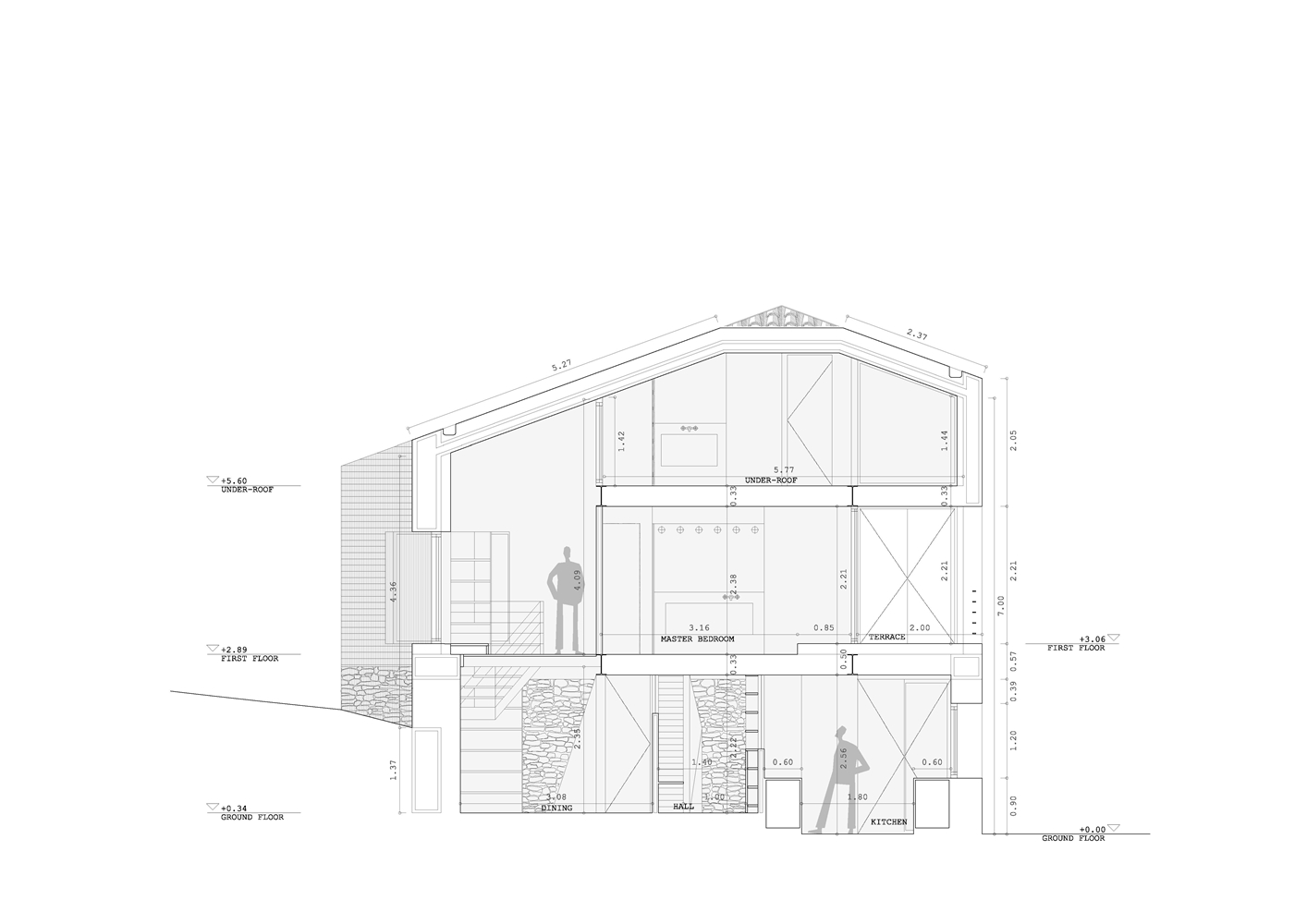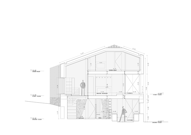 El proyecto consiste en la rehabilitación y ampliación de una casa rural (CASA TMOLO) y de un corral con pajar adyacente (EL PAJAR). La intervención propuesta para la Casa Tmolo da respuesta a varios condicionantes: unificar en un solo volumen las estructuras agregadas a la construcción principal (autoconstrucción de poco calidad), resolver el cambio de rasante hacía el sureste y la obligación de usar ciertos materiales (lo que no implica, sin embargo, una forma determinada de construir). La respuesta estructural conserva y consolida los muros de mampostería existentes manteniendo su función portante para acoger encima un caparazón de hormigón blanco, que define los muros de la primera planta, bajo-cubierta y cubierta.