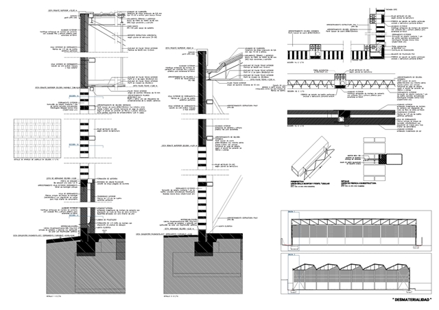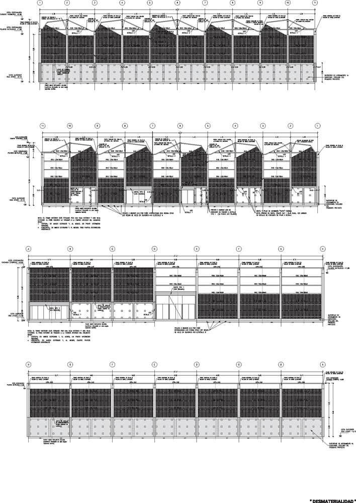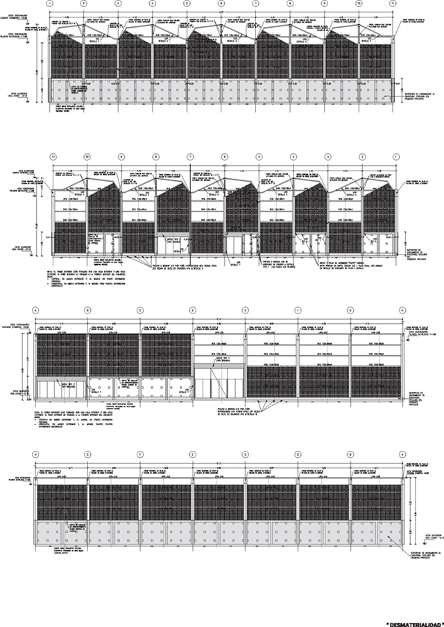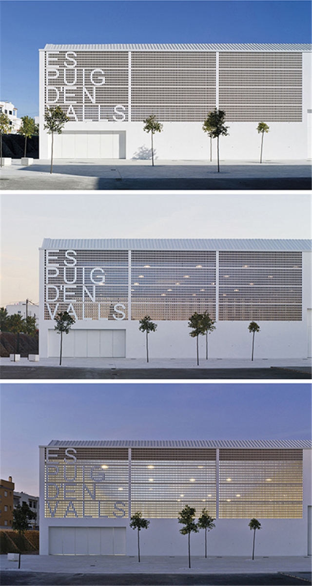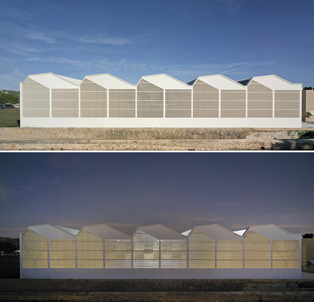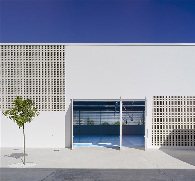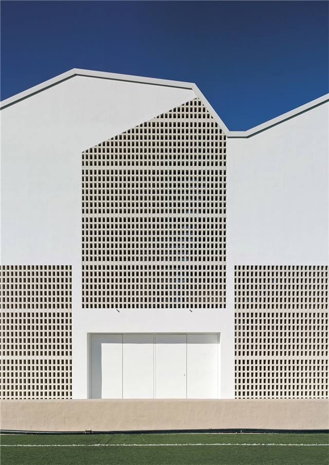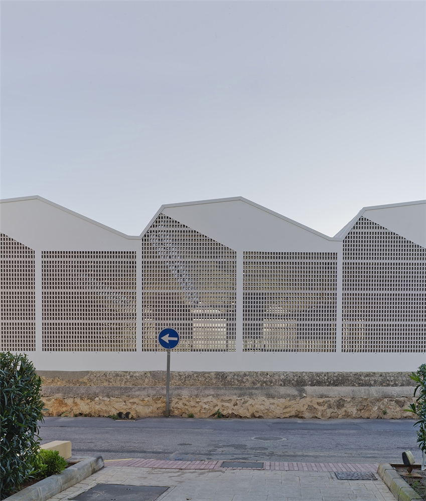 Para definir esta relación en permanente cambio entre interior y exterior trabajamos con los seis paramentos de los que se compone la edificación: el suelo, que introduce un color azul tan presente en el paisaje balear; el techo, de chapa de aluminio ondulada con capacidad reflexiva para desarrollar una función de fusión de todos los elementos del conjunto; y los cuatro paramentos verticales, materializados mediante la combinación de paños ciegos y paños en celosía de fábrica de 1 pie de ladrillo blanco caravista con una permeabilidad suficiente para permitir la superposición compositiva de dos fachadas enfrentadas y la introducción de los colores del entorno como parte de la composición de cada una de ellas. En la fachada oeste, los paños de celosía se alinean según la línea horizontal marcada por el torrente contiguo a la edificación; la fachada este rompe esta linealidad para permitir incorporar al conjunto las líneas quebradas del horizonte montañoso; la fachada sur, en la que se dispone el acceso principal, incorpora un paño de celosía en permanente cambio cromático como elemento más representativo del conjunto.