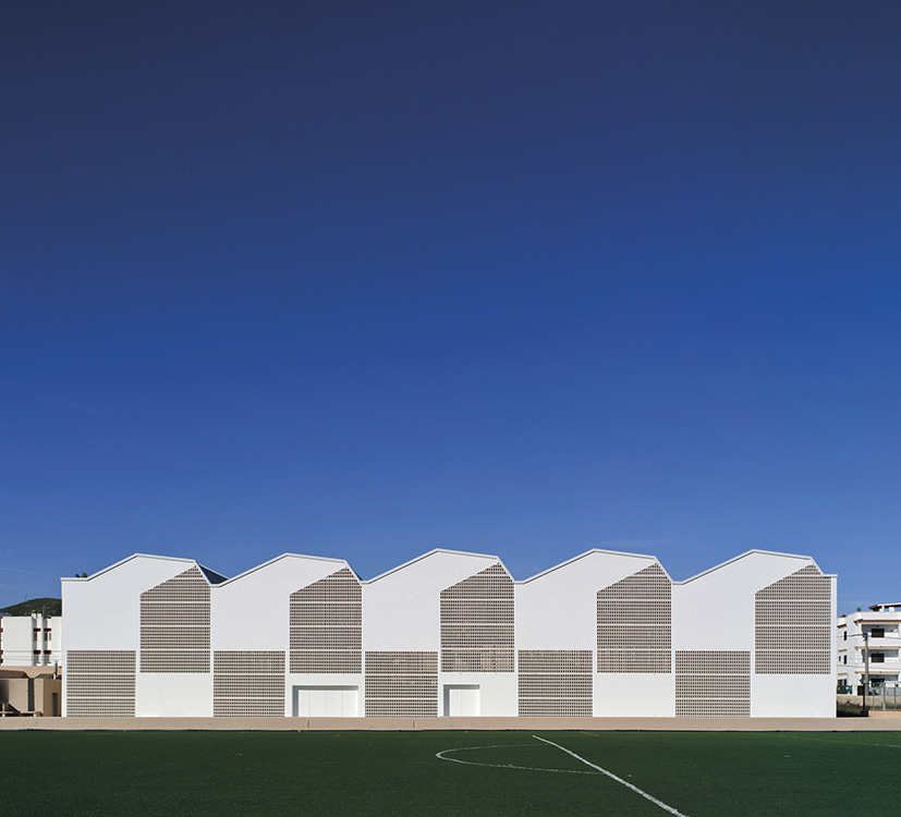 Cuando recibimos el encargo del diseño de su cerramiento durante la ejecución de la primera fase, nuestro principal objeto de proyecto fue la búsqueda de un elemento de fusión entre el espacio interior y el entorno en el que se sitúa, de modo que no se perdiese la esencia de la práctica deportiva en un espacio exterior que los equipos de Es Puig den Valls habían desarrollado en ese lugar durante años.