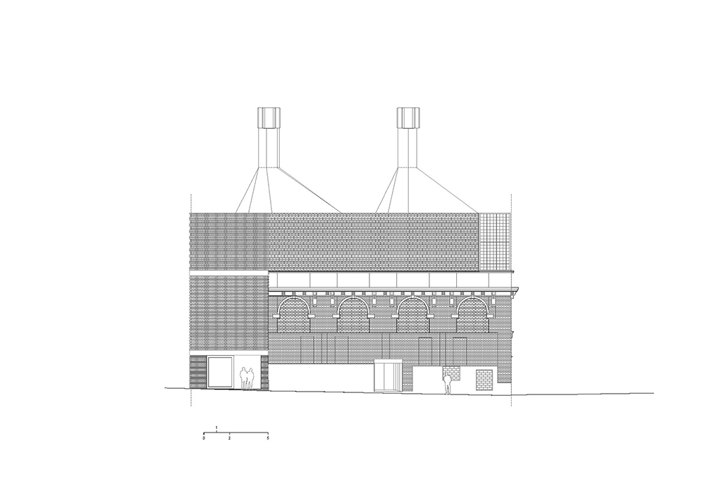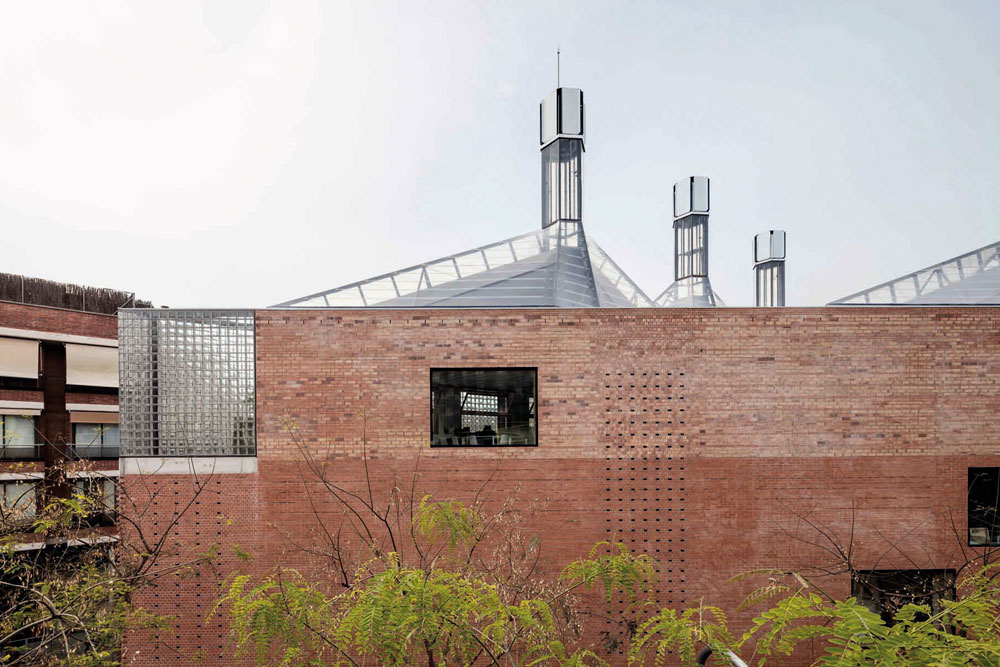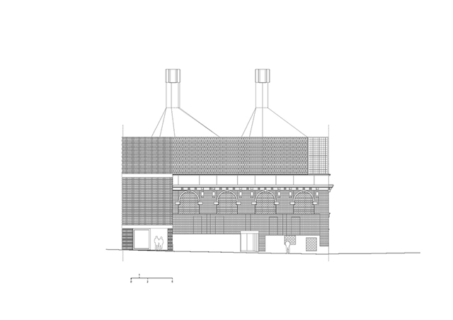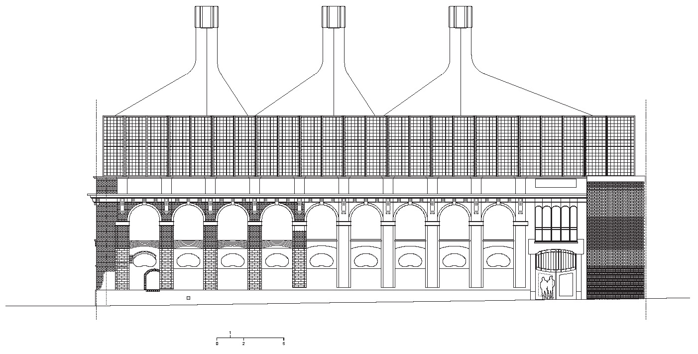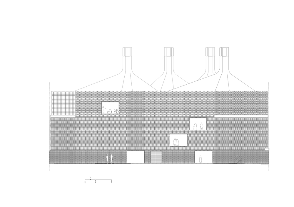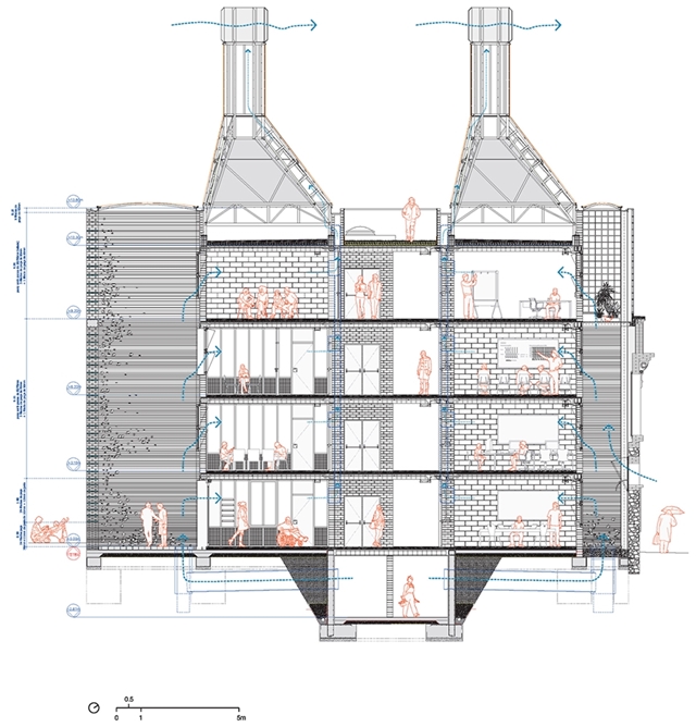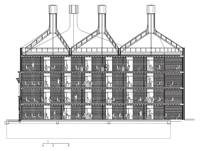 La sección del edificio explica su comportamiento: el control y la gestión del aire en condiciones naturales. En invierno es necesario controlar las pérdidas por renovación, amortizar la alta carga interna acumulada en la inercia de una estructura muraria y captar el aire limpio desde el patio que actúa como recuperador natural. En verano se trata de disipar moviendo el máximo volumen de aire posible y capturar el aire desde los patios vegetados y sombríos. Los motores del movimiento de este aire serán estrictamente naturales a partir del uso de chimeneas solares y sombreros con efecto venturi. La ventilación cruzada entre patios queda descartada por programa y para evitar conflictos acústicos, por tanto el edificio dota cada franja de espacios de uso con una larga interrupción estructural por donde el aire circulará en vertical “estirado” por la potencia del sol en las chimeneas, que a la vez dotarán el edificio de una silueta y una materialidad transparente y característica.