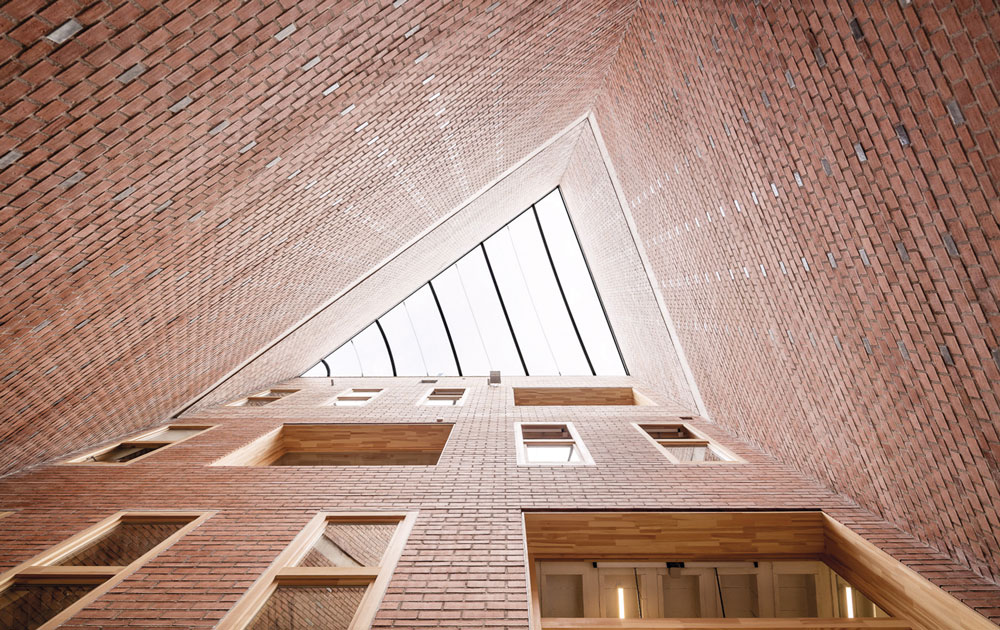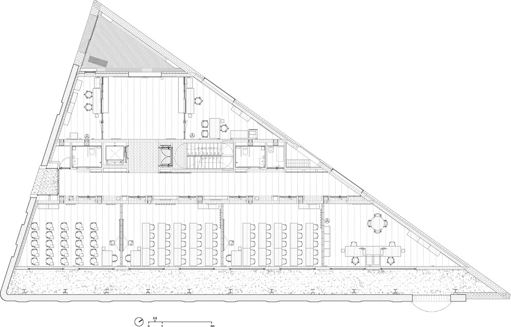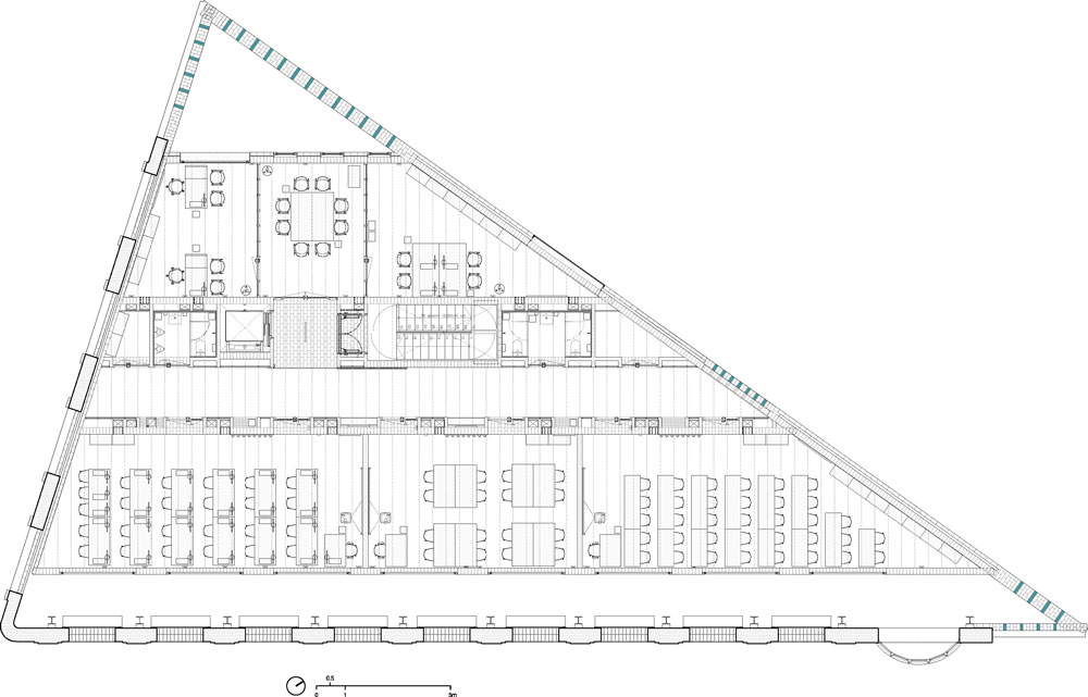 El edificio, como pieza urbana, aprovecha la parcela en su totalidad, pero la forma triangular y las fachadas catalogadas impiden una ocupación completa del solar. El edificio reparte el programa en cuatro plantas que se retiran de la fachada patrimonial Sur, el patio cubierto resultante permite compatibilizar edificación y patrimonio mejorando las condiciones de luz natural de los espacios de aulas a la vez que aporta un cojín térmico y acústico respecto al entorno. Este patio largo y estrecho formado por la fachada patrimonial y la nueva fachada estructural, se reproduce en el vértice Norte como sistema de relación con el exterior de los usos administrativos del edificio, agotando la geometría triangular.