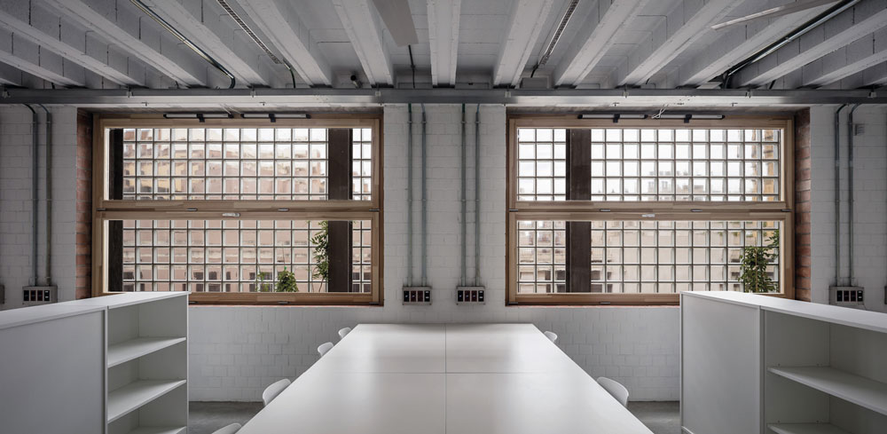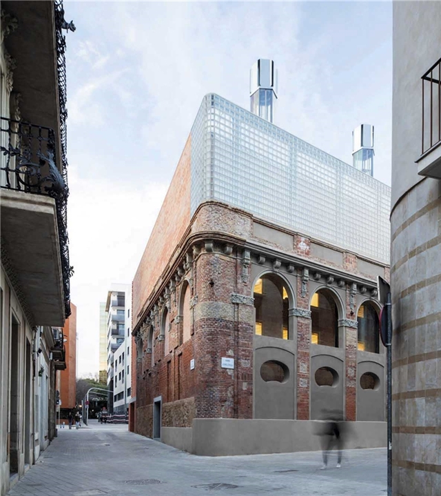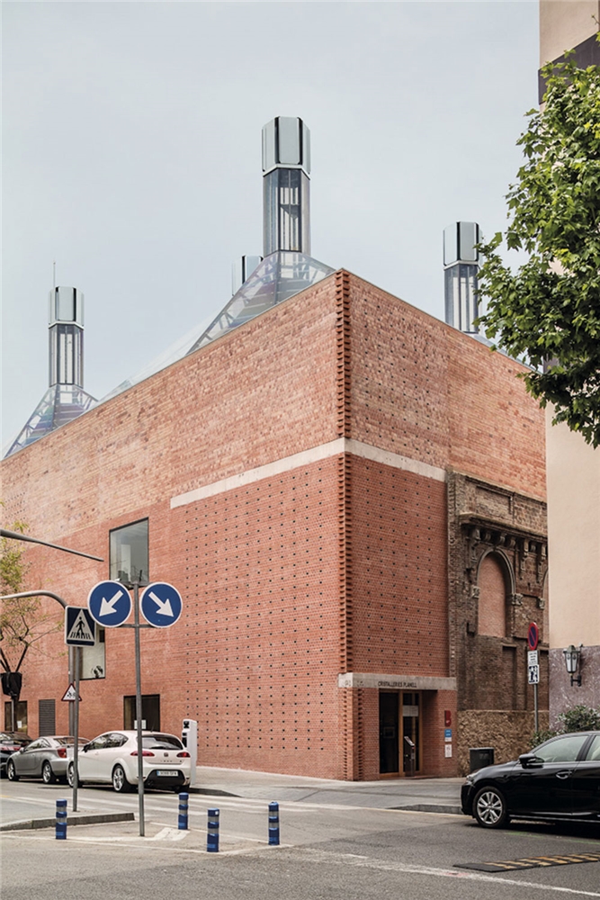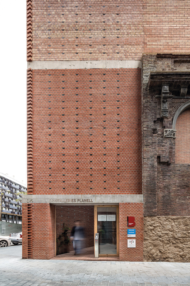 El volumen resultante responde a la estricta geometría triangular del solar, por su potencia y por su función urbana. Su materialidad cerámica responde a la voluntad de poner en valor la fachada patrimonial integrándola y no singularizándola, usándola y no sacralizándola, por tanto ponemos prácticamente en el mismo plano lo nuevo y lo viejo con materiales y técnicas similares y asumiendo en los dos casos obligaciones de cerramiento, de captación, de ventilación de cámaras y patios. La materialidad se compone a partir de razones estructurales y se complementa para mejorar las condiciones de luz de los patios y dotar la fachada de un material vinculado a la memoria de la cristalería Planell. Se ha introducido el bloque de vidrio macizo como parte del cerramiento murario que permite introducir luz al patio norte y captación al patio sur.